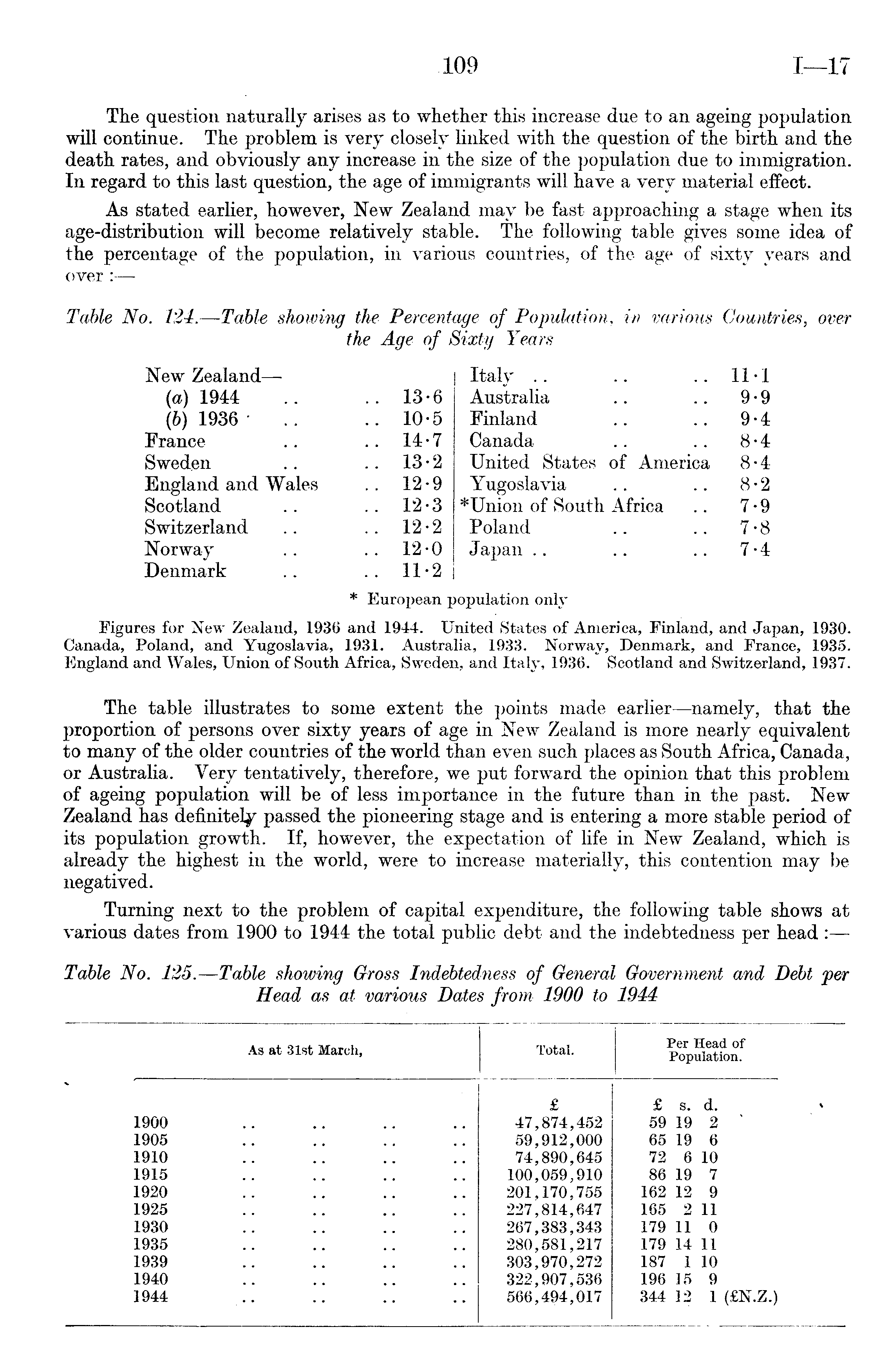 The question naturally arises as to whether this increase due to an ageing population will continue. The problem is very closely linked with the question of the birth and the death rates, and obviously any increase in the size of the population due to immigration. In regard to this last question, the age of immigrants will have a very material effect. As stated earlier, however, New Zealand may be fast approaching a stage when its age-distribution will become relatively stable. The following table gives some idea of the percentage of the population, in various countries, of the age of sixty years and over : Table No. 124. —Table showing the Percentage of Population, in various Countries, over the Age of Sixty Years New Zealand— Italy .. .. .. 11-1 (a) 1944 .. .. 13-6 Australia .. .. 9-9 (b) 1936' .. .. 10-5 Finland .. .. 9-4 France .. .. 14-7 Canada .. .. 8-4 Sweden .. .. 13-2 United States of America B*4 England and Wales .. 12-9 Yugoslavia .. .. 8-2 Scotland .. .. 12-3 *Union of South Africa .. 7-9 Switzerland .. .. 12-2 Poland .. .. 7-8 Norway .. .. 12-0 Japan .. .. .. 7-4 Denmark .. .. 11-2 * European population only Figures for New Zealand, 1936 and 1944. United States of America, Finland, and Japan, 1930. Canada, Poland, and Yugoslavia, 1931. Australia, 1933. Norway, Denmark, and France, 1935. England and Wales, Union of South Africa, Sweden, and Italy, 1936. Scotland and Switzerland, 1937. The table illustrates to some extent the points made earlier —namely, that the proportion of persons over sixty years of age in New Zealand is more nearly equivalent to many of the older countries of the world than even such places as South Africa, Canada, or Australia. Yery tentatively, therefore, we put forward the opinion that this problem of ageing population will be of less importance in the future than in the past. New Zealand has definitely passed the pioneering stage and is entering a more stable period of its population growth. If, however, the expectation of life in New Zealand, which is already the highest in the world, were to increase materially, this contention may be negatived. Turning next to the problem of capital expenditure, the following table shows at various dates from 1900 to 1944 the total public debt and the indebtedness per head :