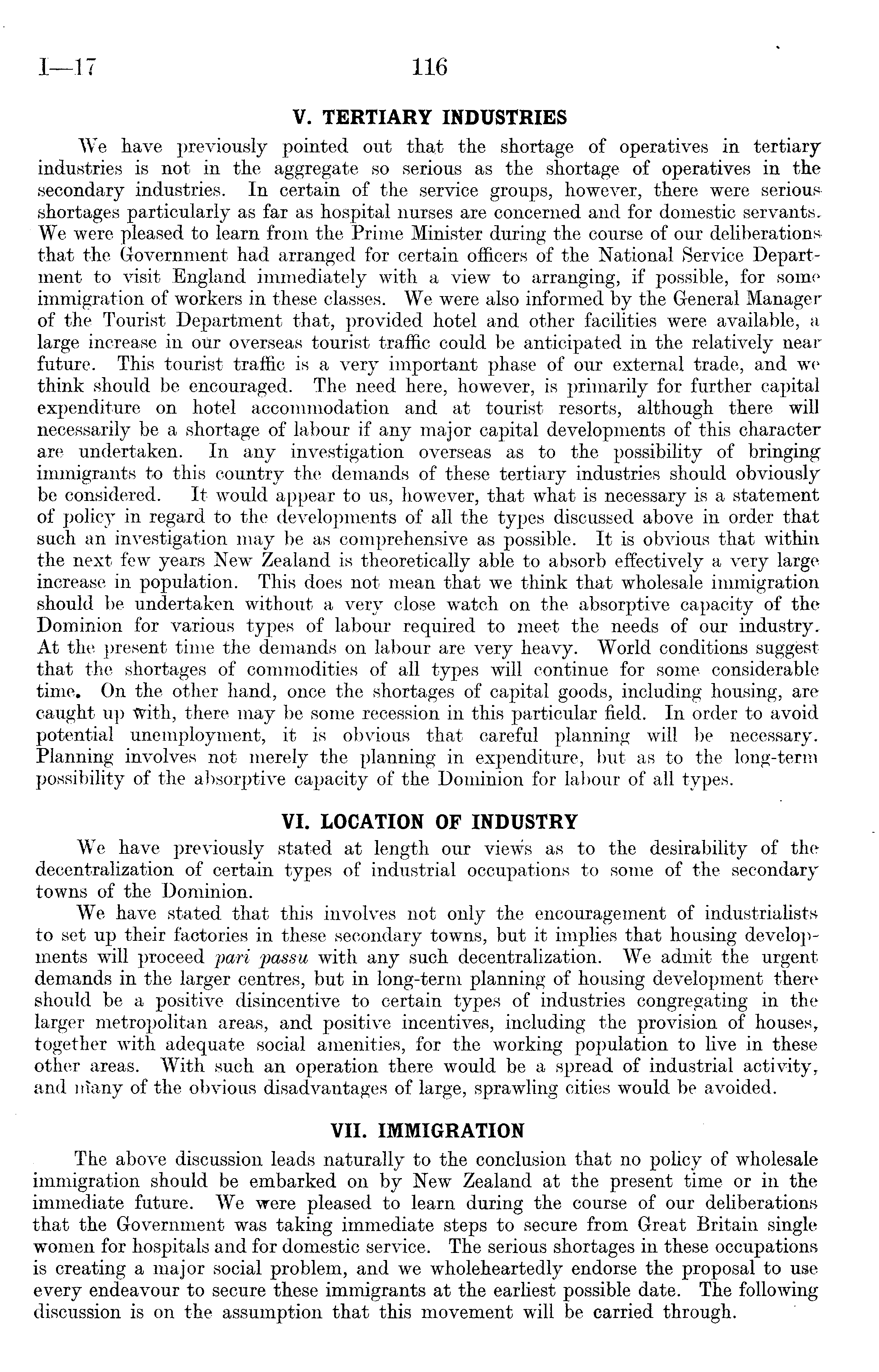 V. TERTIARY INDUSTRIES We have previously pointed out that the shortage of operatives in tertiary industries is not in the aggregate so serious as the shortage of operatives in the secondary industries. In certain of the service groups, however, there were seriousshortages particularly as far as hospital nurses are concerned and for domestic servants. We were pleased to learn from the Prime Minister during the course of our deliberationsthat the Government had arranged for certain officers of the National Service Department to visit England immediately with a view to arranging, if possible, for some immigration of workers in these classes. We were also informed by the General Manager of the Tourist Department that, provided hotel and other facilities were available, a large increase in our overseas tourist traffic could be anticipated in the relatively near future. This tourist traffic is a very important phase of our external trade, and we think should be encouraged. The need here, however, is primarily for further capital expenditure on hotel accommodation and at tourist resorts, although there will necessarily be a shortage of labour if any major capital developments of this character are undertaken. In any investigation overseas as to the possibility of bringing immigrants to this country the demands of these tertiary industries should obviously be considered. It would appear to us, however, that what is necessary is a statement of policy in regard to the developments of all the types discussed above in order that such an investigation may be as comprehensive as possible. It is obvious that within the next few years New Zealand is theoretically able to absorb effectively a very large increase in population. This does not mean that we think that wholesale immigration should be undertaken without a very close watch on the absorptive capacity of the Dominion for various types of labour required to meet the needs of our industry. At the present time the demands on labour are very heavy. World conditions suggest that the shortages of commodities of all types will continue for some considerable time. On the other hand, once the shortages of capital goods, including housing, are caught up with, there may be some recession in this particular field. In order to avoid potential unemployment, it is obvious that careful planning will be necessary. Planning involves not merely the planning in expenditure, but as to the long-term possibility of the absorptive capacity of the Dominion for labour of all types. VI. LOCATION OF INDUSTRY We have previously stated at length our views as to the desirability of the decentralization of certain types of industrial occupations to some of the secondary towns of the Dominion. We have stated that this involves not only the encouragement of industrialists to set up their factories in these secondary towns, but it implies that housing developments will proceed pari passu with any such decentralization. We admit the urgent demands in the larger centres, but in long-term planning of housing development there should be a positive disincentive to certain types of industries congregating in the larger metropolitan areas, and positive incentives, including the provision of houses, together with adequate social amenities, for the working population to live in these other areas. With such an operation there would be a spread of industrial activity, and many of the obvious disadvantages of large, sprawling cities would be avoided. VII. IMMIGRATION The above discussion leads naturally to the conclusion that no policy of wholesale immigration should be embarked on by New Zealand at the present time or in the immediate future. We were pleased to learn during the course of our deliberations that the Government was taking immediate steps to secure from Great Britain single women for hospitals and for domestic service. The serious shortages in these occupations is creating a major social problem, and we wholeheartedly endorse the proposal to use every endeavour to secure these immigrants at the earliest possible date. The following discussion is on the assumption that this movement will be carried through.