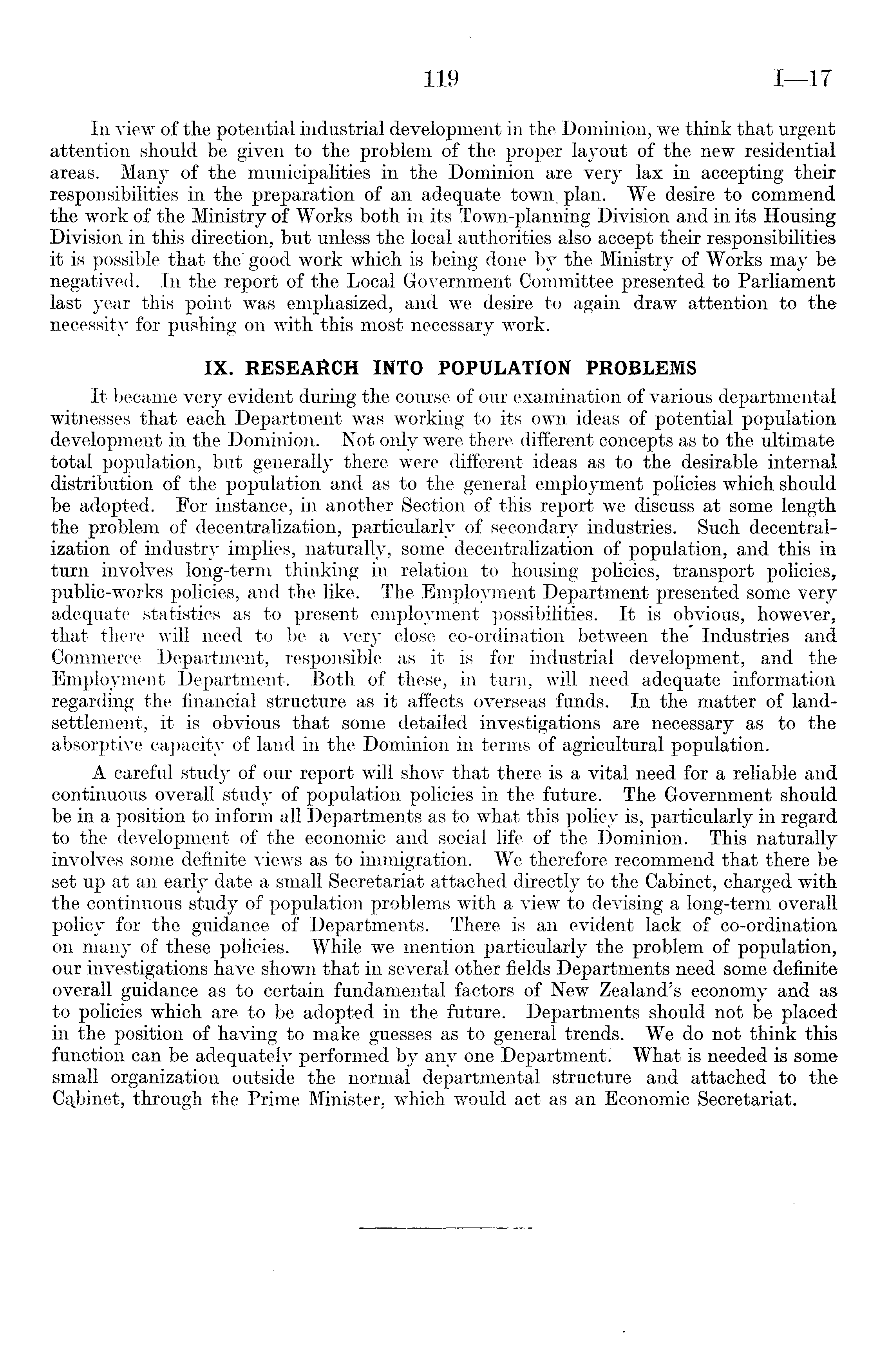 11l view of the potential industrial development in the Dominion, we think that urgent attention should be given to the problem of the proper layout of the new residential areas. Many of the municipalities in the Dominion are very lax in accepting their responsibilities in the preparation of an adequate town. plan. We desire to commend the work of the Ministry of Works both in its Town-planning Division and in its Housing Division in this direction, but unless the local authorities also accept their responsibilities it is possible that the" good work which is being done by the Ministry of Works may be negatived. In the report of the Local Government Committee presented to Parliament last year this point was emphasized, and we desire to again draw attention to the necessity for pushing on with this most necessary work. IX. RESEARCH INTO POPULATION PROBLEMS It became very evident during the course of our examination of various departmental witnesses that each Department was working to its own ideas of potential population development in the Dominion. Not only were there different concepts as to the ultimate total population, but generally there were different ideas as to the desirable internal distribution of the population and as to the general employment policies which should be adopted. For instance, in another Section of this report we discuss at some length the problem of decentralization, particularly of secondary industries. Such decentralization of industry implies, naturally, some decentralization of population, and this in turn involves long-term thinking in relation to housing policies, transport policies, public-works policies, and the like. The Employment Department presented some very adequate statistics as to present employment possibilities. It is obvious, however, that there will need to be a very close co-ordination between the Industries and Commerce Department, responsible as it is for industrial development, and the Employment Department. Both of these, in turn, will need adequate information regarding the financial structure as it affects overseas funds. In the matter of landsettlement, it is obvious that some detailed investigations are necessary as to the absorptive capacity of land in the Dominion in terms of agricultural population. A careful study of our report will show that there is a vital need for a reliable and continuous overall study of population policies in the future. The Government should be in a position to inform all Departments as to what this policy is, particularly in regard to the development of the economic and social life of the Dominion. This naturally involves some definite views as to immigration. We therefore recommend that there be set up at an early date a small Secretariat attached directly to the Cabinet, charged with the continuous study of population problems with a view to devising a long-term overall policy for the guidance of Departments. There is an evident lack of co-ordination on many of these policies. While we mention particularly the problem of population, our investigations have shown that in several other fields Departments need some definite overall guidance as to certain fundamental factors of New Zealand's economy and as to policies which are to be adopted in the future. Departments should not be placed in the position of having to make guesses as to general trends. We do not think this function can be adequately performed by any one Department." What is needed is some small organization outside the normal departmental structure and attached to the Cabinet, through the Prime Minister, which would act as an Economic Secretariat.