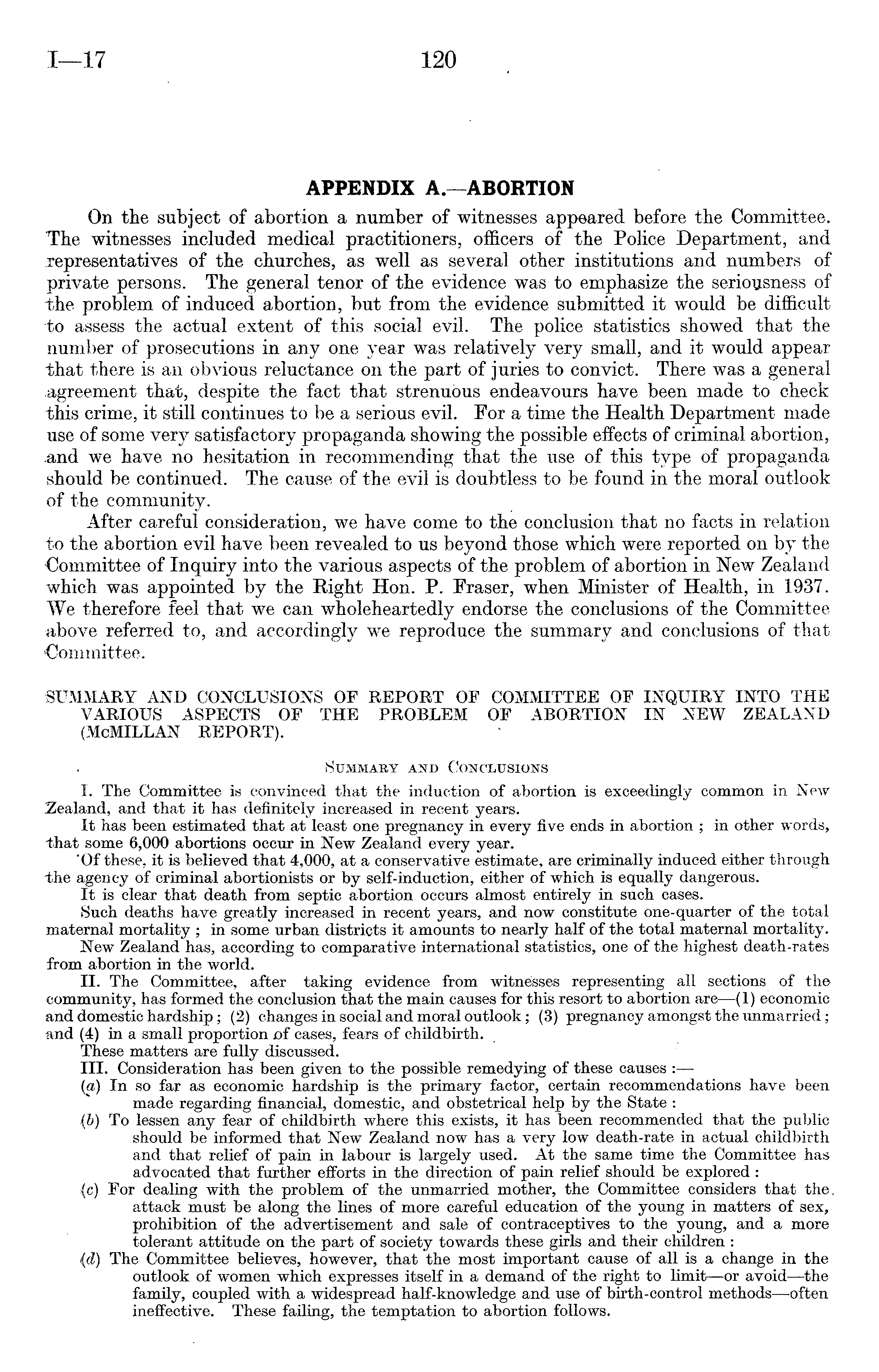 APPENDIX A.—ABORTION On the subject of abortion a number of witnesses appeared before the Committee. The witnesses included medical practitioners, officers of the Police Department, and representatives of the churches, as well as several other institutions and numbers of private persons. The general tenor of the evidence was to emphasize the seriousness of the problem of induced abortion, but from the evidence submitted it would be difficult to assess the actual extent of this social evil. The police statistics showed that the number of prosecutions in any one year was relatively very small, and it would appear that there is an obvious reluctance on the part of juries to convict. There was a general .agreement that, despite the fact that strenuous endeavours have been made to check this crime, it still continues to be a serious evil. For a time the Health Department made use of some very satisfactory propaganda showing the possible effects of criminal abortion, .and we have no hesitation in recommending that the use of this type of propaganda should be continued. The cause of the evil is doubtless to be found in the moral outlook of the community. After careful consideration, we have come to the conclusion that no facts in relation to the abortion evil have been revealed to us beyond those which were reported on by the Committee of Inquiry into the various aspects of the problem of abortion in New Zealand which was appointed by the Right Hon. P. Fraser, when Minister of Health, in 1937. We therefore feel that we can wholeheartedly endorse the conclusions of the Committee &bove referred to, and accordingly we reproduce the summary and conclusions of that ■Committee. SUMMARY AND CONCLUSIONS OF REPORT OF COMMITTEE OF INQUIRY INTO THE VARIOUS ASPECTS OF THE PROBLEM OF ABORTION IN NEW ZEALAND (McMillan report). Summary and Conclusions I. The Committee is convinced that the induction of abortion is exceedingly common in New Zealand, and that it has definitely increased in recent years. It has been estimated that at least one pregnancy in every five ends in abortion ; in other words, that some 6,000 abortions occur in New Zealand every year. 'Of these, it is believed that 4,000, at a conservative estimate, are criminally induced either through the agency of criminal abortionists or by self-induction, either of which is equally dangerous. It is clear that death from septic abortion occurs almost entirely in such cases. Such deaths have greatly increased in recent years, and now constitute one-quarter of the total maternal mortality ; in some urban districts it amounts to nearly half of the total maternal mortality. New Zealand has, according to comparative international statistics, one of the highest death-rates from abortion in the world. 11. The Committee, after taking evidence from witnesses representing all sections of the community, has formed the conclusion that the main causes for this resort to abortion are—(l) economic and domestic hardship; (2) changes in social and moral outlook; (3) pregnancy amongst the unmarried; and (4) in a small proportion of cases, fears of childbirth. These matters are fully discussed. 111. Consideration has been given to the possible remedying of these causes : —- (a) In so far as economic hardship is the primary factor, certain recommendations have been made regarding financial, domestic, and obstetrical help by the State : (b) To lessen any fear of childbirth where this exists, it has been recommended that the public should be informed that New Zealand now has a very low death-rate in actual childbirth and that relief of pain in labour is largely used. At the same time the Committee has advocated that further efforts in the direction of pain relief should be explored : i(c) For dealing with the problem of the unmarried mother, the Committee considers that the. attack must be along the lines of more careful education of the young in matters of sex, prohibition of the advertisement and sale of contraceptives to the young, and a more tolerant attitude on the part of society towards these girls and their children : (d) The Committee believes, however, that the most important cause of all is a change in the outlook of women which expresses itself in a demand of the right to limit—or avoid—the family, coupled with a widespread half-knowledge and use of birth-control methods —often ineffective. These failing, the temptation to abortion follows.