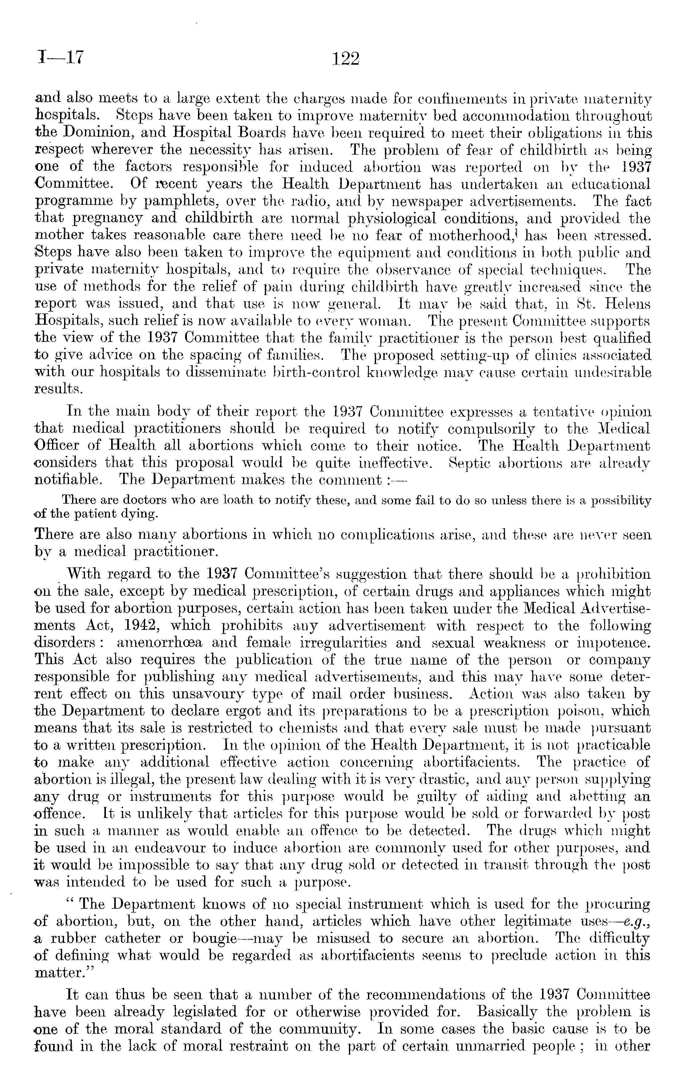 and also meets to a large extent the charges made for confinements in private maternity hospitals. Steps have been taken to improve maternity bed accommodation throughout the Dominion, and Hospital Boards have been required to meet their obligations in this respect wherever the necessity has arisen. The problem of fear of childbirth as being one of the factors responsible for induced abortion was reported on by the 1937 Committee. Of recent years the Health Department has undertaken an educational programme by pamphlets, over the radio, and by newspaper advertisements. The fact that pregnancy and childbirth are normal physiological conditions, and provided the mother takes reasonable care there need be no fear of motherhood,' has been stressed. Steps have also been taken to improve the equipment and conditions in both public and private maternity hospitals, and to require the observance of special techniques. The use of methods for the relief of pain during childbirth have greatly increased since the report was issued, and that use is now general. It may be said that, in St. Helens Hospitals, such relief is now available to every woman. The present Committee supports the view of the 1937 Committee that the family practitioner is the person best qualified to give advice on the spacing of families. The proposed setting-up of clinics associated with our hospitals to disseminate birth-control knowledge may cause certain undesirable results. In the main body of their report the 1937 Committee expresses a tentative opinion that medical practitioners should be required to notify compulsorily to the Medical Officer of Health all abortions which come to their notice. The Health Department considers that this proposal would be quite ineffective. Septic abortions are already notifiable. The Department makes the comment: — There are doctors who are loath to notify these, and some fail to do so unless there is a possibility of the patient dying. There are also many abortions in which no complications arise, and these are never seen by a medical practitioner. With regard to the 1937 Committee's suggestion that there should be a prohibition on the sale, except by medical prescription, of certain drugs and appliances which might be used for abortion purposes, certain action has been taken under the Medical Advertisements Act, 1942, which prohibits any advertisement with respect to the following disorders : amenorrhoea and female irregularities and sexual weakness or impotence. This Act also requires the publication of the true name of the person or company responsible for publishing any medical advertisements, and this may have some deterrent effect on this unsavoury type of mail order business. Action was also taken by the Department to declare ergot and its preparations to be a prescription poison, which means that its sale is restricted to chemists and that every sale must be made pursuant to a written prescription. In the opinion of the Health Department, it is not practicable to make any additional effective action concerning abortifacients. The practice of abortion is illegal, the present law dealing with it is very drastic, and any person supplying any drug or instruments for this purpose would be guilty of aiding and abetting an offence. It is unlikely that articles for this purpose would be sold or forwarded by post in such a manner as would enable an offence to be detected. The drugs which might be used in an endeavour to induce abortion are commonly used for other purposes, and it would be impossible to say that any drug sold or detected in transit through the post was intended to be used for such a purpose. " The Department knows of no special instrument which is used for the procuring of abortion, but, on the other hand, articles which have other legitimate uses—e.g., a rubber catheter or bougie—may be misused to secure an abortion. The difficulty of defining what would be regarded as abortifacients seems to preclude action in this matter." It can thus be seen that a number of the recommendations of the 1937 Committee have been already legislated for or otherwise provided for. Basically the problem is one of the moral standard of the community. In some cases the basic cause is to be found in the lack of moral restraint on the part of certain unmarried people ; in other