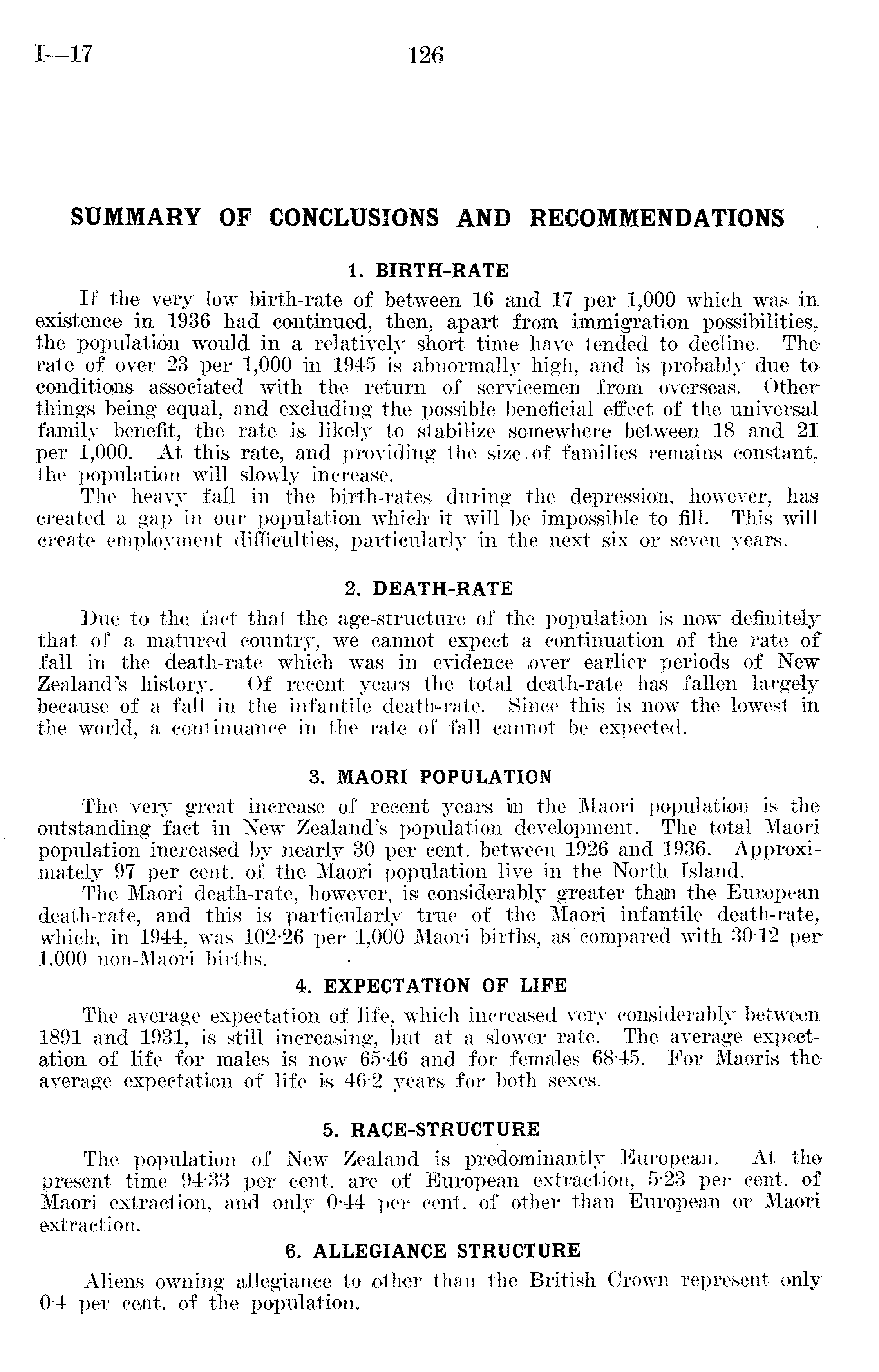SUMMARY OF CONCLUSIONS AND RECOMMENDATIONS 1. BIRTH-RATE If the very low birth-rate of between 16 and 17 per 1,000 which was in existence in 1936 had continued, then, apart from immigration possibilities,, the population would in a relatively short time have tended to decline. The rate of over 23 per 1,000 in 1945 is abnormally high, and is probably due to conditions associated with the return of servicemen from overseas. Other things being equal, and excluding the possible beneficial effect of the universal family benefit, the rate is likely to stabilize somewhere between 18 and 21 per 1,000. At this rate, and providing the size.of'families remains constant, the population will slowly increase. The heavy fall in the birth-rates during the depression, however, has created a gap in our population which it will be impossible to fill. This will create employment difficulties, particularly in the next six or seven years. 2. DEATH-RATE Due to the fact that the age-structure of the population is now definitely that of a matured country, we cannot expect a continuation of the rate of fall in the death-rate which was in evidence over earlier periods of New Zealand's history. Of recent years the total death-rate has fallen largely because of a fall in the infantile death-rate. Since this is now the lowest in the world, a continuance in the rate of fall cannot be expected. 3. MAORI POPULATION The very great increase of recent years iln the Maori population is the outstanding fact in New Zealand's population development. The total Maori population increased by nearly 30 per cent, between 1926 and 1936. Approximately 97 per cent, of the Maori population live in the North Island. The Maori death-rate, however, is considerably greater thain the European death-rate, and this is particularly true of the Maori infantile death-rate, which, in 1944, was 102-26 per 1,000 Maori births, as compared with 3012 per 1,000 non-Maori births. 4. EXPECTATION OF LIFE The average expectation of life, which increased very considerably between 1891 and 1931, is still increasing, but at a slower rate. The average expectation of life for males is now 65 46 and for females 68 45. For Maoris the average expectation of life is 46-2 years for both sexes. 5. RACE-STRUCTURE The population of New Zealand is predominantly European. At the present time 94-33 per cent, are of European extraction, 5-23 per cent, of Maori extraction, and only 0-44 per cent, of other than European or Maori extraction. 6. ALLEGIANCE STRUCTURE Aliens owning allegiance to other than the British Crown represent only 0-4 per cent, of the population.