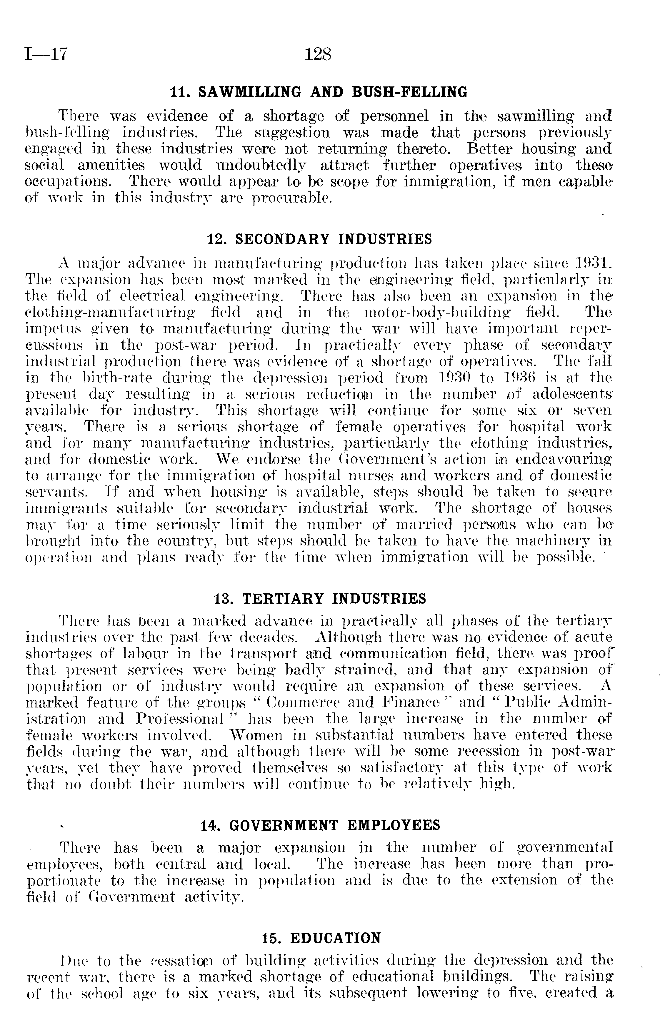 11. SAWMILLING AND BUSH-FELLING There was evidence of a shortage of personnel in the sawmilling and bush-felling industries. The suggestion was made that persons previously engaged in these industries were not returning thereto. Better housing and social amenities would undoubtedly attract further operatives into these occupations. There would appear to be scope for immigration, if men capable of work in this industry are procurable. 12. SECONDARY INDUSTRIES A major advance in manufacturing production has taken place since 1931, The expansion has been most marked in the engineering field, particularly in the field of electrical engineering. There has also been an expansion in the clothing-manufacturing field and in the motor-body-building field. The impetus given to manufacturing during the war will have important repercussions in the post-war period. In practically every phase of secondary industrial production there was evidence of a shortage of operatives. The fall in the birth-rate during the depression period from 1030 to 1936 is at the present day resulting in a serious reduction in the number of adolescents available for industry. This shortage will continue for some six or seven years. There is a serious shortage of female operatives for hospital work and for many manufacturing industries, particularly the clothing industries, and for domestic work. We endorse the Government's action in endeavouring to arrange for the immigration of hospital nurses and workers and of domestic servants. If and when housing is available, steps should be taken to secure immigrants suitable for secondary industrial work. The shortage of houses may for a time seriously limit the number of married persons who can be brought into the country, but steps should be taken to have the machinery in operation and plans ready for the time when immigration will be possible. 13. TERTIARY INDUSTRIES There has been a marked advance in practically all phases of the tertiary industries over the past few decades. Although there was no evidence of acute shortages of labour in the transport and communication field, there was proof that present services were being badly strained, and that any expansion of population or of industry would require an expansion of these services. A marked feature of the groups " Commerce and Finance " and " Public Administration and Professional " has been the large increase in the number of female workers involved. Women in substantial numbers have entered these fields during the war, and although there will be some recession in post-war years, yet they have proved themselves so satisfactory at this type of work that no doubt their numbers will continue to be relatively high. 14. GOVERNMENT EMPLOYEES There has been a major expansion in the number of governmental employees, both central and local. The increase has been more than proportionate to the increase in population and is due to the extension of the field of Government activity. 15. EDUCATION Due to the cessation of building activities during the depression and the recent war, there is a marked shortage of educational buildings. The raising of the school age to six years, and its subsequent lowering to five, created &