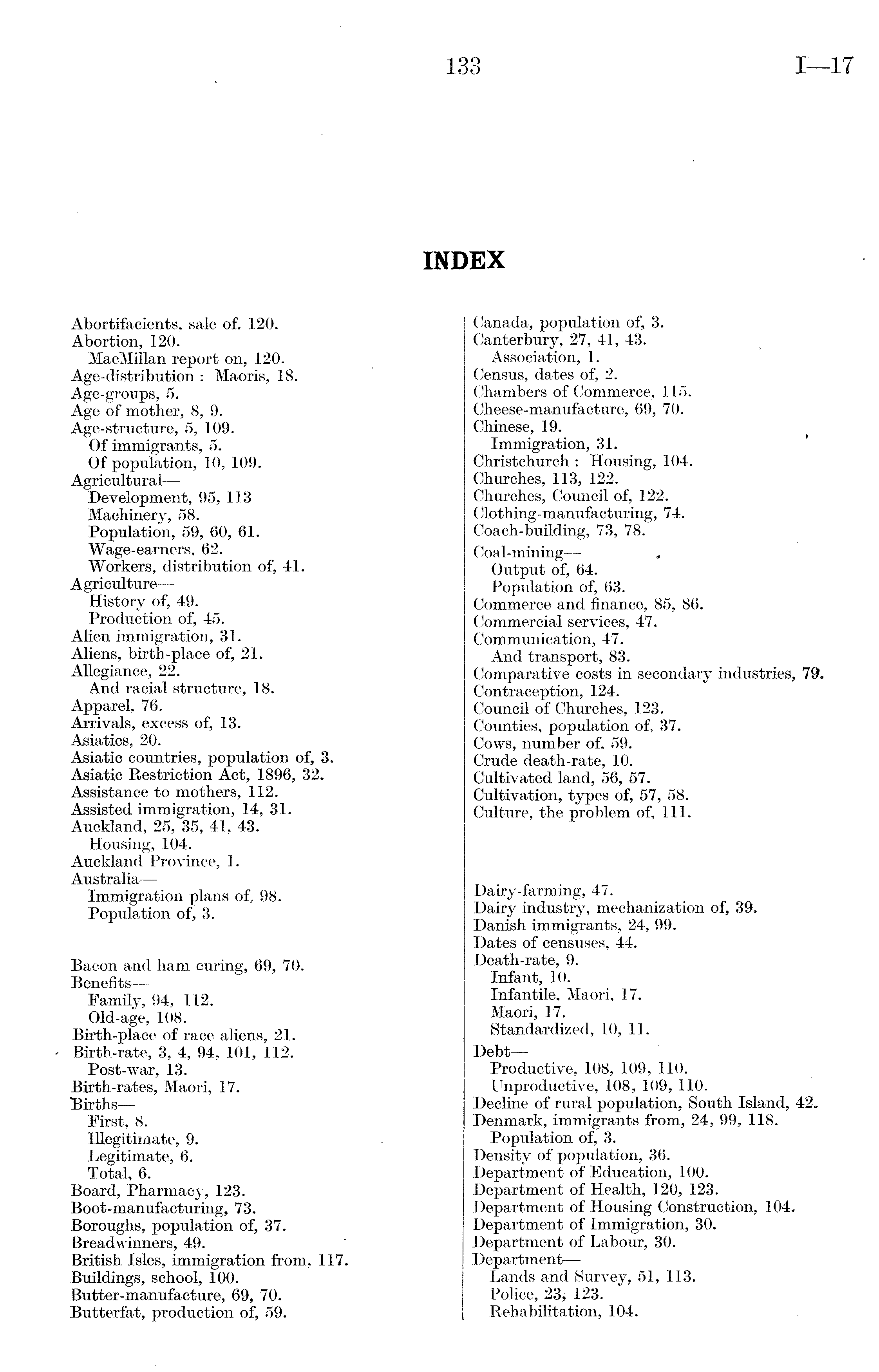 Canada, population of, 3. Canterbury, 27, 41, 43. Association, 1. Census, dates of, 2. Chambers of Commerce, 115. Cheese-manufacture, 69, 70. Chinese, 19. Immigration, 31. Christchurch : Housing, 104. Churches, 113, 122. Churches, Council of, 122. Clothing-manufacturing, 74. Coach-building, 73, 78. Coal-mining— Output of, 64. Population of, 63. Commerce and finance, 85, 86. Commercial services, 47. Communication, 47. And transport, 83. Comparative costs in secondary industries, 79, Contraception, 124. Council of Churches, 123. Counties, population of, 37. Cows, number of, 59. Crude death-rate, 10. Cultivated land, 56, 57. Cultivation, types of, 57, 58. Culture, the problem of, 111. Dairy-farming, 47. Dairy industry, mechanization of, 39. Danish immigrants, 24, 99. Dates of censuses, 44. Death-rate, 9. Infant, 10. Infantile, Maori, 17. Maori, 17. Standardized, 10, 11. Debt — Productive, 108, 109, 110. Unproductive, 108, 109, 110. Decline of rural population, South Island, 42. Denmark, immigrants from, 24, 99, 118. Population of, 3. Density of population, 36. Department of Education, 100. Department of Health, 120, 123. Department of Housing Construction, 104. Department of Immigration, 30. Department of Labour, 30. Department — Lands and Survey, 51, 113. Police, 23, 123. Rehabilitation, 104.