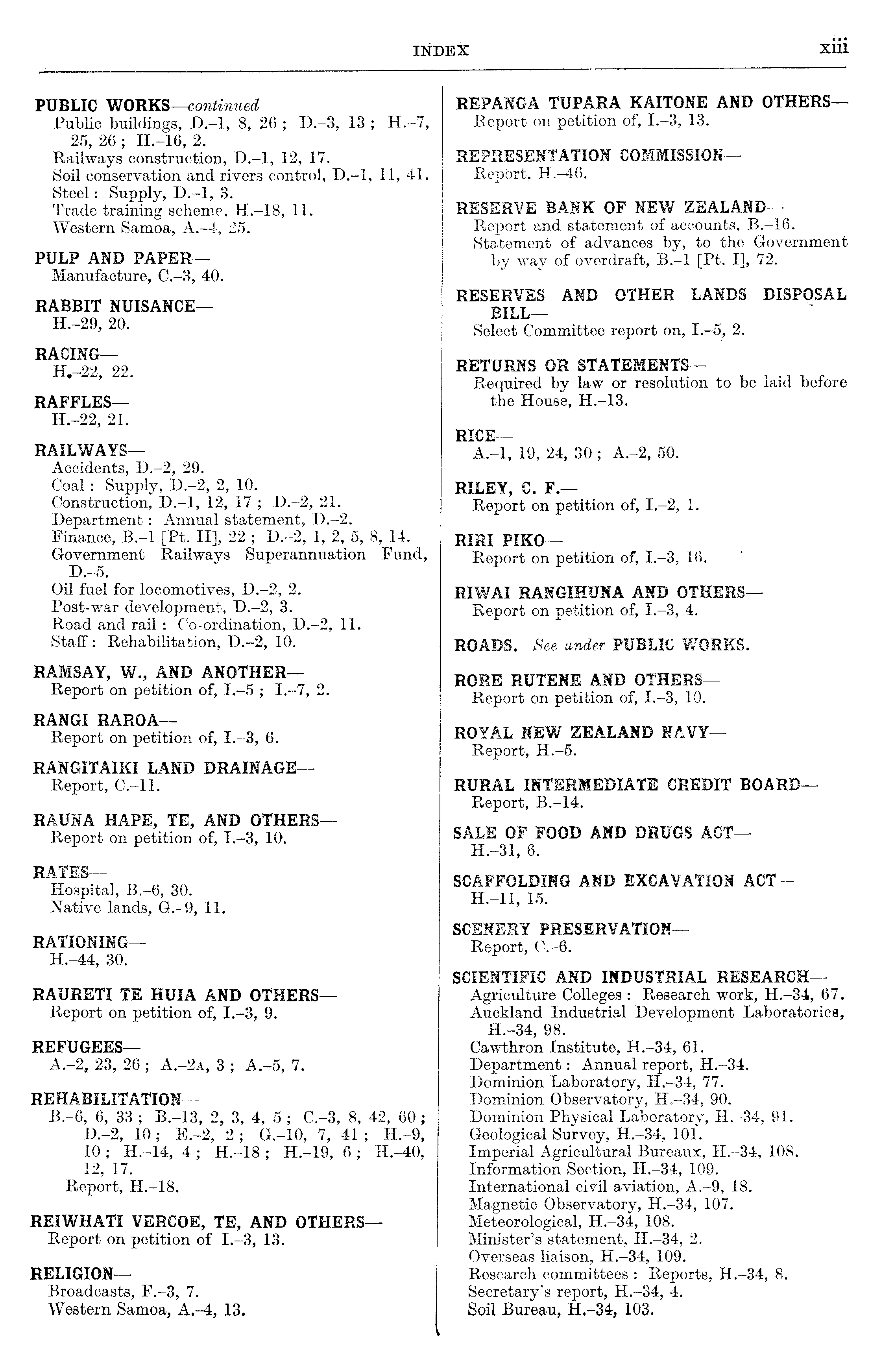 REPANGA TUPARA KAITONE AND OTHERS— Report on petition of, 1.—3, 13. REPRESENTATION COMMISSION— Report, H.-46. RESERVE BANK OF NEW ZEALAND — Report and statement of accounts, 8.-16. Statement of advances by, to the Government by way of overdraft, 8.-l [Pt. I], 72. RESERVES AND OTHER LANDS DISPOSAL BILL— Select Committee report on, 1.—5, 2. RETURNS OR STATEMENTS— Required by law or resolution to be laid before the House, H.-13. RICE— A.-l, 19, 24, 30; A.-2, 50. RILEY, C. F.— Report on petition of, 1.-2, 1. RIRI PIKO— Report on petition of, 1.-3, 16. RIWAI RANGIHUNA AND OTHERS— Report on petition of, 1.-3, 4. ROADS. See under PUBLIC WORKS. RORE RUTENE AND OTHERS— Report on petition of, 1.-3, 10. ROYAL NEW ZEALAND NAVY— Report, H.-5. RURAL INTERMEDIATE CREDIT BOARD— Report, 8.-14. SALE OF FOOD AND DRUGS ACT— H.-31, 6. SCAFFOLDING AND EXCAVATION ACT— H.-11, 15. SCENERY PRESERVATION— Report, C.-6. SCIENTIFIC AND INDUSTRIAL RESEARCH— Agriculture Colleges : Research work, H.-34, 67. Auckland Industrial Development Laboratories, H.-34, 98. Cawthron Institute, H.-34, 61. Department: Annual report, H.-34. Dominion Laboratory, H.-34, 77. Dominion Observatory, H.-34, 90. Dominion Physical Laboratory, H.-34, 91. Geological Survey, H.-34, 101. Imperial Agricultural Bureaux, H.-34, 108. Information Section, H.-34, 109. International civil aviation, A.-9, 18. Magnetic Observatory, H.-34, 107. Meteorological, H.-34, 108. Minister's statement, H.-34, 2. Overseas liaison, H.-34, 109. Research committees : Reports, H.-34, 8. Secretary's report, H.-34, 4. Soil Bureau, H.-34, 103.