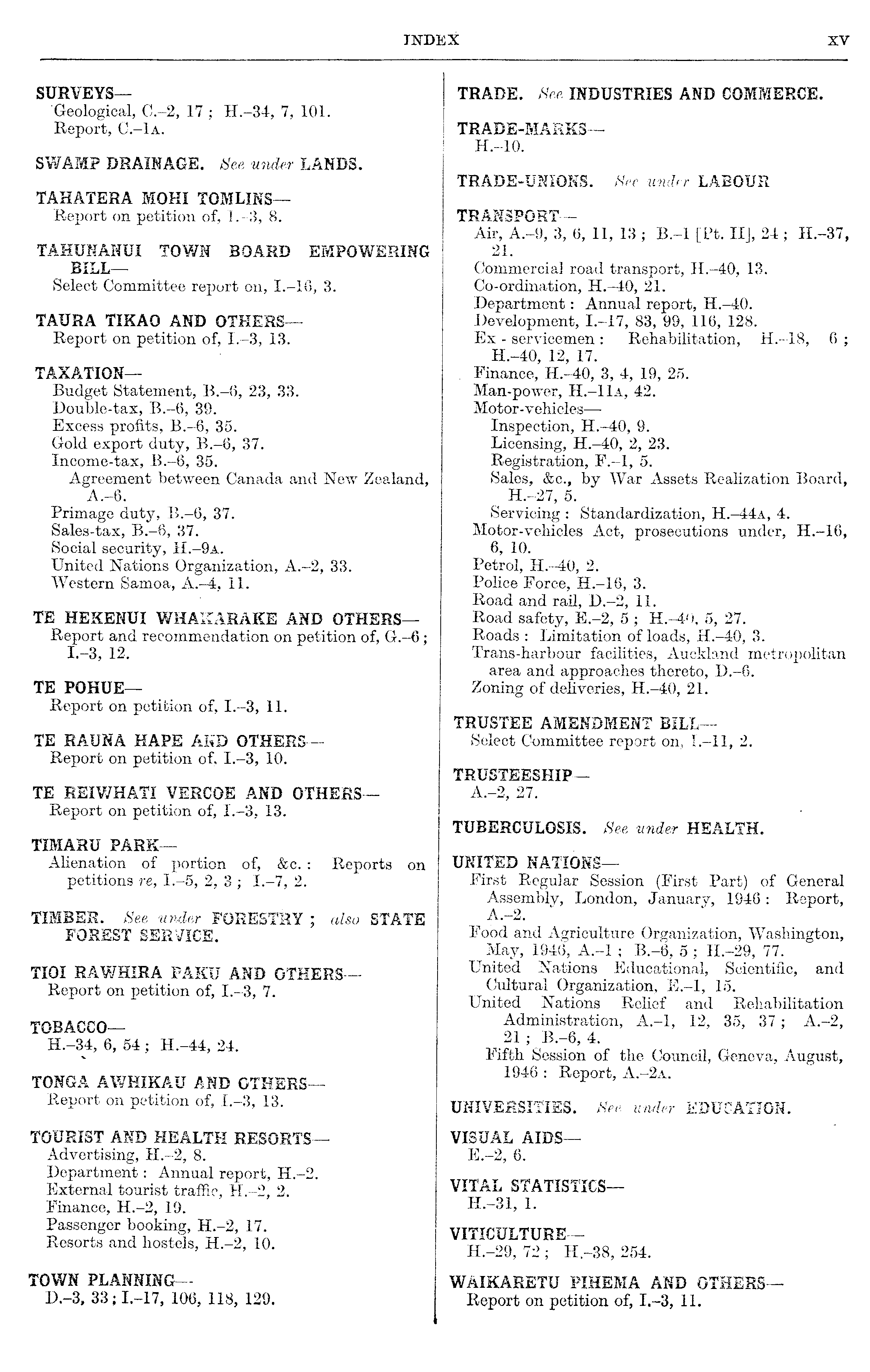 TRADE. See INDUSTRIES AND COMMERCE. TRADE-MARKS— H.-10. TRADE-UNIONS. See under LABOUR TRANSPORT— Air, A.-9, 3, 6, 11, 13 ; 8.-l [Pt. ll], 24; H.-37, 21. Commercial road transport, H.-40, 13. Co-ordination, H.-40, 21. Department: Annual report, H.-40. Development, 1.-17, 83, 99, 116, 128. Ex - servicemen: Rehabilitation, H.-18, 6 ; H.-40, 12, 17. . Finance, H.-40, 3, 4, 19, 25. Man-power, H.-11a, 42. Motor-vehicles— Inspection, H.-40, 9. Licensing, H.-40, 2, 23. Registration, F.-l, 5. Sales, &c., by War Assets Realization Board, H.-27, 5. Servicing : Standardization, H.-44a, 4. Motor-vehicles Act, prosecutions under, H.-16, 6, 10. Petrol, H.-40, 2. Police Force, H.-16, 3. Road and rail, D.-2, 11. Road safety, E.-2, 5 ; H.-40, 5, 27. Roads : Limitation of loads, H.-40, 3. Trans-harbour facilities, Auckland metropolitan area and approaches thereto, D.-6. Zoning of deliveries, H.-40, 21. TRUSTEE AMENDMENT BILL— Select Committee report on, 1.-11, 2. TRUSTEESHIP— A.-2, 27. TUBERCULOSIS. See under HEALTH. UNITED NATIONS— First Regular Session (First Part) of General Assembly, London, January, 1946: Report, A.-2. Food and Agriculture Organization, Washington, May, 1946, A.-l ; 8.-6, 5 ; H.-29, 77. United Nations Educational, Scientific, and Cultural Organization, E-1, 15. United Nations Relief and Rehabilitation Administration, A.-l, 12, 35, 37; A.-2, 21 ; 8.-6, 4. Fifth Session of the Council, Geneva, August, 1946 : Report, A.-2a. UNIVERSITIES. See under EDUCATION. VISUAL AIDS — E.-2, 6. VITAL STATISTICS— H.-31, 1. VITICULTURE— H.-29, 72 ; H-38, 254. WAIKARETU PIHEMA AND OTHERS— Report on petition of, 1,-3, 11.