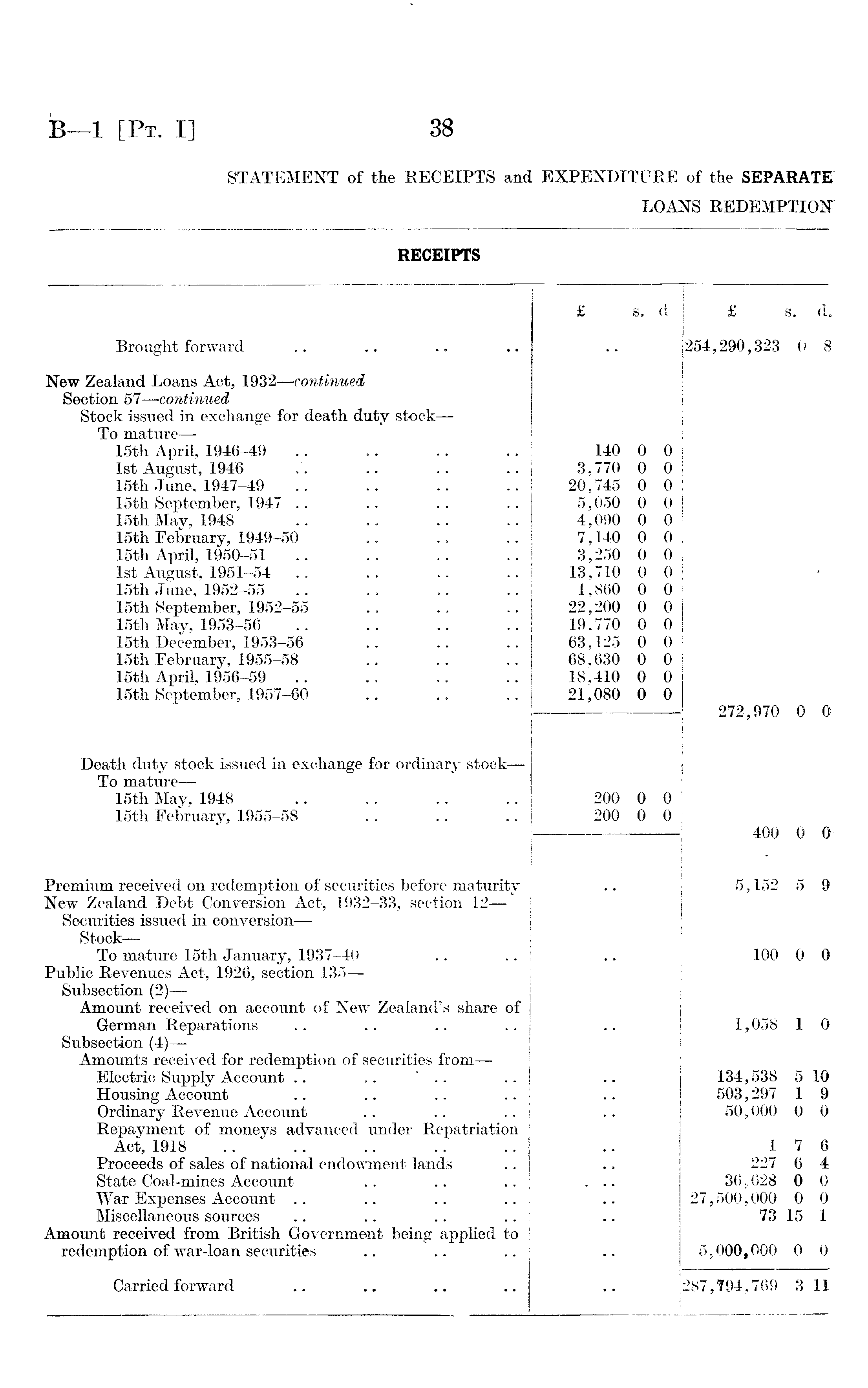 RECEIPTS £ s. d £ s. d. Brought forward .. • .. 254,290,323 0 8 New Zealand Loans Act, 1932 —continued Section 57—continued Stock issued in exchange for death duty stock— To mature— 15th April, 1946-49 140 0 0 1st August, 1946 3,770 0 0 15th June, 1947-49 20,745 0 0 15th September, 1947 5,050 0 0 15th May, 1948 4,090 0 0 15th February, 1949-50 7,140 0 0 15th April, 1950-51 3,250 0 0 1st August, 1951-54 13,710 0 0 15th June, 1952-55 1,860 0 0 15th September, 1952-55 22,200 0 0 15th May, 1953-56 19,770 0 0 15th December, 1953-56 63,125 0 0 15th February, 1955-58 68,630 0 0 15th April, 1956-59 18,410 0 0 15th September, 1957-60 21,080 0 0 979 Q7ft ft ft* 1 &J y iJ t \J V \y Death duty stock issued in exchange for ordinary stock— To mature — 15th May, 1948 200 0 0 15th February, 1955-58 200 0 0 400 0 0 Premium received on redemption of securities before maturity 5,152 5 9 New Zealand Debt Conversion Act, 1932-33, section 12— Securities issued in conversion— Stock — To mature 15th January, 1937-40 100 0 0 Public Revenues Act, 1926, section 135 — Subsection (2) — Amount received on account of New Zealand's share of German Reparations 1,058 1 0 Subsection (4) — Amounts received for redemption of securities from — Electric Supply Account .. .. 134,538 5 10' Housing Account 503,297 1 9 Ordinary Revenue Account 50,000 0 0 Repayment of moneys advanced under Repatriation Act, 1918 1 7 6 Proceeds of sales of national endowment lands 227 6 4 State Coal-mines Account 36,628 0 0 War Expenses Account 27,500,000 0 0 Miscellaneous sources 73 15 1 Amount received from British Government being applied to redemption of war-loan securities 5,000,000 0 0 Carried forward j 287,794,769 3 11