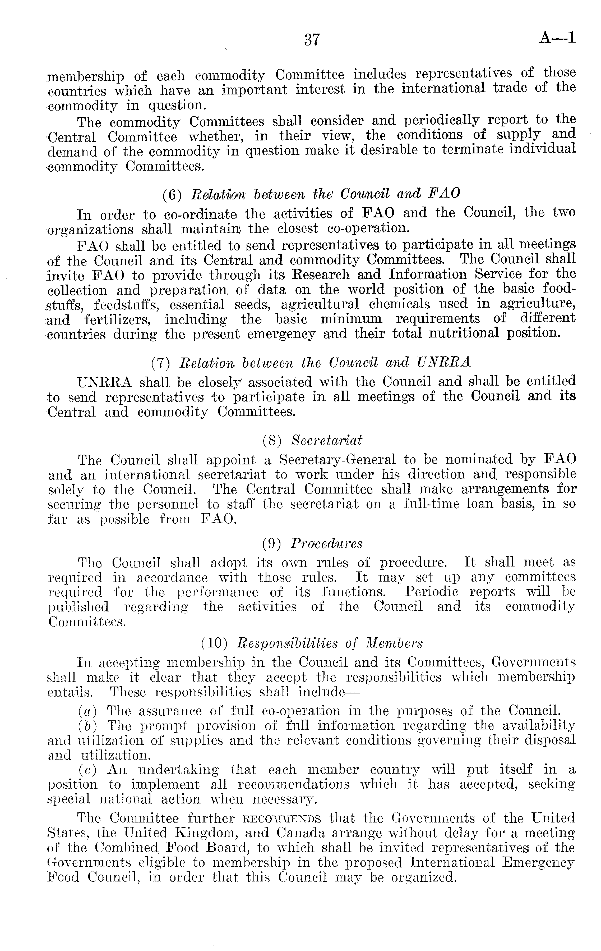 membership of each commodity Committee includes representatives of those countries which have an important, interest in the international trade of the commodity in question. The commodity Committees shall consider and periodically report to the Central Committee whether, in their view, the conditions of supply _ and demand of the commodity in question make it desirable to terminate individual •commodity Committees. (6) Relation between ths Council and FAO In order to co-ordinate the activities of FAO and the Council, the two •organizations shall maintain the closest co-operation. FAO shall be entitled to send representatives to participate in all meetings -of the Council and its Central and commodity Committees. The Council shall invite FAO to provide through its Research and Information Service for the collection and preparation of data on the world position of the basic foodstuffs, feedstuffs, essential seeds, agricultural chemicals used in agriculture, :and fertilizers, including the basic minimum requirements of different -countries during the present emergency and their total nutritional position. (7) Relation between the Council and JJNRRA UNKRA shall be closely associated with the Council and shall be entitled to send representatives to participate in all meetings of the Council and its Central and commodity Committees. (8) Secretariat The Council shall appoint a Secretary-General to be nominated by FAO and an international secretariat to work under his direction and responsible solely to the Council. The Central Committee shall make arrangements for securing the personnel to staff the secretariat on a full-time loan basis, in so far as possible from FAO. (9) Procedures The Council shall adopt its own rules of procedure. It shall meet as required in accordance with those rules. It may set up any committees required for the performance of its functions. Periodic reports will be published regarding the activities of the Council and its commodity Committees. (10) Responsibilities of Members In accepting membership in the Council and its Committees, Governments shall make it clear that they accept the responsibilities which membership entails. These responsibilities shall include—(«i) The assurance of full co-operation in the purposes of the Council. (b) The prompt provision of full information regarding the availability and utilization of supplies and the relevant conditions governing their disposal and utilization. (c) An undertaking that each member country will put itself in a position to implement all recommendations which it has accepted, seeking special national action when necessary. The Committee further recommends that the Governments of the United States, the United Kingdom, and Canada arrange without delay for a meeting of the Combined Food Board, to which shall be invited representatives of the Governments eligible to membership in the proposed International Emergency Food Council, in order that this Council may be organized.