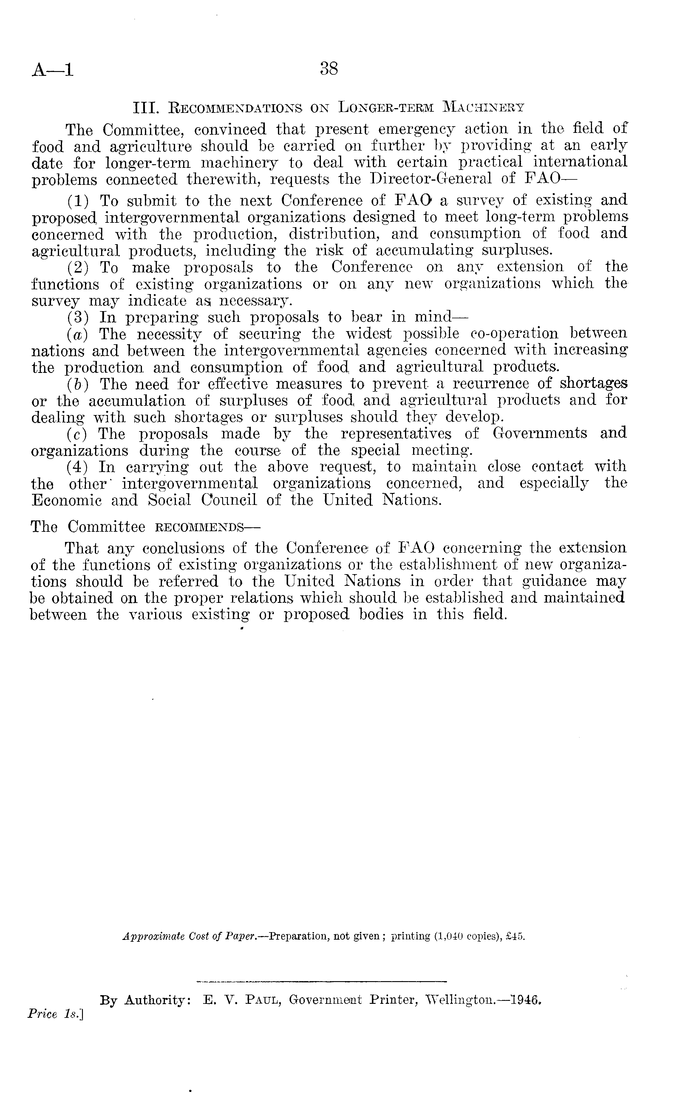 111. Recommendations on Longer-term Machinery The Committee, convinced that present emergency action in the field of food and agriculture should be carried on further by providing at an early date for longer-term machinery to deal with certain practical international problems connected therewith, requests the Director-General of FAO—(1) To submit to the next Conference of FAO a survey of existing and proposed, intergovernmental organizations designed to meet long-term problems concerned with the production, distribution, and consumption of food and agricultural products, including the risk of accumulating surpluses. (2) To make proposals to the Conference on any extension of the functions of existing organizations or on any new organizations which the survey may indicate asu necessary. (3) In preparing such proposals to bear in mind—(a) The necessity of securing the widest possible co-operation between nations and between the intergovernmental agencies concerned with increasing the production and consumption of food and agricultural products. (b) The need for effective measures to prevent a recurrence of shortages or the accumulation of surpluses of food and agricultural products and for dealing with such shortages or surpluses should they develop. (c) The proposals made by the representatives of Governments and organizations during the course of the special meeting. (4) In carrying out the above request, to maintain close contact with the other' intergovernmental organizations concerned, and especially the Economic and Social Council of the United Nations. The Committee recommends — That any conclusions of the Conference of FAO concerning the extension of the functions of existing organizations or the establishment of new organizations should be referred to the United Nations in order that guidance may be obtained on the proper relations which should be established and maintained between the various existing or proposed bodies in this field.