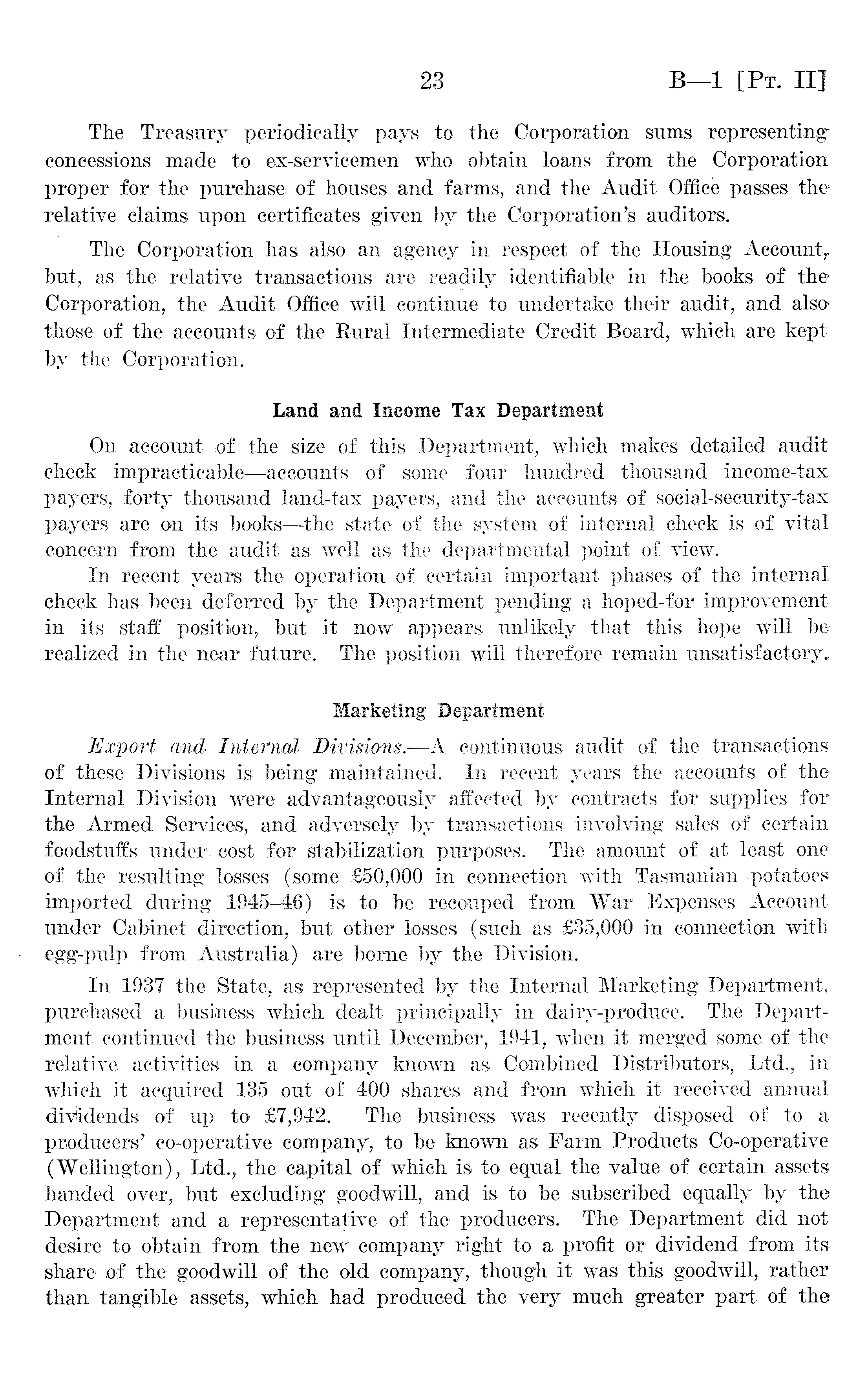 The Treasury periodically pays to the Corporation sums representingconcessions made to ex-servicemen who obtain loans from the Corporation proper for the purchase of houses and farms, and the Audit Office passes the relative claims upon certificates given by the Corporation's auditors. The Corporation has also an agency in respect of the Housing Account,, but, as the relative transactions are readily identifiable in the books of the Corporation, the Audit Office will continue to undertake their audit, and also those of the accounts of the Rural Intermediate Credit Board, which are kept by the Corporation. Land and Income Tax Department On account of the size of this Department, which makes detailed audit check impracticable—accounts of some four hundred thousand income-tax payers, forty thousand land-tax payers, and the accounts of social-security-tax payers are on its books—the state of the system of internal check is of vital concern from the audit as well as the departmental point of view. In recent years the operation of certain important phases of the internal check has been deferred by the Department pending a hoped-for improvement in its staff position, but it now appears unlikely that this hope will be realized in the near future. The position will therefore remain unsatisfactory. Marketing Department Export mid Internal Divisions.—A continuous audit of the transactions of these Divisions is being maintained. In recent years the accounts of the Internal Division were advantageously affected by contracts for supplies for the Armed Services, and adversely by transactions involving sales of certain foodstuffs under, cost for stabilization purposes. The amount of at least one of the resulting losses (some £50,000 in connection with Tasmanian potatoes imported during 1945-46) is to be recouped from War Expenses Account under Cabinet direction, but other losses (such as £35,000 in connection with egg-pulp from Australia) are borne by the Division. In 1937 the State, as represented by the Internal Marketing Department,, purchased a business which dealt principally in dairy-produce. The Department continued the business until December, 1941, when it merged some of the relative activities in a company known as Combined Distributors, Ltd., in which it acquired 135 out of 400 shares and from which it received annual dividends of up to £7,942, The business was recently disposed of to a producers' co-operative company, to be known as Farm Products Co-operative (Wellington), Ltd., the capital of which is to equal the value of certain assets handed over, but excluding goodwill, and is to be subscribed equally by the Department and a representative of the producers. The Department did not desire to obtain from the new company right to a profit or dividend from its share of the goodwill of the old company, though it was this goodwill, rather than tangible assets, which had produced the very much greater part of the