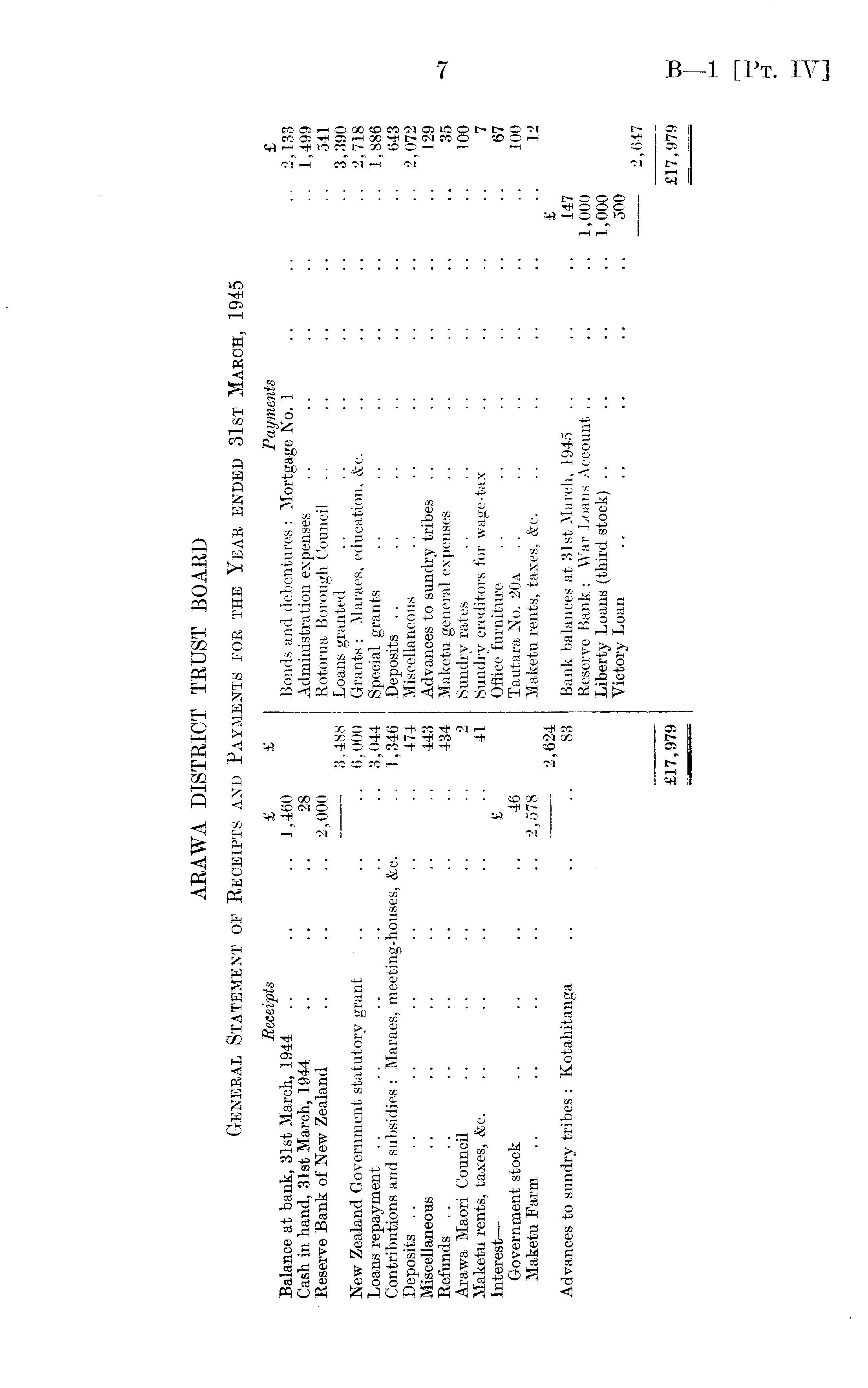 Receipts £ £ Payments £ Balance at bank, 31st March, 1944 .. .. .. 1,460 Bonds and debentures: Mortgage No. 1 .. .. .. 2,133 Cash in hand, 31st March, 1944 .. .. .. 28 Administration expenses .. .. .. .. .. 1,499 Reserve Bank of New Zealand .. .. .. 2,000 Rotorua Borough Council .. .. .. 541 —— 3,488 Loans granted .. .. .. .. .. .. 3,390 New Zealand Government statutory grant .. .. .. 6,000 Grants: Maraes, education,- &c. .. .. .. .. 2,718 Loans repayment .. .. .. .. .. .. 3,044 Special grants .. . . . . .. .. 1,886 Contributions and subsidies : Maraes, meeting-houses, &c. .. 1,346 Deposits .. .. .. . . .. .. .. 643 Deposits .. .. .. .. .. .. .. 474 Miscellaneous .. .. .. .. .. .. 2,072 Miscellaneous .. ~ .. .. ~ .. 443 Advances to sundry tribes . , . . .. .. .. 129 Refunds .. .. .. .. .. .. .. 434 Maketu general expenses .. . . .. .. .. 35 Arawa Maori Council .. .. .. .. .. 2 Sundry rates .. .. .. .. .. .. 100 Maketu rents, taxes, &c. .. .. .. .. . . 41 Sundry creditors for wage-tax .. .. .. .. 7 Interest — £ Office furniture .. . . .. . . .. .. 67 Government stock .. .. .. .. 46 Tautara No. 20a .. .. .. .. .. .. 100 Maketu Farm .. .. .. .. .. 2,578 Maketu rents, taxes, &c. .. .. .. .. .. 12 2,624 £ Advances to sundry tribes : Kotahitanga .. .. .. 83 Bank balances at 31st March, 1945 .. .. .. 147 Reserve Bank : War Loans Account .. .. .. 1,000 Liberty Loans (third stock) .. .. .. .. 1,000 Victory Loan .. .. .. .. .. 500 2,647 £17,979 £17,979