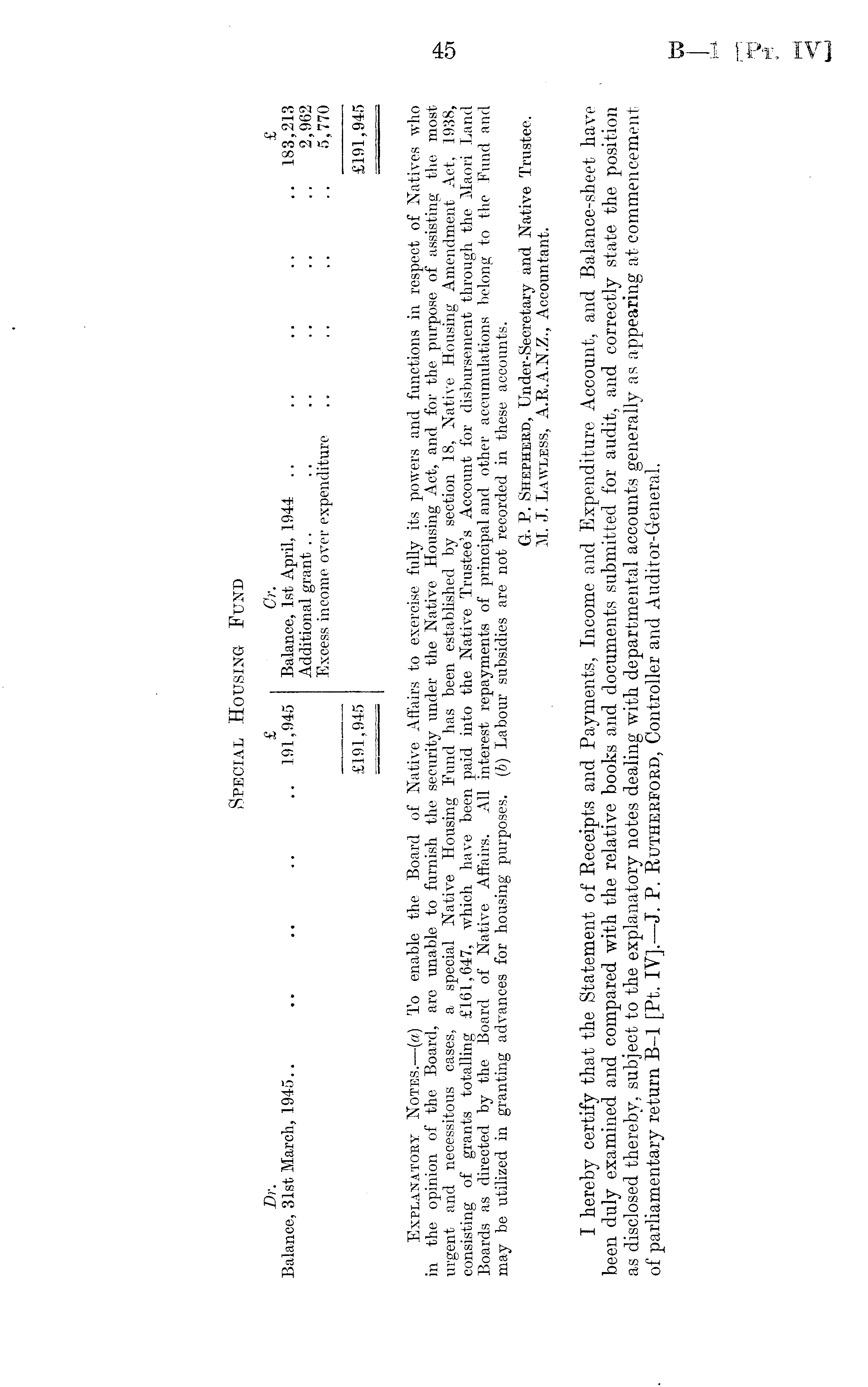 Dr. £ • Cr. £ Balance, 31st March, 1945.. .. .. .. .. 191,945 Balance, Ist April, 1944 .. .. .. .. .. 183,213 Additional grant .. .. .. .. .. .. 2,962 Excess income over expenditure .. .. .. .. 5,770 £191,945 £191,945 Explanatory Notes.—(a) To enable the Board of Native Affairs to exercise fully its powers and functions in respect of Natives who in the opinion of the Board, are unable to furnish the security under the Native Housing Act, and for the purpose of assisting the most urgent and necessitous cases, a special Native Housing Eund has been established by section 18, Native Housing Amendment Act, 1938, consisting of grants totalling £161,647, which have been paid into the Native Trustee's Account for disbursement through the Maori Land Boards as directed by the Board of Native Affairs. All interest repayments of principal and other accumulations belong to the Eund and may be utilized in granting advances for housing purposes, (b) Labour subsidies are not recorded in these accounts. G. P. Shepherd, Under-Secretary and Native Trustee. M. J. Lawless, A.R.A.N.Z., Accountant. I hereby certify that the Statement of Receipts and Payments, Income and Expenditure Account, and Balance-sheet have been duly examined and compared with the relative books and documents submitted for audit, and correctly state the position as disclosed thereby, subject to the explanatory notes dealing with departmental accounts generally as appearing at commencement of parliamentary return B-l [Pt. IV].— J. P. Rutherford, Controller and Auditor-General.