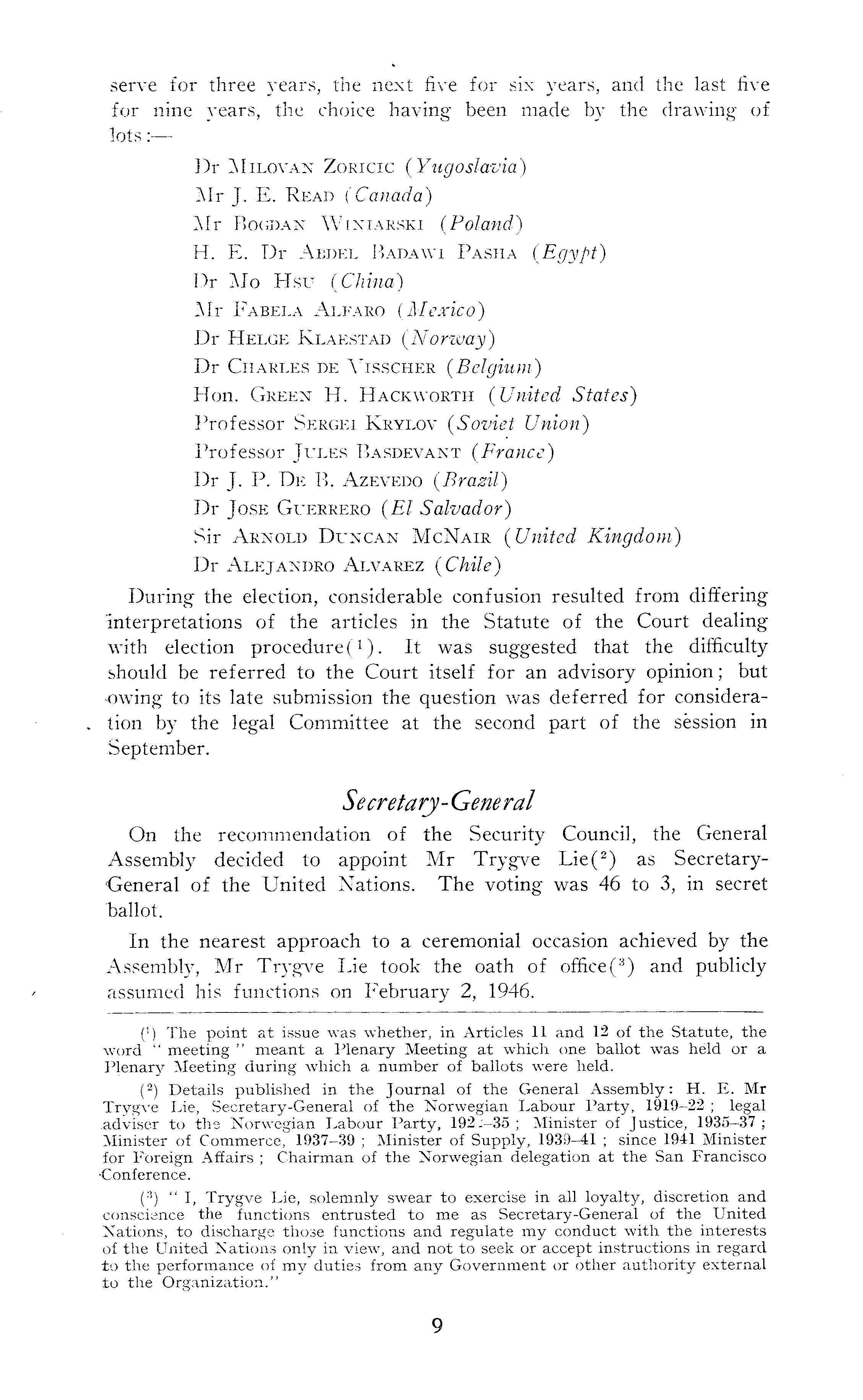 serve for three years, the next five for six years, and the last five for nine years, the choice having been made by the drawing of lots: — Dr Milovan Zoricic ( Yugoslavia) Mr J. E. Read (Canada) Mr Bogdan Winiarski (Poland) H. E. Dr Abdel Badawi Pasha {Egypt) Dr Mo Hsu {China) Mr Fabela Alfaro {Mexico) Dr Helge Klaestad {Norway) Dr Charles de Visscher {Belgium) Hon. Green H. Hackworth {United States) Professor Sergei Krylov {Sozriet Union) Professor Jules Basdevant {France) Dr J. P. De B. Azevedo {Brazil) Dr Jose Guerrero {EI Salvador) Sir Arnold Duncan McNair {United Kingdom) Dr Alejandro Alvarez {Chile) During the election, considerable confusion resulted from differing interpretations of the articles in the Statute of the Court dealing with election procedure ( 1 ). It was suggested that the difficulty should be referred to the Court itself for an advisory opinion; but owing to its late submission the question was deferred for consideration by the legal Committee at the second part of the session in September. Secretary- Gene ral On the recommendation of the Security Council, the General Assembly decided to appoint Mr Trygve Lie( 2 ) as SecretaryGeneral of the United Nations. The voting was 46 to 3, in secret Fallot. In the nearest approach to a ceremonial occasion achieved by the Assembly, Mr Trygve Lie took the oath of office( 3 ) and publicly assumed his functions on February 2, 1946.