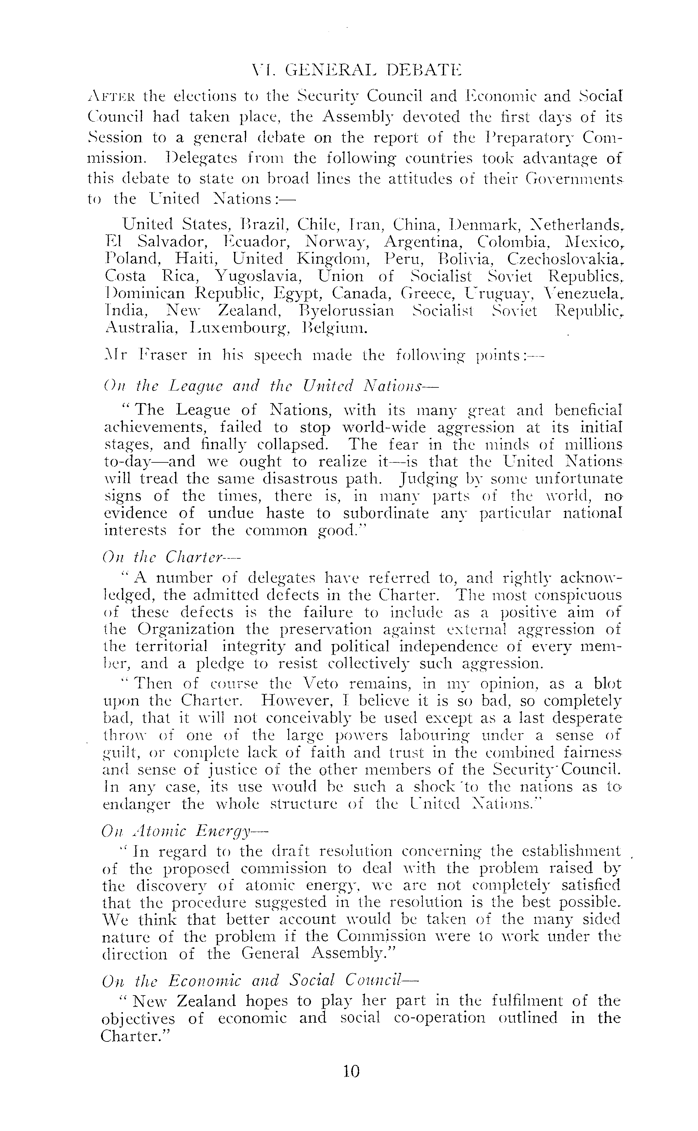 VI. GENERAL DEBATE After the elections to the Security Council and Economic and Social Council had taken place, the Assembly devoted the first days of its Session to a general debate on the report of the Preparatory Commission. Delegates from the following countries took advantage of this debate to state on broad lines the attitudes of their Governments to the United Nations United States, Brazil, Chile, Iran, China, Denmark, Netherlands, El Salvador, Ecuador, Norway, Argentina, Colombia, Mexico, Poland, Haiti, United Kingdom, Peru, Bolivia, Czechoslovakia, Costa Rica, Yugoslavia, Union of Socialist Soviet Republics, Dominican Republic, Egypt, Canada, Greece, Uruguay, Venezuela, India, New Zealand, Byelorussian Socialist Soviet Republic, Australia, Luxembourg, Belgium. Mr Fraser in his speech made the following points:— On the League and the United Nations—- " The League of Nations, with its many great and beneficial achievements, failed to stop world-wide aggression at its initial stages, and finally collapsed. The fear in the minds of millions to-day—and we ought to realize it —is' that the United Nations will tread the same disastrous path. Judging by some unfortunate signs of the times, there is, in many parts of the world, no evidence of undue haste to subordinate any particular national interests for the common good." On the Charter — " A. number of delegates have referred to, and rightly acknowledged, the admitted defects in the Charter. The most conspicuous of these defects is the failure to include as a positive aim of the Qrganization the preservation against external aggression of the territorial integrity and political independence of every member, and a pledge to resist collectively such aggression. " Then of course the Veto remains, in my opinion, as a blot upon the Charter. However, I believe it is so bad, so completely bad, that it will not conceivably be used except as a last desperate throw of one of the large powers labouring under a sense of guilt, or complete lack of faith and trust in the combined fairness and. sense of justice of the other members of the Security"Council. In any case, its use would be such a shock 'to the nations as to endanger the whole structure of the United Nations." On Atomic Energy — " In regard to the draft resolution concerning the establishment of the proposed commission to deal with the problem raised by the discovery of atomic energy, we are not completely satisfied that the procedure suggested in the resolution is the best possible. We think that better account would be taken of the many sided nature of the problem if the Commission were to work under the direction of the General Assembly." On the Economic and Social Council—- " New Zealand hopes to play her part in the fulfilment of the objectives of economic and social co-operation outlined in the Charter."