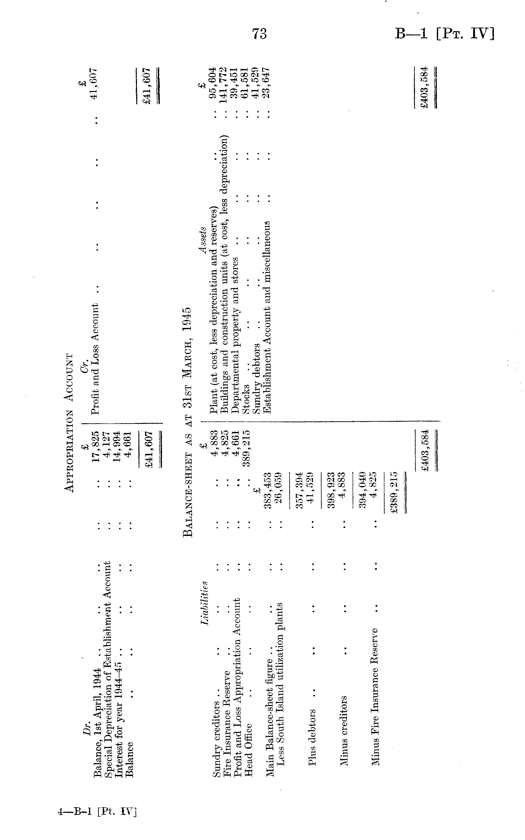 Dr. £ Cr. £ Balance, Ist April, 1944 .. .. .. •• •• 17,825 Profit and Loss Account .. .. .. .. .. 41,607 Special Depreciation of Establishment Account .. .. 4,127 Interest for year 1944-45 .. .. .. •• •• 14,994 Balance .. .. .. •• •• •• 4,661 £41,607 £41,607 Balance-sheet as at 31st March, 1945 Liabilities £ Assets £ Sundry creditors .. .. .. •• •• 4,883 Plant (at cost, less depreciation and reserves) .. .. 95,604 Fire Insurance Reserve .. .. .. •• •• 4,825 Buildings and construction units (at cost, less depreciation) .. 141,772 Profit and Loss Appropriation Account .. .. .. 4,661 Departmental property and stores .. .. .. ..39,451 Head Office ' 389,215 Stocks . 61,581 £ Sundry debtors .. .. .. .. .. .. 41,529 Main Balance-sheet figure .. .. .. •• 383,453 Establishment Account and miscellaneous .. .. .. 23,647 Less South Island utilization plants .. .. 26,059 357,394 Plus debtors .. .. •• •• •• 41,529 398,923 Minus creditors .. .. . • •• 4,883 394,040 Minus Fire Insurance Reserve .. .. .. 4,825 £389,215 £403,584 £403,584