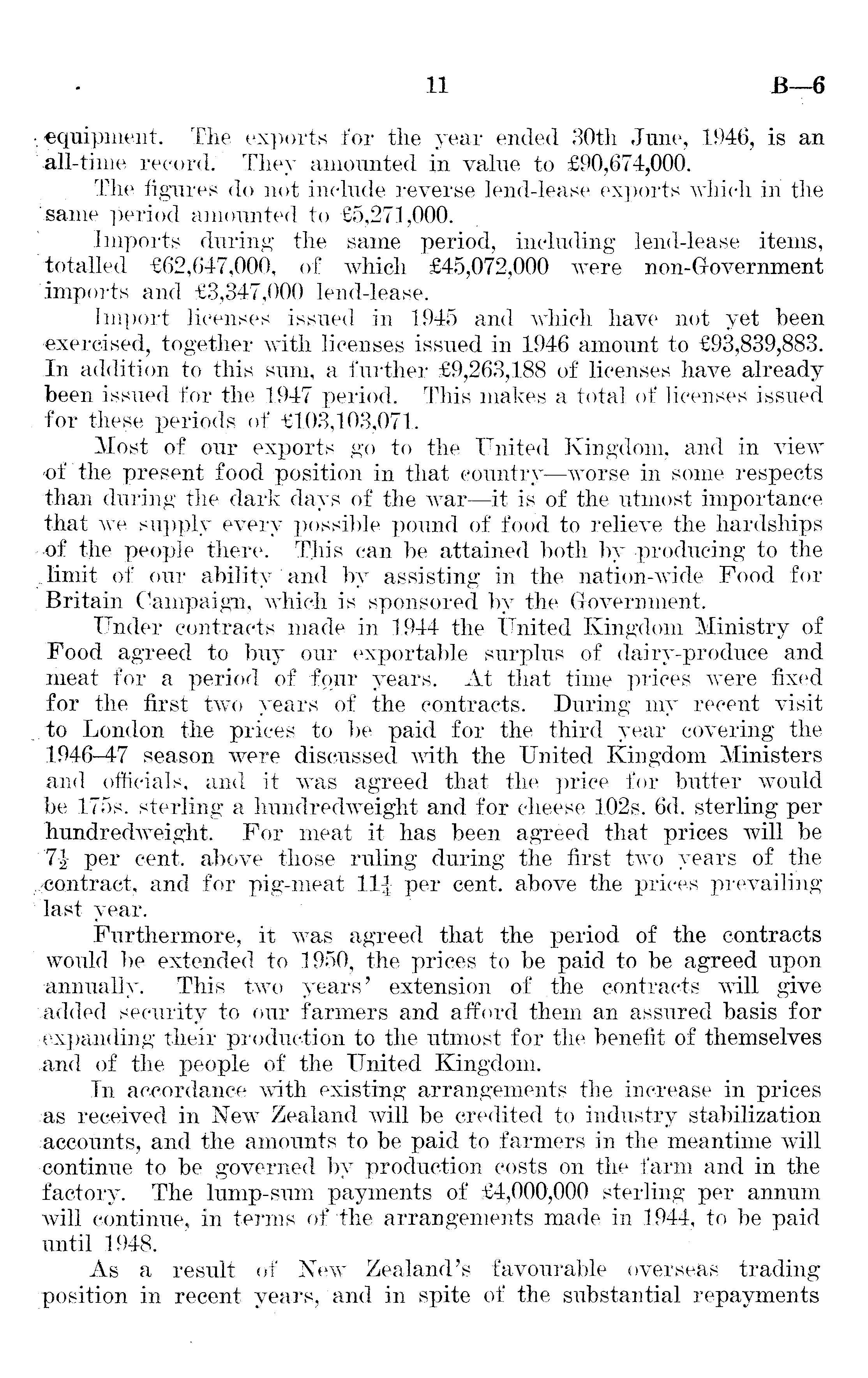 . -equipment. The exports for the year ended 30th June, 1946, is an all-time record. They amounted in value to £90,674,000. The figures do not include reverse lend-lease exports which in the .same period amounted to £5,271,000. Imports during the same period, including lend-lease items, totalled £62,647,000, of which £45,072,000 were non-Grovernment imports and £3,347,000 lend-lease. Import licenses issued in 1945 and which have not yet been exercised, together with licenses issued in 1946 amount to £93,839,883. In addition to this sum, a further £9,263,188 of licenses have already been issued for the 1947 period. This makes a total of licenses issued for these periods of £103,103,071. Most of our exports go to the United Kingdom, and in view of the present food position in that country—worse in some respects than during the dark days of the Avar —it is of the utmost importance that we supply every possible pound of food to relieve the hardships •of the people there. TJiis can be attained both by producing to the r limit of our ability and by assisting in the nation-wide Food for Britain Campaign, which is sponsored by the Government. Under contracts made in 1944 the United Kingdom Ministry of Pood agreed to buy our exportable surplus of dairy-produce and meat for a period of four years. At that time prices were fixed for the first two years of the contracts. During my recent visit to London the prices to be paid for the third year covering the 1946-47 season were discussed with the United Kingdom Ministers and officials, and it was agreed that the priee for butter would be 1755. sterling a hundredweight and for cheese 102s. 6d. sterling per hundredweight. For meat it has been agreed that prices will be 7} per cent, above those ruling during the first two years of the and for pig-meat 11| per cent, above the prices prevailing last year. Furthermore, it was agreed that the period of the contracts would be extended to 1950, the prices to be paid to be agreed upon annually. This two years' extension of the contracts will give wadded security to our farmers and afford them an assured basis for expanding their production to the utmost for the benefit of themselves :and of the people of the United Kingdom. In accordance with existing arrangements the increase in prices as received in New Zealand will be credited to industry stabilization accounts, and the amounts to be paid to farmers in the meantime will continue to be governed by production costs on the farm and in the factory. The lump-sum payments of £4,000,000 sterling per annum will continue, in terms of the arrangements made in 1944, to be paid until 1948. As a result of New Zealand's favourable overseas trading position in recent years, and in spite of the substantial repayments