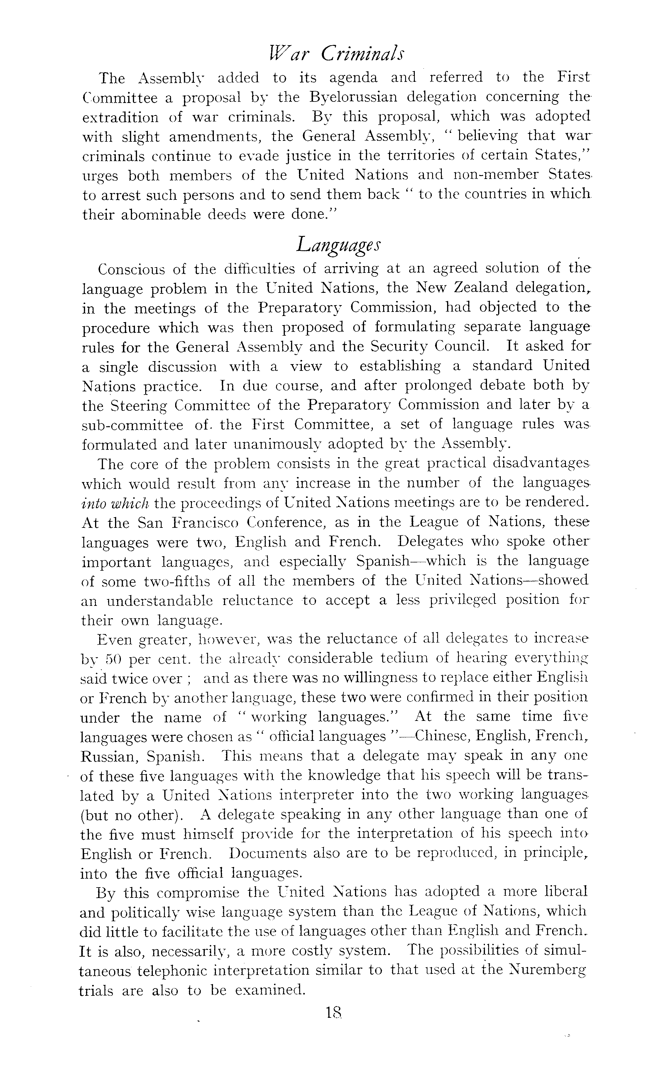 War Criminals The Assembly added to its agenda and referred to the First Committee a proposal by the Byelorussian delegation concerning the extradition of war criminals. By this proposal, which was adopted with slight amendments, the General Assembly, " believing that war criminals continue to evade justice in the territories of certain States," urges both members of the United Nations and non-member States to arrest such persons and to send them back " to the countries in which their abominable deeds were done." Languages Conscious of the difficulties of arriving at an agreed solution of the language problem in the United Nations, the New Zealand delegation, in the meetings of the Preparatory Commission, had objected to the procedure which was then proposed of formulating separate language rules for the General Assembly and" the Security Council. It asked for a single discussion with a view to establishing a standard United Nations practice. In due course, and after prolonged debate both by the Steering Committee of the Preparatory Commission and later by a sub-committee of. the First Committee, a set of language rules was formulated and later unanimously adopted by the Assembly. The core of the problem consists in the great practical disadvantages which would result from any increase in the number of the languages into which the proceedings of United Nations meetings are to be rendered. At the San Francisco Conference, as in the League of Nations, these languages were two, English and French. Delegates who spoke other important languages, and especially Spanish —which is the language of some two-fifths of all the members of the United Nations —showed an understandable reluctance to accept a less privileged position for their own language. Even greater, however, was the reluctance of all delegates to increase by 50 per cent, the already considerable tedium of hearing everything said twice over ; and as there was no willingness to replace either English or French by another language, these two were confirmed in their position under the name of "working languages." At the same time five, languages were chosen as " official languages " —Chinese, English, French, Russian, Spanish. This means that a delegate may speak in any one of these five languages with the knowledge that his speech will be translated by a United Nations interpreter into the two working languages (but no other). A delegate speaking in any other language than one of the five must himself provide for the interpretation of his speech into English or French. Documents also are to be reproduced, in principle, into the five official languages. By this compromise the United Nations has adopted a more liberal and politically wise language system than the League of Nations, which did little to facilitate the use of languages other than English and French. It is also, necessarily, a more costly system. The possibilities of simultaneous telephonic interpretation similar to that used at the Nuremberg trials are also to be examined.