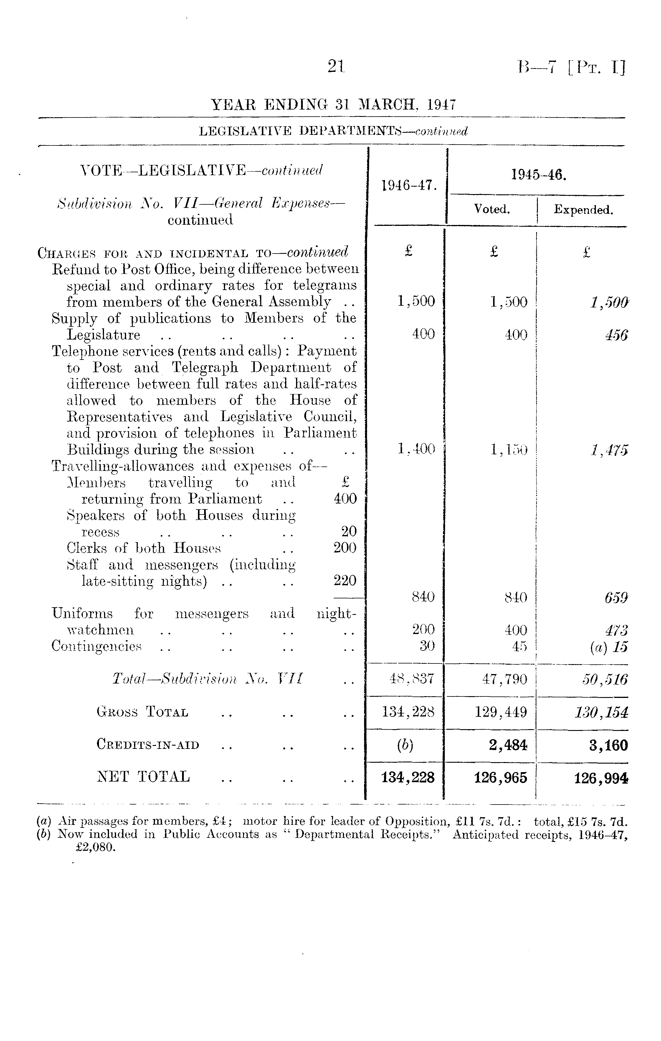 (a) Air passages for members, £4; motor hire for leader of Opposition, £ll 7s. 7d.: total, £l5 7s. 7d. (b) Now included in Public Accounts as " Departmental Receipts." Anticipated receipts, 1946-47, £2,080.