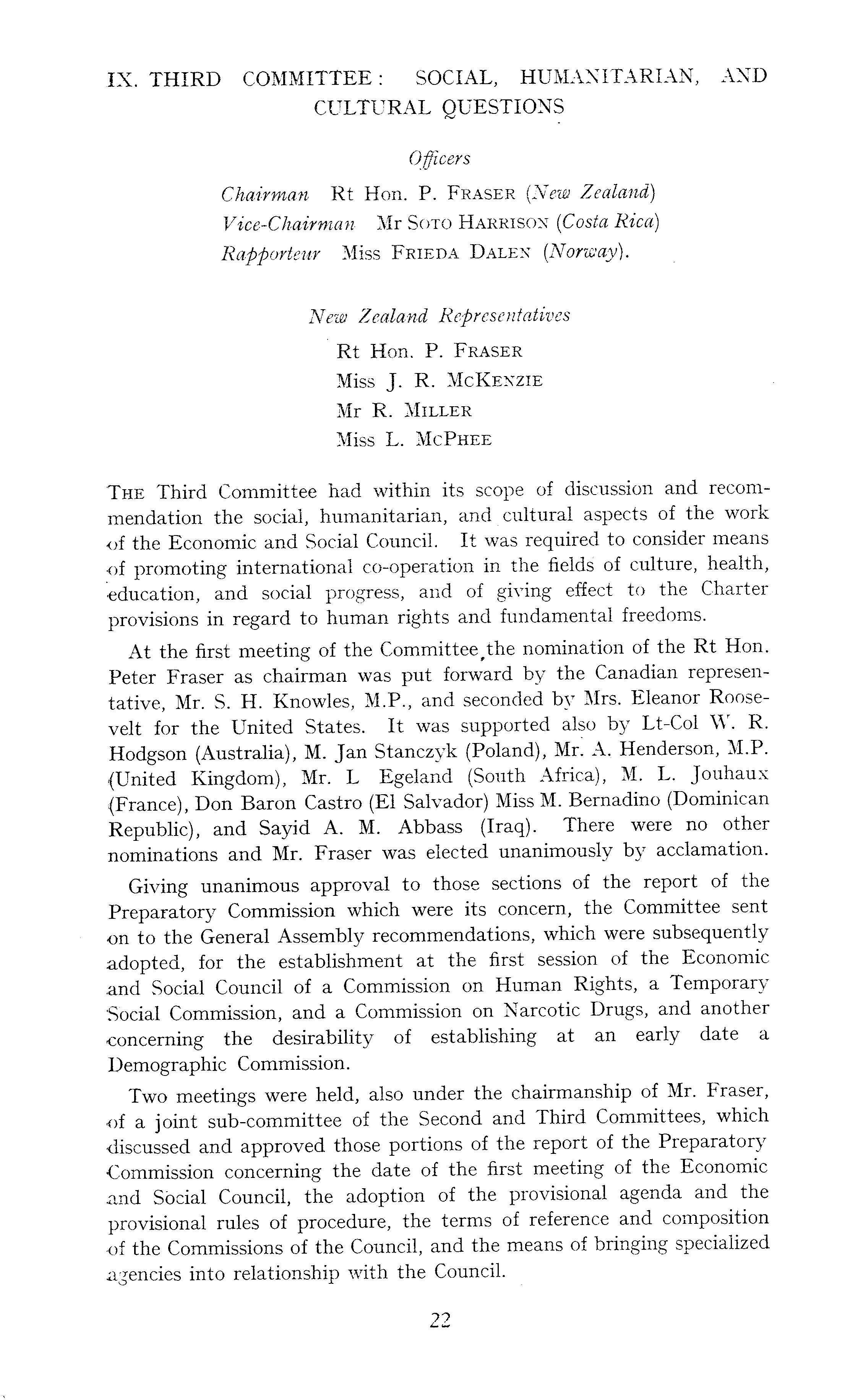 IX. THIRD COMMITTEE: SOCIAL, HUMANITARIAN, AND CULTURAL QUESTIONS Officers Chairman Rt Hon. P. Fraser (New Zealand) Vice-Chairman Mr Soto Harrison (iCosta Rica) Rapporteur Miss Frieda Dalen (Norway). New Zealand Representatives Rt Hon. P. Fraser Miss J. R. McKenzie Mr R. Miller Miss L. McPhee The Third Committee had within its scope of discussion and recommendation the social, humanitarian, and cultural aspects of the work of the Economic and Social Council. It was required to consider means of promoting international co-operation in the fields of culture, health, education, and social progress, and of giving effect to the Charter provisions in regard to human rights and fundamental freedoms. At the first meeting of the Committee # the nomination of the Rt Hon. Peter Fraser as chairman was put forward by the Canadian representative, Mr. S. H. Knowles, M.P., and seconded by Mrs. Eleanor Roosevelt for the United States. It was supported also by Lt-Col W. R. Hodgson (Australia), M. Jan Stanczyk (Poland), Mr. A. Henderson, M.P. {United Kingdom), Mr. L Egeland (South Africa), M. L. Jouhaux {France), Don Baron Castro (El Salvador) Miss M. Bernadino (Dominican Republic), and Sayid A. M. Abbass (Iraq). There were no other nominations and Mr. Fraser was elected unanimously by acclamation. Giving unanimous approval to those sections of the report of the Preparatory Commission which were its concern, the Committee sent on to the General Assembly recommendations, which were subsequently adopted, for the establishment at the first sessionooff f the Economic and Social Council of a Commission on Human Rights, a Temporary Social Commission, and a Commission on Narcotic Drugs, and another concerning the desirability of establishing at an early date a Demographic Commission. Two meetings were held, also under the chairmanship of Mr. Fraser, of a joint sub-committee of the Second and Third Committees, which discussed and approved those portions of the report of the Preparatory Commission concerning the date of the first meeting of the Economic and Social Council, the adoption of the provisional agenda and the provisional rules of procedure, the terms of reference and composition of the Commissions of the Council, and the means of bringing specialized agencies into relationship with the Council.