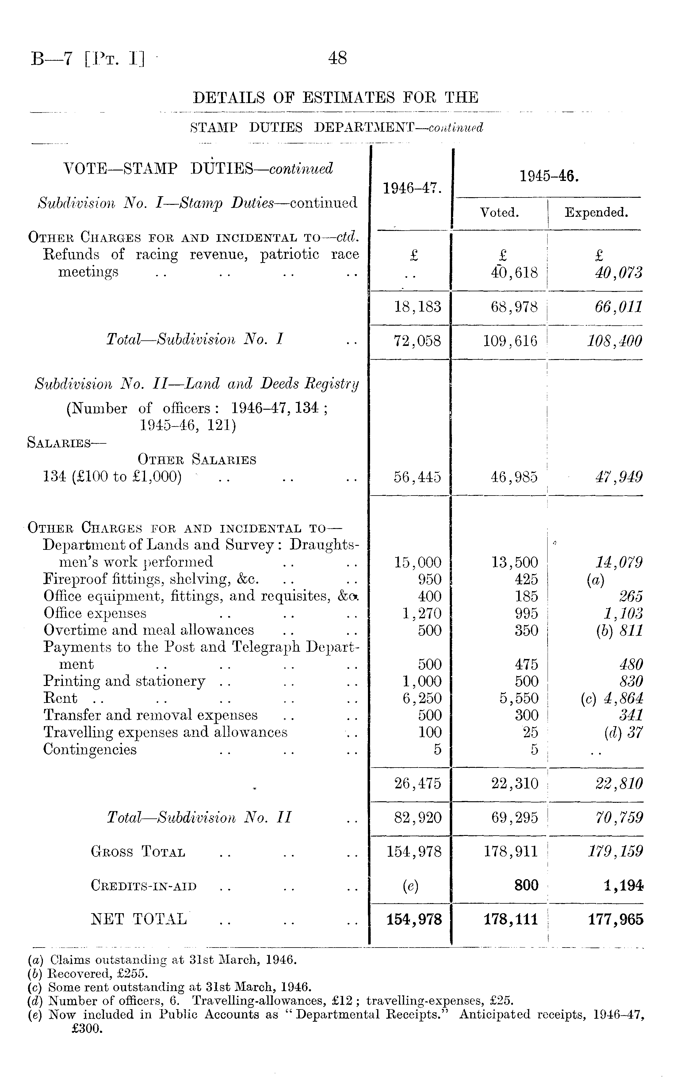 \ VOTE—STAMP DUTIES—continued 1946-47. 1945-46. Subdivision No. I—Stamp Duties—continued Voted. Expended. Other Charges for and incidental to —ctd. Refunds of racing revenue, patriotic race meetings .. .. £ £ 40,618 £ 40,073 18,183 68,978 66,011 Total—Subdivision No. I 72,058 109,616 108,400 Subdivision No. II —Land and Deeds Registry (Number of officers : 1946-47,134 ; 1945-46, 121) Salaries — Other Salaries 134 (£100 to £1,000) * .. 56,445 46,985 47,949 Other Charges for and incidental to — Department of Lands and Survey : Draughtsmen's work performed Fireproof fittings, shelving, &c. Office equipment, fittings, and requisites, &». Office expenses Overtime and meal allowances Payments to the Post and Telegraph Department Printing and stationery Rent Transfer and removal expenses Travelling expenses and allowances Contingencies 15,000 950 400 1,270 500 500 1,000 6,250 500 100 5 13,500 425 185 995 350 475 500 5,550 300 25 5 14,079 (a) 265 1,103 (b) 811 480 830 (c) 4,864 341 (d) 37 - 26,475 22,310 22,810 Total —Subdivision No. II 82,920 69,295 70,759 Gross Total 154,978 178,911 179,159 Credits-in-aid (e) 800 1,194 NET TOTAL 154,978 178,1H 177,965