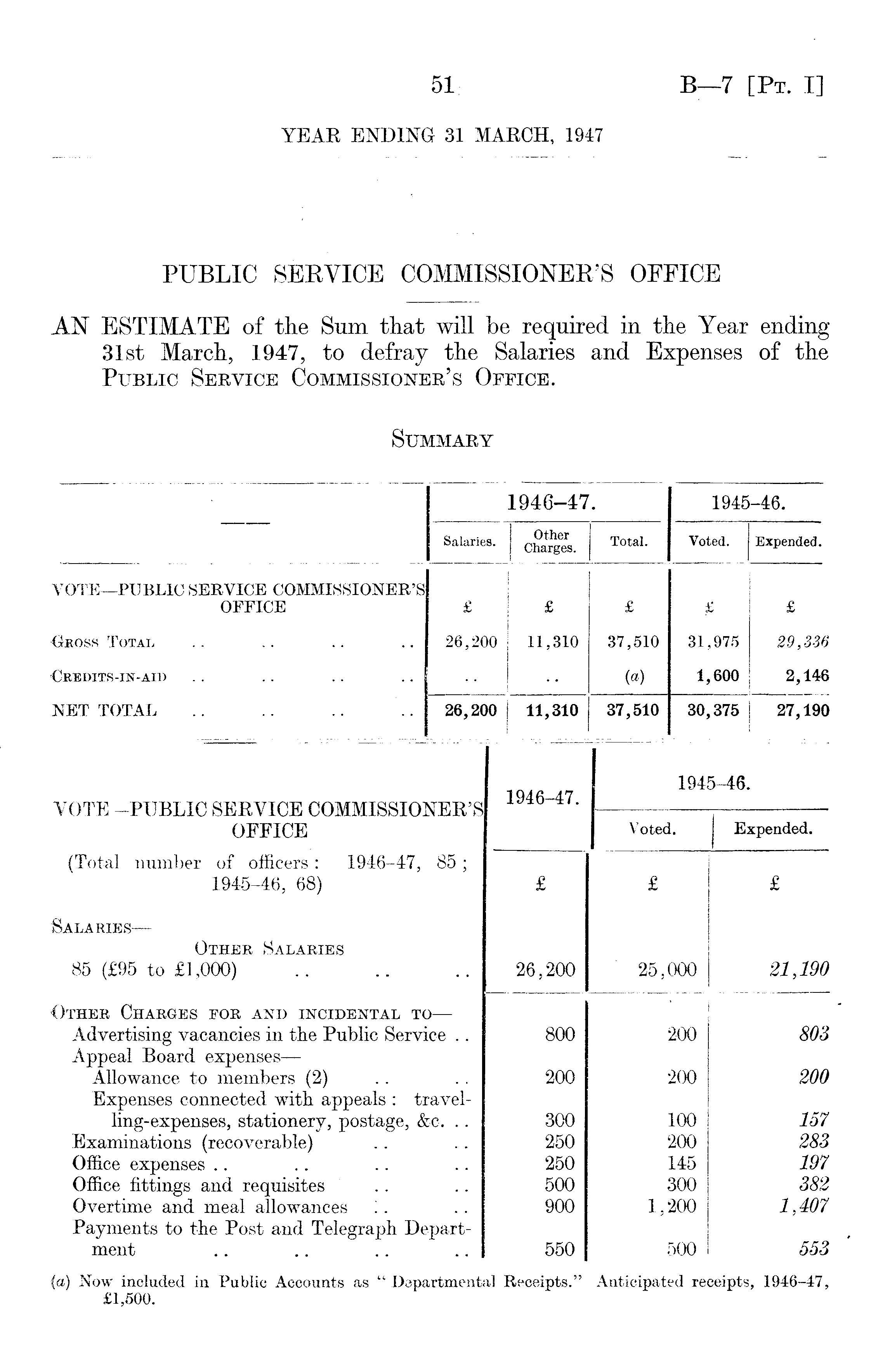 AN ESTIMATE of the Sum that will be required in the Year ending 31st March, 1947, to defray the Salaries and Expenses of the Public Service Commissioner's Office. Summary
