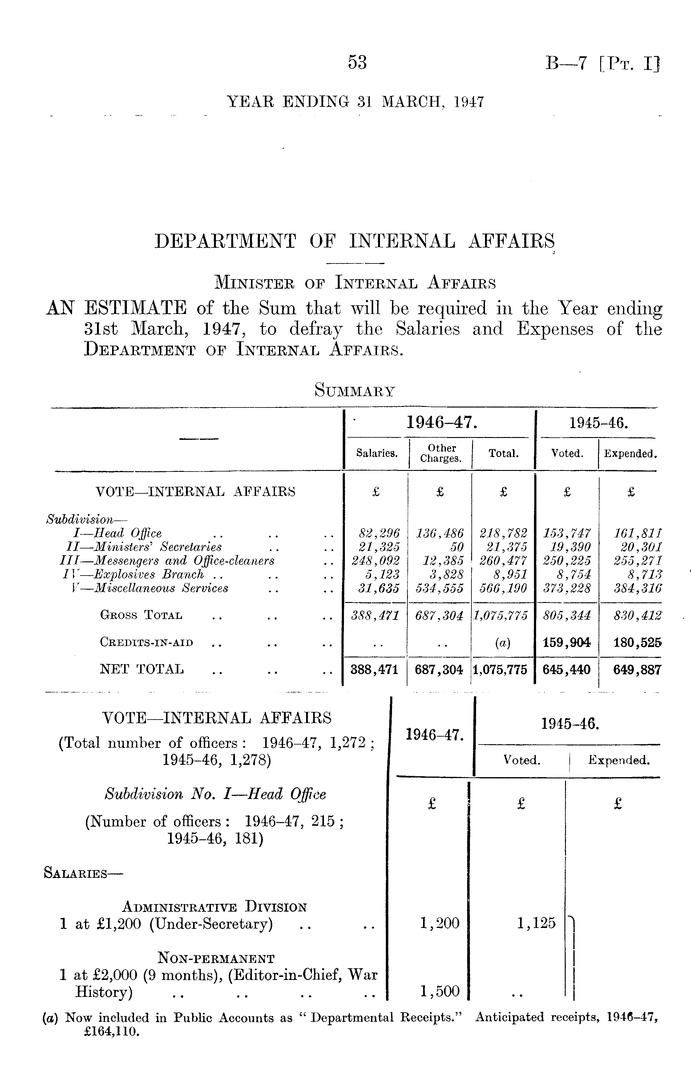 1946-47 1945-46. Salaries. Other Charges. Total. Voted. Expended. VOTE—INTERNAL AFFAIRS £ £ £ £ £ Subdivision— I—Head Office II—Ministers' Secretaries III—Messengers and Office-cleaners IV—Explosives Branch V—Miscellaneous Services 82,296 21,325 248,092 5,123 31,635 136,486 50 12,385 3,828 534,555 218,782 21,375 260,477 8,951 566,190 153,747 19,390 250,225 8,754 373,228 161,811 20,301 255,271 8,713 384,316 Gross Total 388,471 687,304 1,075,775 805,344 830,412 Credits-in-aid (a) 159,904 180,525 NET TOTAL 388,471 687,304 1,075,775 645,440 649,887 VOTE—INTERNAL AFFAIRS (Total number of officers : 1946-47, 1,272 ; 1945-46, 1,278) 1946-47. 1945-46. Voted. | Expended. Subdivision No. I —Head Office £ £ £ (Number of officers : 1946-47, 215 ; 1945-46, 181) Salaries— Administrative Division 1 at £1,200 (Under-Secretary) 1,200 1,125 1 N ON-PERMANENT 1 at £2,000 (9 months), (Editor-in-Chief, War History) 1,500 (a) Now included in Public Accounts as " Departmental Receipts." £164,110. Anticipated receipts, 1946-47,