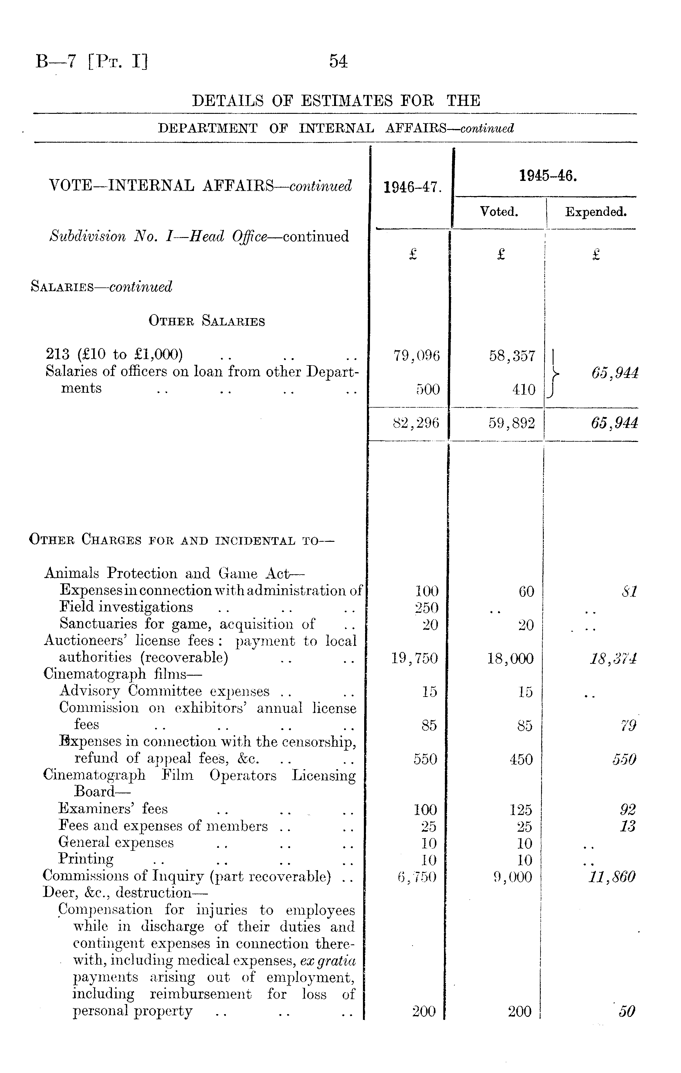 VOTE—INTERNAL AFFAIRS—continued 1946-47. 1945-46. Voted. Expended. Subdivision No. I —Head Office —continued £ £ £ Salaries—continued Other Salaries 213 (£10 to £1,000) 79,096 58,357 I Salaries of officers on loan from other Departj- 65,944 ments 500 410 82,296 59,892 65,944 Other Charges for and incidental to — Animals Protection and Game Act— Expenses in connection with administration of 100 60 81 Field investigations 250 . , Sanctuaries for game, acquisition of 20 20 Auctioneers' license fees: payment to local authorities (recoverable) 19,750 18,000 18,374 Cinematograph films — Advisory Committee expenses 15 15 Commission on exhibitors' annual license fees 85 85 79 Expenses in connection with the censorship, refund of appeal fees, &c. 550 450 550 Cinematograph Film Operators Licensing Board— Examiners' fees ... ... 100 125 92 Fees and expenses of members 25 25 13 General expenses 10 10 Printing 10 10 • • Commissions of Inquiry (part recoverable) .. 6,750 9,000 11,860 Deer, &c., destruction— Compensation for injuries to employees while in discharge of their duties and contingent expenses in connection therewith, including medical expenses, ex gratia payments arising out of employment, including reimbursement for loss of personal property .. 200 200 50