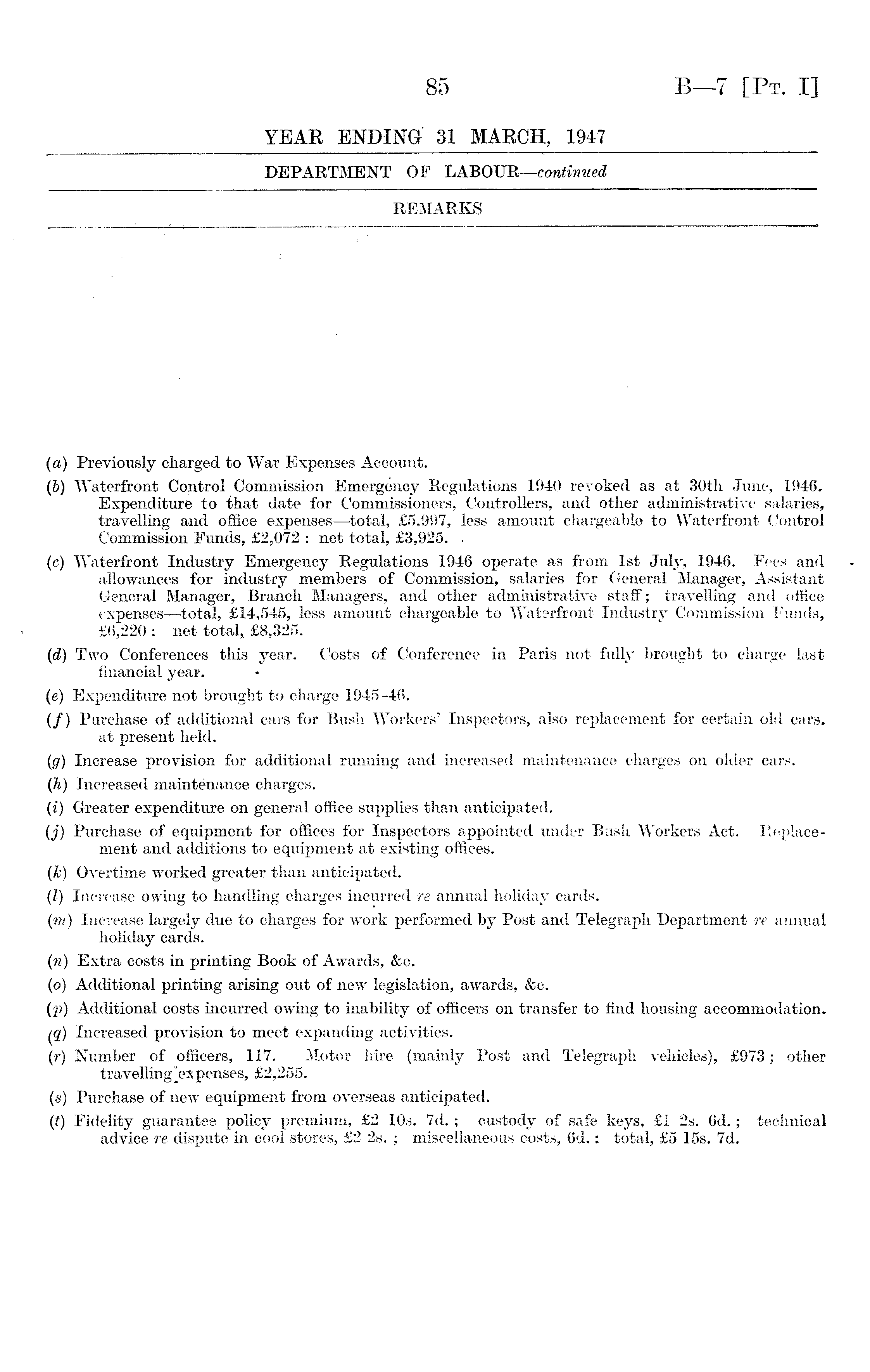 (а) Previously charged to War Expenses Account. (б) Waterfront Control Commission Emergency Regulations 1940 revoked as at 30th June, 1946. Expenditure to that date for Commissioners, Controllers, and other administrative salaries, travelling and office expenses—total, £5,997, less amount chargeable to Waterfront Control Commission Funds, £2,072 : net total, £3,925. . (c) Waterfront Industry Emergency Regulations 1946 operate as from Ist July, 1946. Fees and allowances for industry members of Commission, salaries for General Manager, Assistant General 'Manager, Branch Managers, and other administrative staff; travelling and office expenses —total, £14,545, less amount chargeable to Waterfront Industry Commission Funds, £6,220 : net total* £8,325. (d) Two Conferences this year. Costs of Conference in Paris not fully brought to charge last financial year. (e) Expenditure not brought to charge 1945-46. (/) Purchase of additional cars for Bush Workers' Inspectors, also replacement for certain old cars, at present held. (g) Increase provision for additional running and increased maintenance charges on older cars. (Ji) Increased maintenance charges. (i) Greater expenditure on general office supplies than anticipated. (j) Purchase of equipment for offices for Inspectors appointed under Bush Workers Act. Replacement and additions to equipment at existing offices. {k) Overtime worked greater than anticipated. (I) Increase owing to handling charges incurred re annual holiday cards. (m) Increase largely due to charges for work performed by Post and Telegraph Department re annual holiday cards. (n) Extra costs in printing Book of Awards, &c. (o) Additional printing arising out of new legislation, awards, &c. (p) Additional costs incurred owing to inability of officers on transfer to find housing accommodation. fq) Increased provision to meet expanding activities. (r) Number of officers, 117. Motor hire (mainly Post and Telegraph vehicles), £973; other travelling'expenses, £2,255. (s) Purchase of new equipment from overseas anticipated. (t) Fidelity guarantee policy premium, £2 10s. 7d.; custody of safe keys, £1 2s. 6d.; technical advice re dispute in cool stores, £2 2s. ; miscellaneous costs, 6d.: total, £5 15s. 7d.