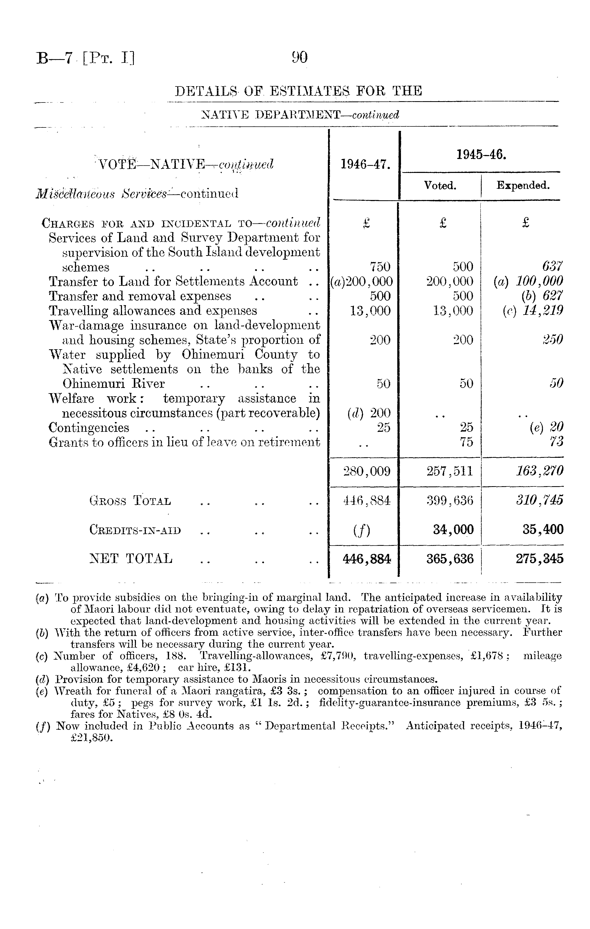 (а) To provide subsidies on the bringing-in of marginal land. The anticipated increase in availability of Maori labour did not eventuate, owing to delay in repatriation of overseas servicemen. It is expected that land-development and housing activities will be extended in the current year. (б) With the return of officers from active service, inter-office transfers have been necessary. Further transfers will be necessary during the current year. (c) Number of officers, 188. Travelling-allowances, £7,790, travelling-expenses, £1,678 ; mileage allowance, £4,620 ; car hire, £l3l. (d) Provision for temporary assistance to Maoris in necessitous circumstances. (e) Wreath for funeral of a Maori rangatira, £3 35.; compensation to an officer injured in course of duty, £5; pegs for survey work, £1 Is. 2d.; fidelity-guarantee-insurance premiums, £3 55.; fares for Natives, £8 os. 4d. (/) Now included in Public Accounts as " Departmental Receipts." Anticipated receipts, 1946-47, £21,850.