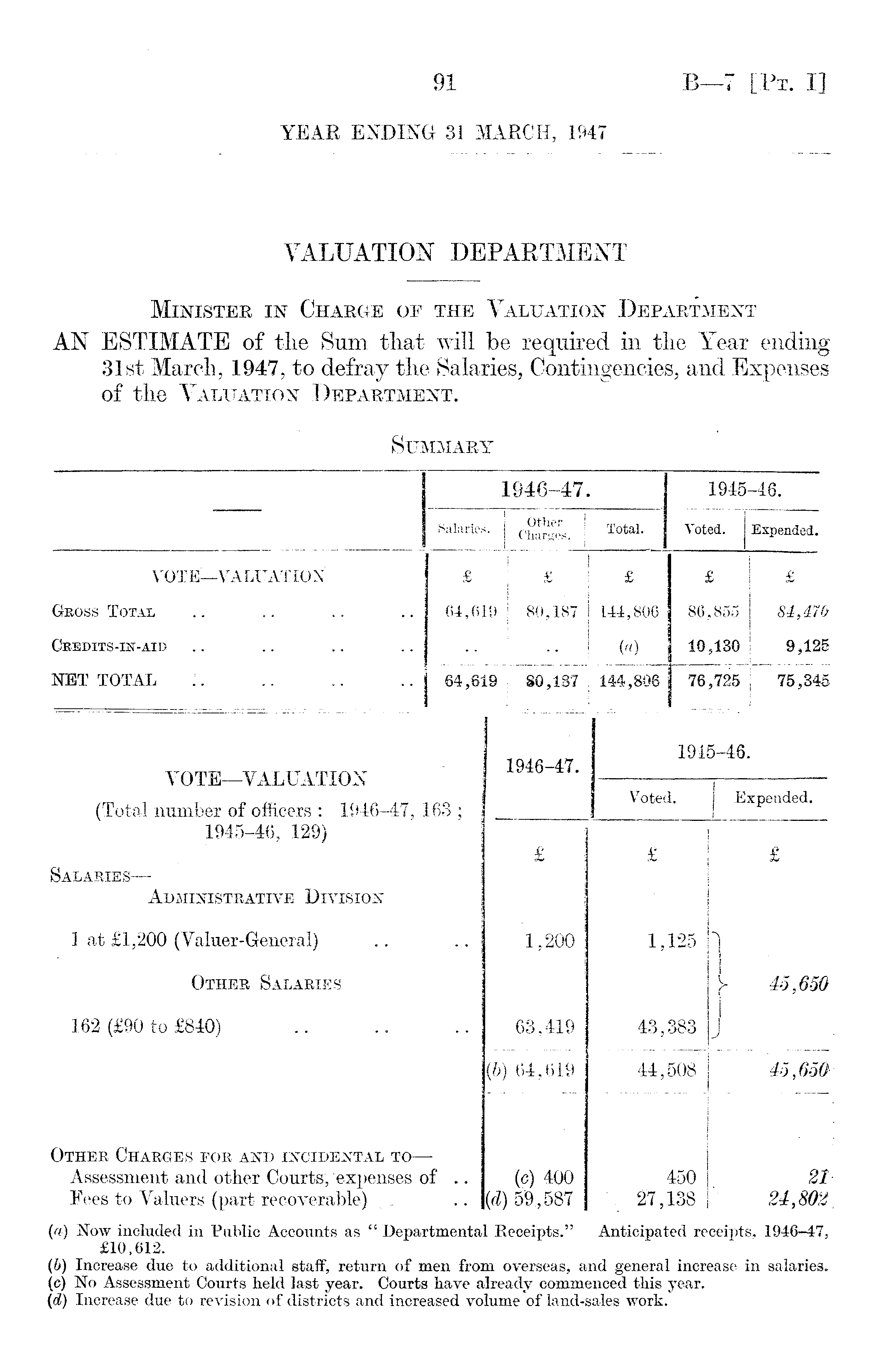 Minister in Charge of the Valuation Department AN ESTIMATE of the Sum that will be required in the Year ending 31st March, 1947, to defray the Salaries, Contingencies, and Expenses of the Valuation Department. Summary