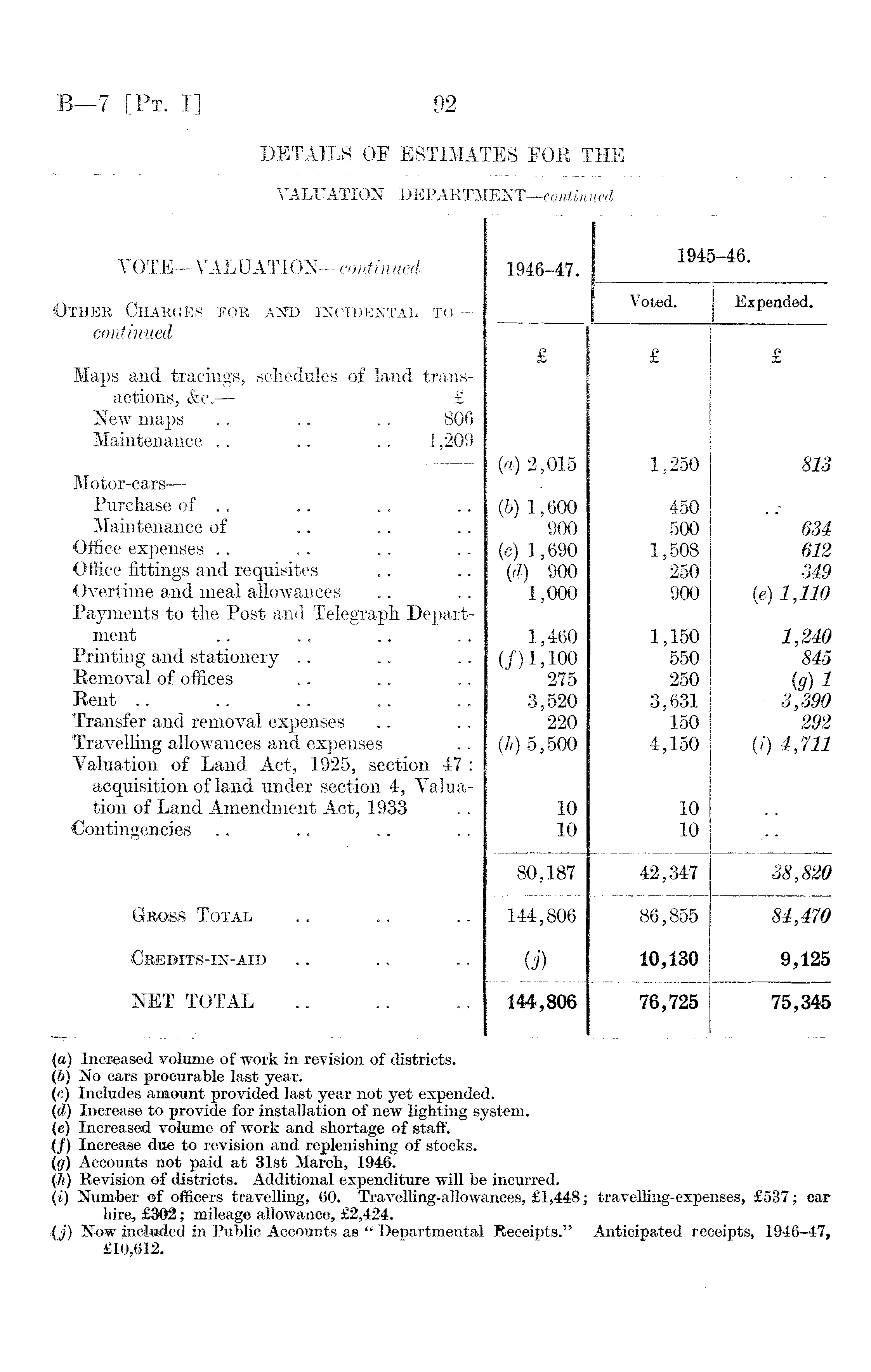 (a) Increased volume of work in revision of districts. (b) No cars procurable last year. (c) Includes amount provided last year not yet expended. (d) Increase to provide for installation of new lighting system. (e) Increased volume of work and shortage of staff. (f) Increase due to revision and replenishing of stocks. (g) Accounts not paid at 31st March, 1946. (h) Revision of districts. Additional expenditure will be incurred. \i) Number -of officers travelling, 60. Travelling-allowances, £1,448; travelling-expenses, £537; car hire, £302; mileage allowance, £2,424. (j) Now included in Public Accounts as " Departmental Receipts." Anticipated receipts, 1946-47, £10,612.