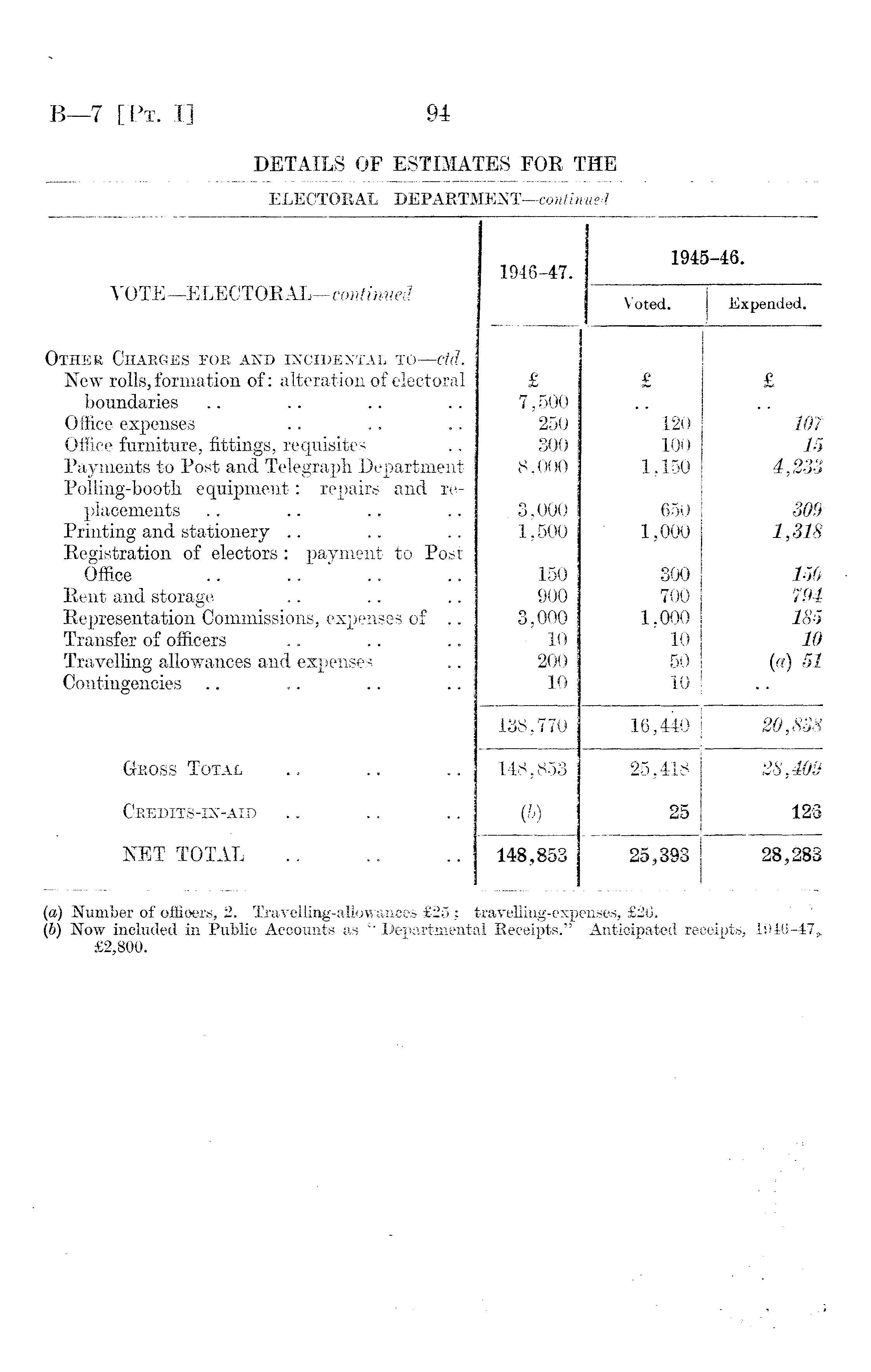 1945-46. 1946-47. Y OTE —ELECTORAL —continued Voted. Expended. Other Charges for and incidental to —ctd. New rolls, formation of: alteration of electoral £ £ £ boundaries 7,500 Office expenses 250 120 107 Office furniture, fittings, requisites 300 100 15 Payments to Post and Telegraph Department 8,000 1,150 4,233 Polling-booth equipment: repairs and replacements 3,000 650 309 Printing and stationery 1,500 1,000 1,318 Registration of electors: payment to Post Office 150 300 150 Rent and storage 900 700' 794 Representation Commissions, expenses of .. 3,000 1,000 185 Transfer of officers ■ 10 10 10 Travelling allowances and expenses 200 50 (a) 51 Contingencies 10 10 138,770 16,440 20,838 Gross Total .. 148,853 25,418 28,409 Credits-in-aid (b) 25 126 NET TOTAL 148,853 25,393 28,283