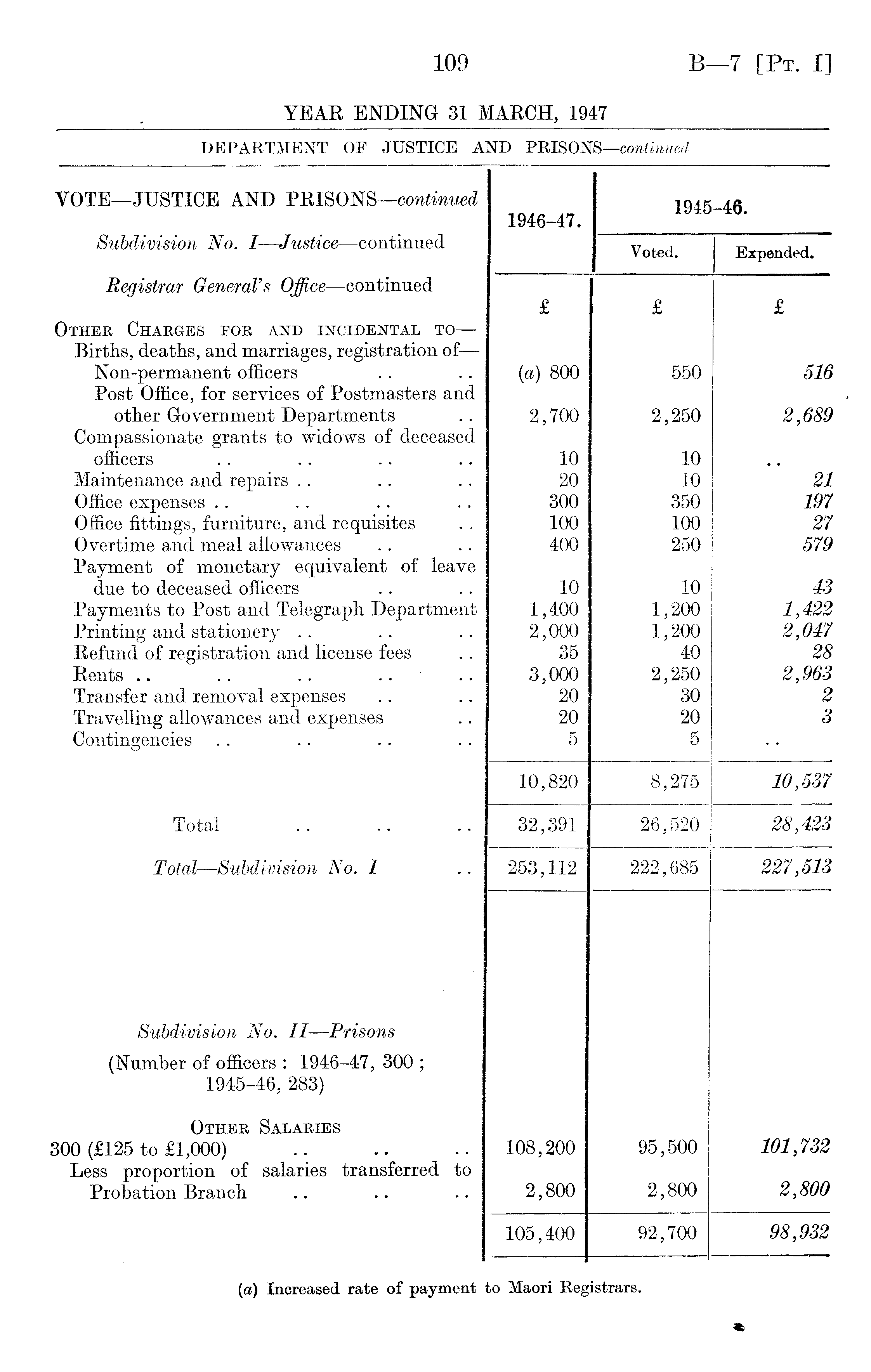 VOTE—JUSTICE AND PRISONS —continued 194fi-4.fi 1946-47. Subdivision No. I —Justice —continued Voted. Expended. Registrar General's Office —continued £ £ £ Other Charges for and incidental to — Births, deaths, and marriages, registration of — Non-permanent officers (a) 800 550 516 Post Office, for services of Postmasters and other Government Departments 2,700 2,250 2,689 Compassionate grants to widows of deceased officers 10 10 Maintenance and repairs 20 10 21 Office expenses 300 350 197 Office fittings, furniture, and requisites 100 100 27 Overtime and meal allowances 400 250 579 Payment of monetary equivalent of leave due to deceased officers 10 10 43 Payments to Post and Telegraph Department 1,400 1,200 1,422 Printing and stationery 2,000 1,200 2,047 Refund of registration and license fees 35 40 28 Rents .. .. .. 3,000 2,250 2,963 Transfer and removal expenses 20 30 2 Travelling allowances and expenses 20 20 3 Contingencies 5 5 10,820 8,275 10,537 Total 32,391 26,520 28,423 Total —Subdivision No. I 253,112 222,685 227,513 Subdivision No. II —Prisons (Number of officers : 1946-47, 300 ; 1945-46, 283) Other Salaries 300 (£125 to £1,000) 108,200 95,500 101,732 Less proportion of salaries transferred to 2,800 Probation Branch 2,800 2,800 105,400 92,700 98,932 (a) Increased rate of payment fco Maori Reg istrars.