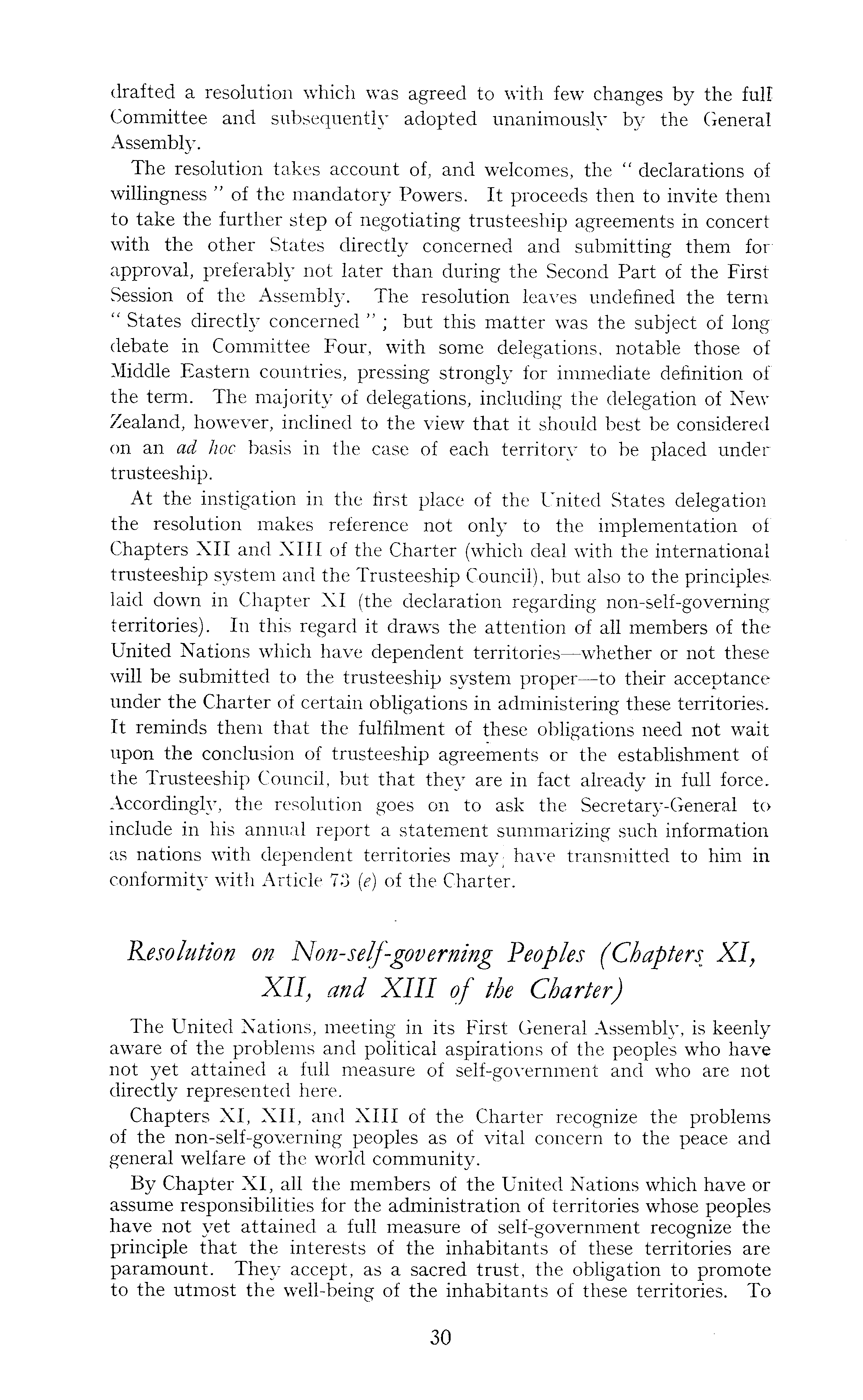 drafted a resolution which was agreed to with few changes by the full Committee and subsequently adopted unanimously by the General Assembly. The resolution takes account of, and welcomes, the " declarations of willingness "of the mandatory Powers. It proceeds then to invite them to take the further step of negotiating trusteeship agreements in concert with the other States directly concerned and submitting them for' approval, preferably not later than during the Second Part of the First Session of the Assembly. The resolution leaves undefined the term " States directly concerned " ; but this matter was the subject of long debate in Committee Four, with some delegations, notable those of Middle Eastern countries, pressing strongly for immediate definition of the term. The majority of delegations, including the delegation of New Zealand, however, inclined to the view that it should best be considered on an ad hoc basis in the case of each territory to be placed under trusteeship. At the instigation in the first place of the United States delegation the resolution makes reference not only to the implementation of Chapters XII and XIII of the Charter (which deal with the international trusteeship system and the Trusteeship Council), but also to the principles laid down in Chapter XI (the declaration regarding non-self-governing territories). In this regard it draws the attention of all members of the United Nations which have dependent territories—whether or not these will be submitted to the trusteeship system proper —to their acceptance under the Charter of certain obligations in administering these territories. It reminds them that the fulfilment of these obligations need not wait upon the conclusion of trusteeship agreements or the establishment of the Trusteeship Council, but that they are in fact already in full force. Accordingly, the resolution goes on to ask the Secretary-General to include in his annual report, a statement summarizing such information as nations with dependent territories may J have transmitted to him in conformity with Article 73 (e) of the Charter. Resolution on Non-self- governing Peoples (Chapters; XI, XII, and XIII of the Charter) The United Nations, meeting in its First General Assembly, is keenly aware of the problems and political aspirations of the peoples who have not yet attained a full measure of self-government and who are not directly represented here. Chapters XI, XII, and XIII of the Charter recognize the problems of the non-self-governing peoples as of vital concern to the peace and general welfare of the world community. By Chapter XI, all the members of the United Nations which have or assume responsibilities for the administration of territories whose peoples have not yet attained a full measure of self-government recognize the principle that the interests of the inhabitants of these territories are paramount. They accept, as a sacred trust, the obligation to promote to the utmost the well-being of the inhabitants of these territories. To