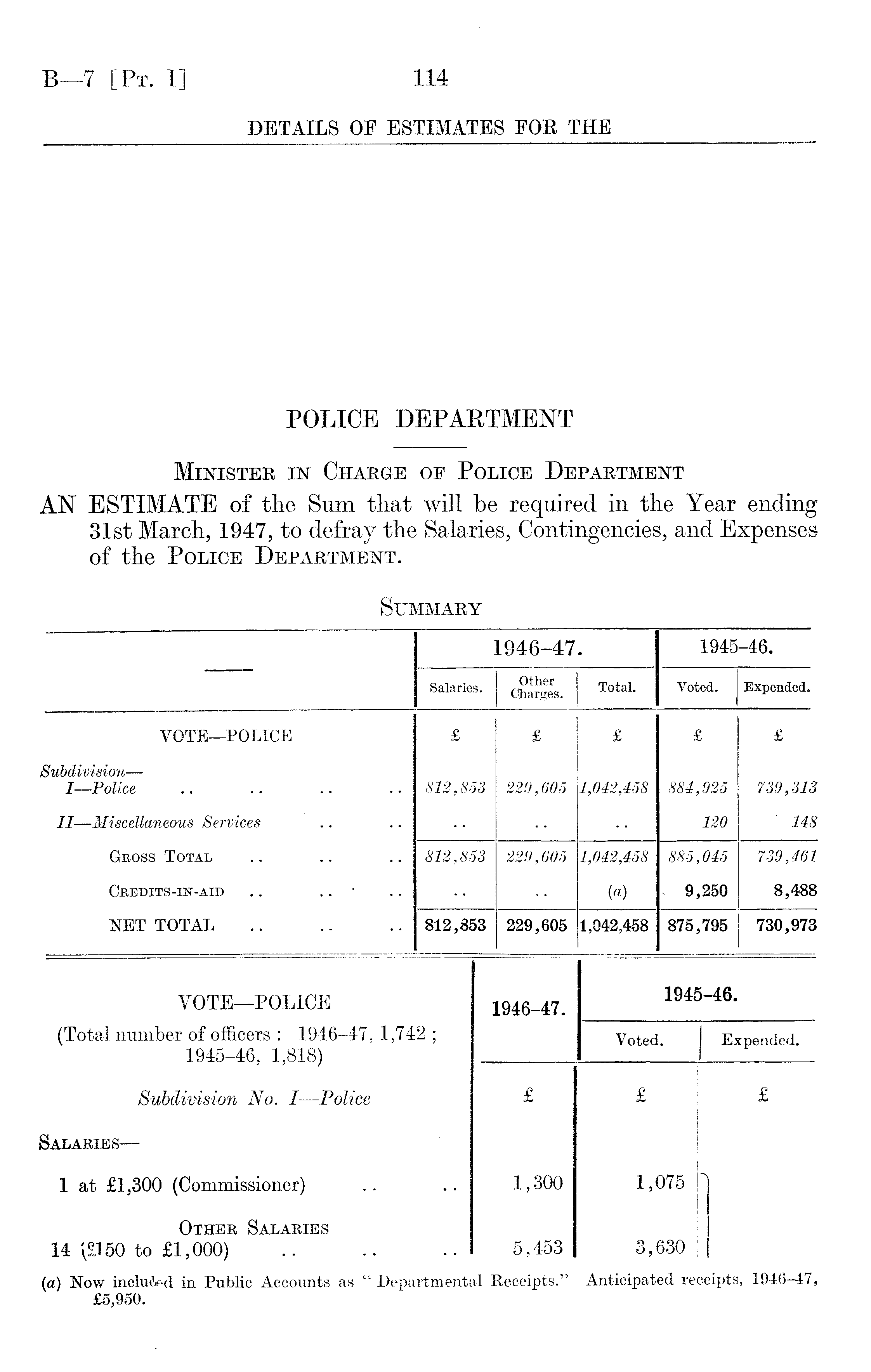 1946-47. 1945-46. Salaries. Other Charges. Total. Voted. Expended. VOTE—POLICE Subdivision— I—Police II —Miscellaneous Services Gkoss Total Credits-IN-AID .. .. • NET TOTAL £ 812,853 £ 229,605 £ 1,042,458 £ 884,925 120 £ 739,313 ' 148 812,853 229,605 1,042,458 (a) 885,045 - 9,250 739,461 8,488 812,853 229,605 1,042,458 875,795 730,973 VOTE—POLICE (Total number of officers : 1946-47,1,742 ; 1945-46, 1,818) Subdivision No. I—Police Salaries — 1 at £1,300 (Commissioner) Other Salaries 14 $050 to £1,000) (a) Now included in Public Accounts as " Departments £5,950. 1946-47. 1945-46. Voted. Expended. £ 1,300 5,453 il Receipts." £ 1,075 3,630 Anticipated rec £ ;eipts, 1946-47,