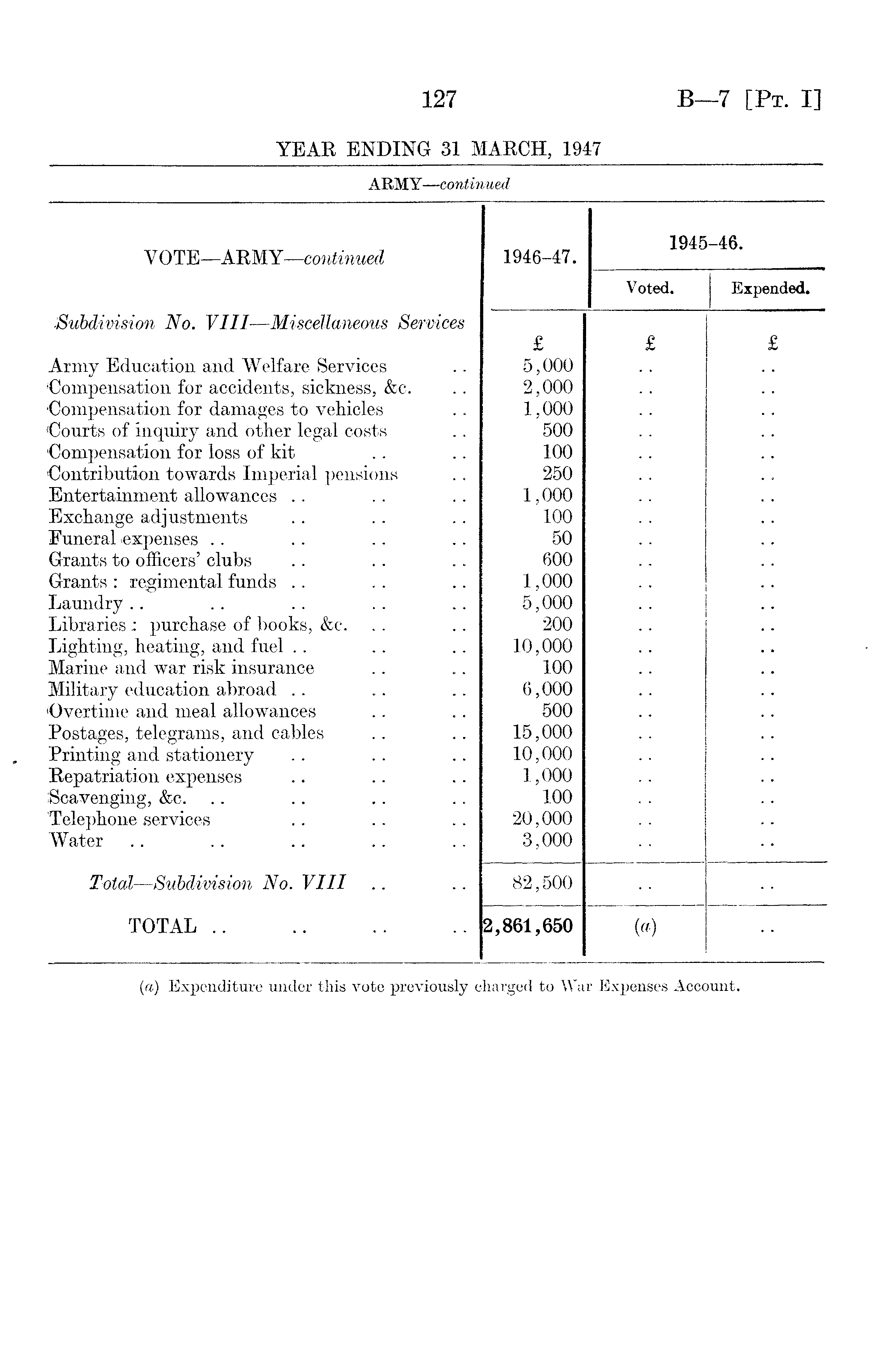 1945-46. Y OTE —ARMY—continued 1946-47. Voted. Expended. Subdivision No. VIII—Miscellaneous Services £ £ £ Army Education and Welfare Services 5,000 'Compensation for accidents, sickness, &c. 2,000 •Compensation for damages to vehicles 1,000 Courts of inquiry and other legal costs 500 Compensation for loss of kit 100 Contribution towards Imperial pensions 250 Entertainment allowances 1,000 Exchange adjustments 100 Funeral .expenses 50 Grants to officers' clubs 600 Grants : regimental funds 1,000 Laundry 5,000 Libraries; purchase of books, &c. 200 Lighting, heating, and fuel 10,000 Marine and war risk insurance 100 Military education abroad 6,000 'Overtime and meal allowances 500 Postages, telegrams, and cables 15,000 Printing and stationery 10,000 Repatriation expenses 1,000 Scavenging, &c. 100 Telephone services 20,000 Water 3,000 Total—Subdivision No. VIII 82,500 TOTAL 2,861,650 (a) (a) Expenditure under this vote previously charged to War Expenses Account.