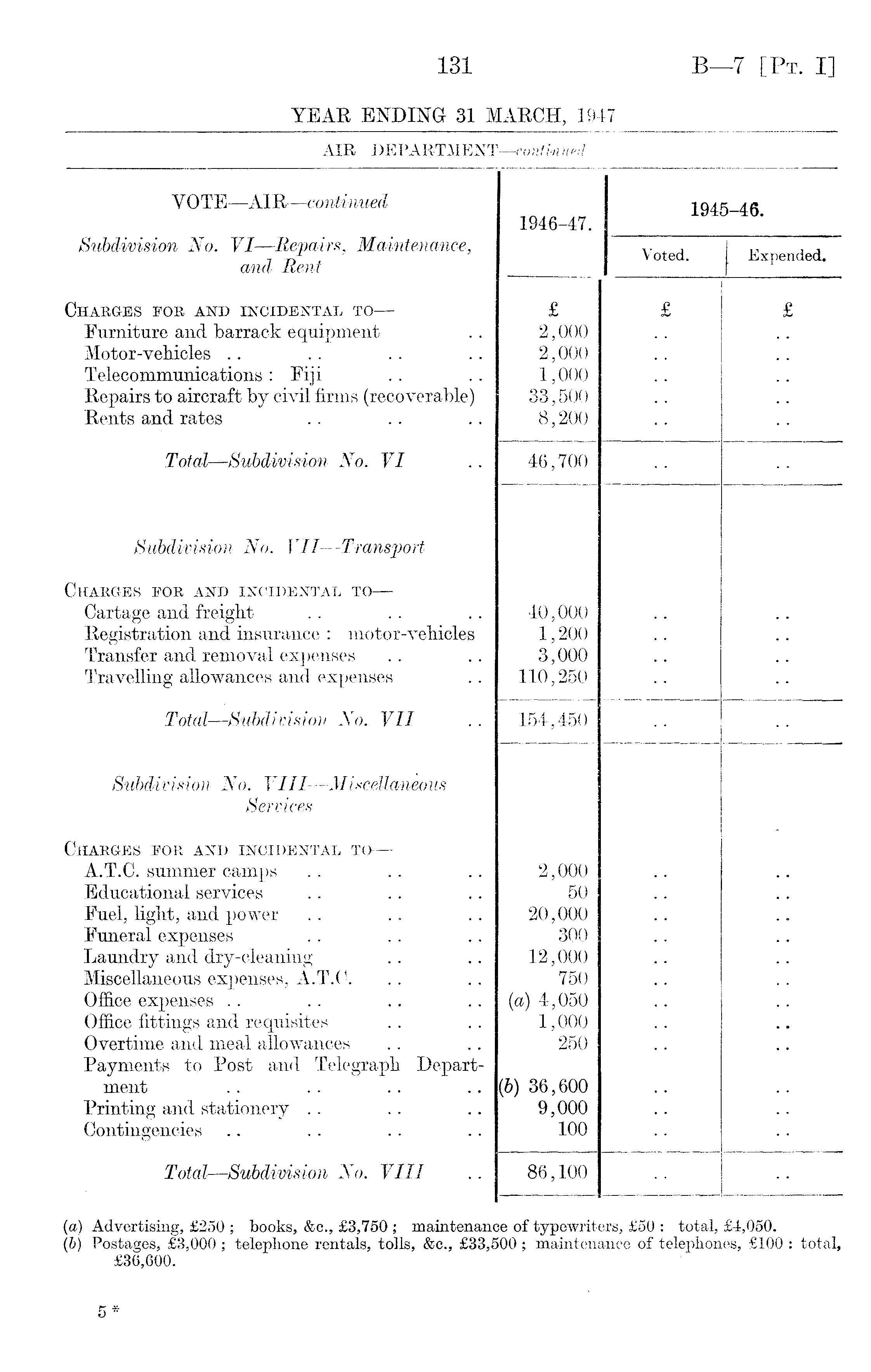V OTE—AIR—continued 1946-47. 1945-46. Subdivision No. VI —Repairs, Maintenance, and Rent Voted. Expended. Charges for and incidental to — Furniture and barrack equipment Motor-vehicles Telecommunications : Fiji Repairs to aircraft by civil firms (recoverable) Rents and rates £ 2,000 2,000 1,000 33,500 8,200 £ £ Total—Subdivision No. VI 46,700 Subdivision No. VII —Transport Charges for and incidental to — Cartage and freight Registration and insurance : motor-vehicles Transfer and removal expenses Travelling allowances and expenses 40,000 1,200 3,000 110,250 Total —Subdivision No. VII 154,450 Subdivision No. VIII —Miscellaneous Services Charges for and incidental to — A.T.C. summer camps .. Educational services Fuel, light, and power Funeral expenses Laundry and dry-cleaning Miscellaneous expenses, A.T.C. Office expenses Office fittings and requisites Overtime and meal allowances Payments to Post and Telegraph Department Printing and stationery Contingencies 2,000 50 20,000 300 12,000 750 (a) 4,050 1,000 250 (6) 36,600 9,000 100 Total —Subdivision No. VIII 86,100