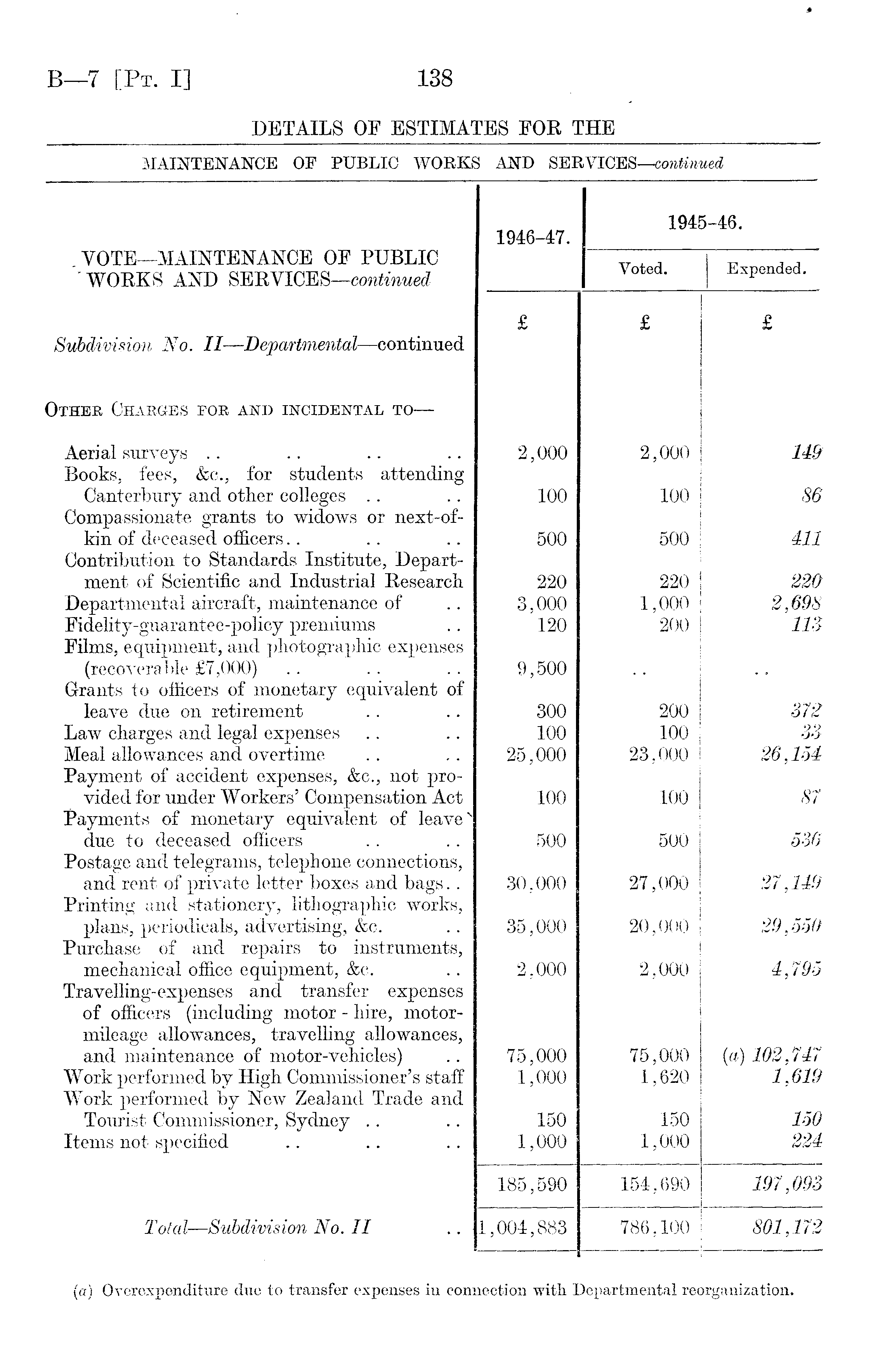 1946-47. 1945-46. VOTE—MAINTENANCE OF PUBLIC "WORKS AND SERVICES—continued v otea. Expended. £ £ £ Subdivision No. II—Departmental—continued Other Charges for and incidental to — Aerial surveys 2,000 2,000 149 Books, fees, &c., for students attending Canterbury and other colleges 100 100 86 Compassionate grants to widows or next-of-kin of deceased officers 500 500 411 Contribution to Standards Institute, Department of Scientific and Industrial Research 220 220 220 Departmental aircraft, maintenance of •3,000 1,000 2,698 Fidelity-guarantee-policy premiums 120 200 113 Films, equipment, and photographic expenses (recoverable £7,000) 9,500 Grants to officers of monetary equivalent of leave due on retirement 300 200 372 Law charges and legal expenses 100 100 33 Meal allowances and overtime 25,000 23,000 26,154 Payment of accident expenses, &c., not provided for under Workers' Compensation Act 100 100 87 Payments of monetary equivalent of leave N due to deceased officers 500 500 536 Postage and telegrams, telephone connections, and rent of private letter boxes and bags.. 30,000 27,000 27,149 Printing and stationery, lithographic works, plans, periodicals, advertising, &c. 35,000 20,000 29,550 Purchase of and repairs to instruments, mechanical office equipment, &c. 2,000 2,000 4,795 Travelling-expenses and transfer expenses of officers (including motor - hire, motormileage allowances, travelling allowances, and maintenance of motor-vehicles) 75,000 75,000 (a) 102,747 Work performed by High Commissioner's staff 1,000 1,620 1,619 Work performed by New Zealand Trade and Tourist Commissioner, Sydney 150 150 150 Items not specified 1,000 1,000 224 185,590 154,690 197,093 Total —Subdivision No. II 1,004,883 786,100 801,172 (a) Overexpenditure due to transfer expenses in connection with I Departmental ret >rganization.