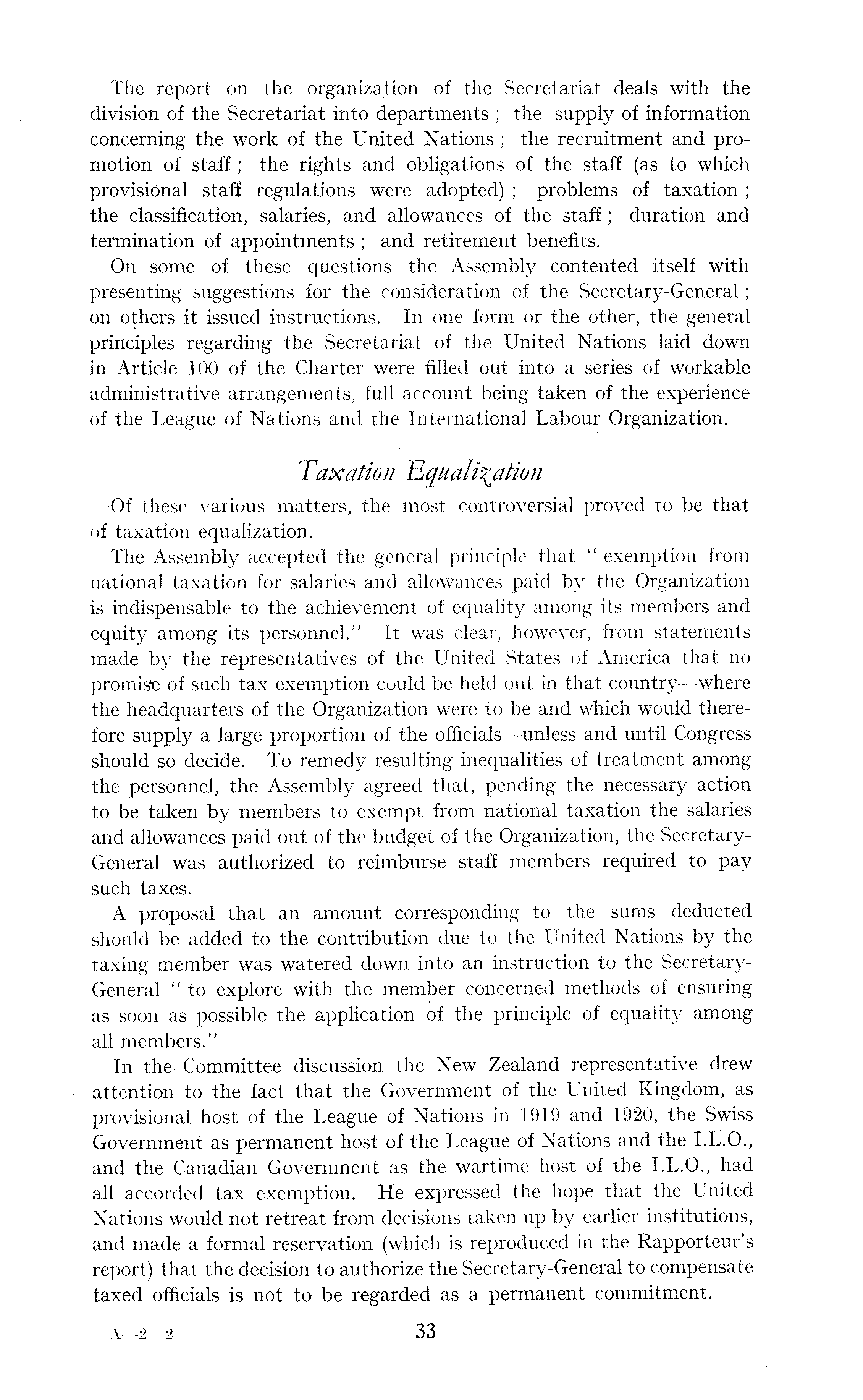The report on the organization of the Secretariat deals with the division of the Secretariat into departments ; the supply of information concerning the work of the United Nations; the recruitment and promotion of staff; the rights and obligations of the staff (as to which provisional staff regulations were adopted) ; problems of taxation; the classification, salaries, and allowances of the staff; duration and termination of appointments ; and retirement benefits. On some of these questions the Assembly contented itself with presenting suggestions for the consideration of the Secretary-General; on others it issued instructions. In one form or the other, the general principles regarding the Secretariat of the United Nations laid down in Article 100 of the Charter were filled out into a series of workable administrative arrangements, full account being taken of the experience of the League of Nations and the International Labour Organization. Taxation Equalisation Of these various matters, the most controversial proved to be that of taxation equalization. The Assembly accepted the general principle that " exemption from national taxation for salaries and allowances paid by the Organization is indispensable to the achievement of equality among its members and equity among its personnel." It was clear, however, from statements made by the representatives of the United States of America that no promise of such tax exemption could be held out in that country—where the headquarters of the Organization were to be and which would therefore supply a large proportion of the officials—unless and until Congress should so decide. To remedy resulting inequalities of treatment among the personnel, the Assembly agreed that, pending the necessary action to be taken by members to exempt from national taxation the salaries and allowances paid out of the budget of the Organization, the SecretaryGeneral was authorized to reimburse staff members required to pay such taxes. A proposal that an amount corresponding to the sums deducted should be added to the contribution due to the United Nations by the taxing member was watered down into an instruction to the SecretaryGeneral " to explore with the member concerned methods of ensuring as soon as possible the application of the principle of equality among all members." In the- Committee discussion the New Zealand representative drew attention to the fact that the Government of the United Kingdom, as provisional host of the League of Nations in 1919 and 1920, the Swiss Government as permanent host of the League of Nations and the 1.L.0., and the Canadian Government as the wartime host of the 1.L.0., had all accorded tax exemption. He expressed the hope that the United Nations would not retreat from decisions taken up by earlier institutions, and made a formal reservation (which is reproduced in the Rapporteur's report) that the decision to authorize the Secretary-General to compensate taxed officials is not to be regarded as a permanent commitment.