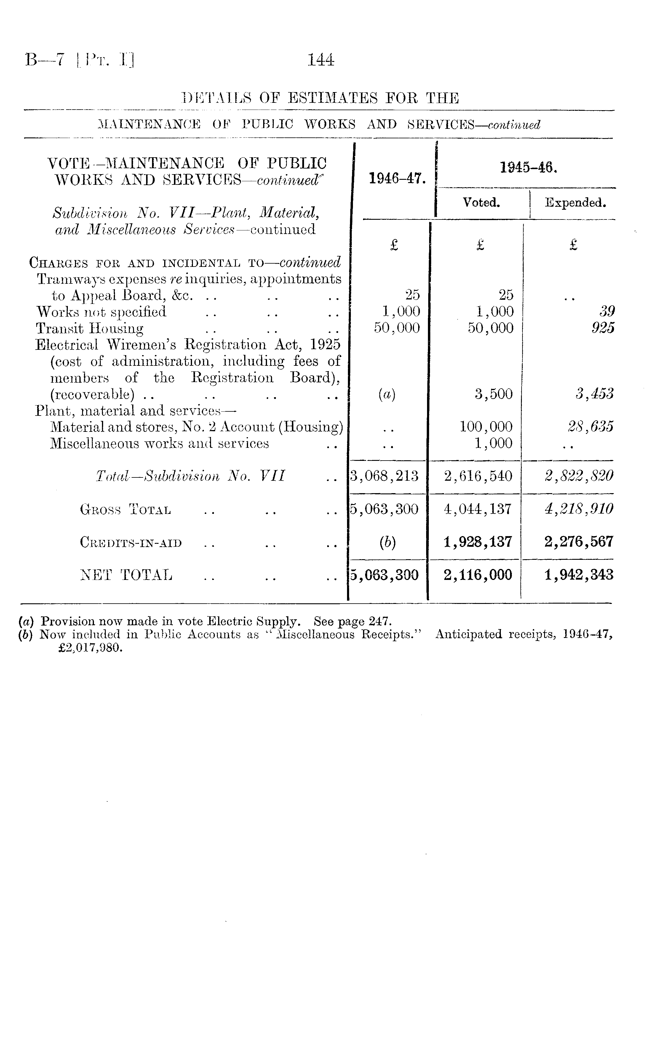 (a) Provision now made in vote Electric Supply. See page 247. (b) Now included in Public Accounts as " Miscellaneous Receipts." Anticipated receipts, 1946-47, £2,017,980.