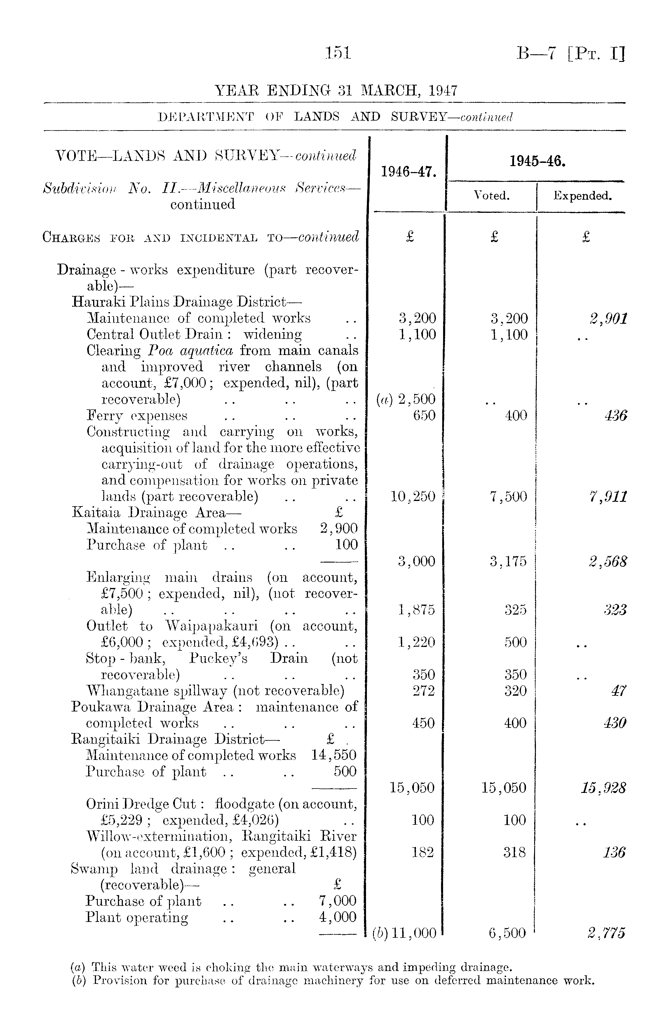 VOTE—LANDS AND SURVEY —continued 1946-47. 1945-46. Subdivision No. II. —Miscellaneous Services — continued Voted. Expended. Charges for and incidental to —continued £ £ £ Drainage - works expenditure (part recoverable) — Hauraki Plains Drainage District — Maintenance of completed works Central Outlet Drain : widening Clearing Poa aquatica from main canals and improved river channels (on account, £7,000; expended, nil), (part recoverable) Ferry expenses Constructing and carrying on works, acquisition of land for the more effective carrying-out of drainage operations, and compensation for works on private lands (part recoverable) Kaitaia Drainage Area— £ Maintenance of completed works 2,900 Purchase of plant .. .. 100 Enlarging main drains (on account, £7,500; expended, nil), (not recoverable) Outlet to Waipapakauri (on account, £6,000; expended, £4,693) Stop - bank, Puckey's Drain (not recoverable) * Whangatane spillway (not recoverable) Poukawa Drainage Area : maintenance of completed works Rangitaiki Drainage District — £ . Maintenance of completed works 14,550 Purchase of plant .. .. 500 3,200 1,100 (а) 2,500 650 10,250 3,000 1,875 1,220 350 272 450 15,050 100 182 (б)11,000 3,200 1,100 400 7,500 3,175 325 500 350 320 400 15,050 100 318 6,500, 2,901 436 7,911 2,568 323 47 430 15,928 136 2,775 Orini Dredge Cut: floodgate (on account, £5,229 ; expended, £4,026) Willow-extermination, Eangitaiki River (on account, £1,600 ; expended, £1,418) Swamp land drainage: general (recoverable) — £ Purchase of plant .. .. 7,000 Plant operating .. .. 4,000