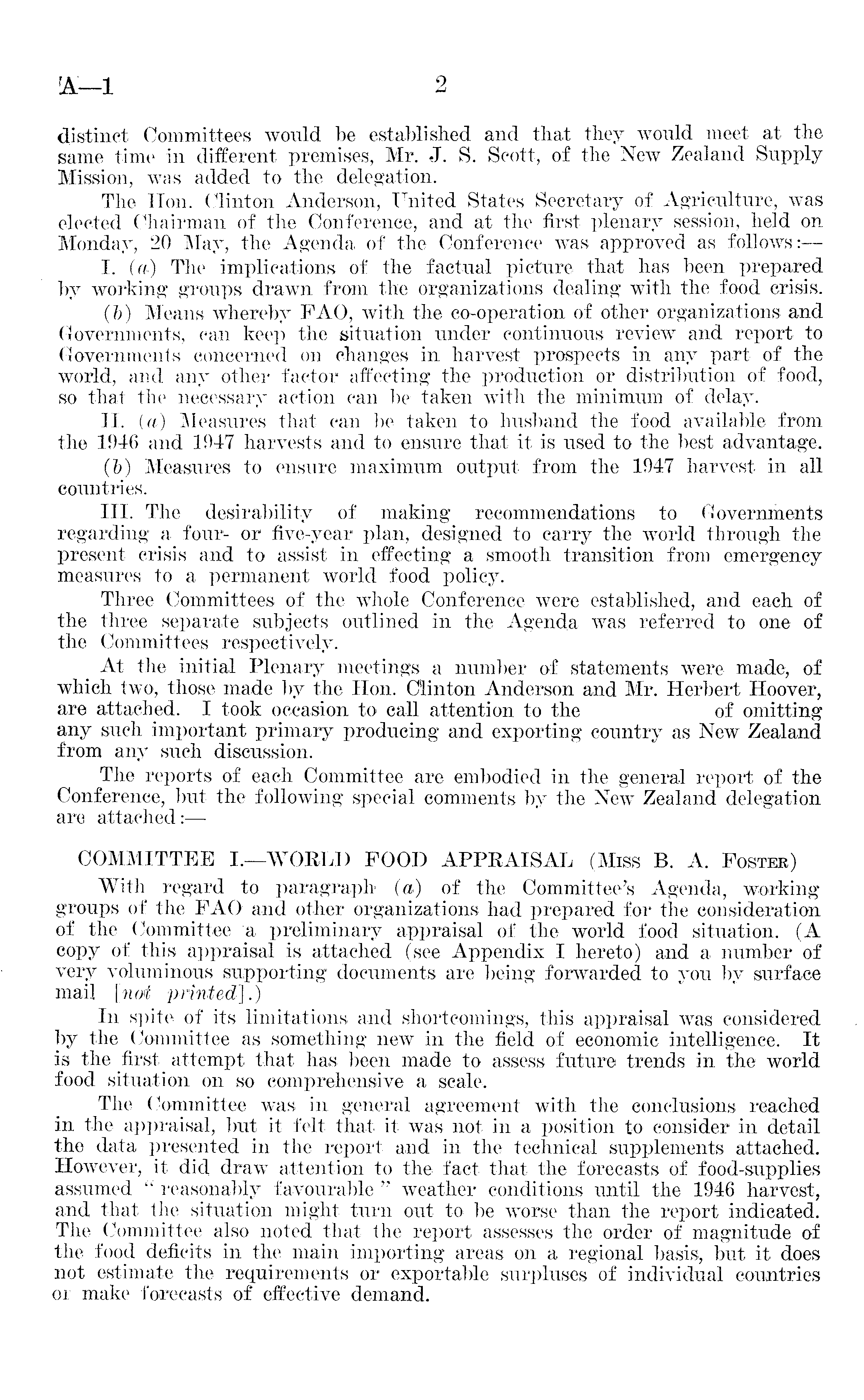 distinct Committees would be established and that they would meet at the same time in different premises, Mr. J. S. Scott, of the New Zealand Supply Mission, was added to the delegation. The Hon. Clinton Anderson, United States Secretary of Agriculture, was elected Chairman of the Conference, and at the first plenary session, held on Monday, 20 May, the Agenda of the Conference was approved as follows: I. (a) The implications of the factual picture that has been prepared by working groups drawn from the organizations dealing with the food crisis. (&) Means whereby FAO, with the co-operation of other organizations and Governments, can keep the situation under continuous review and report to Governments concerned on changes in harvest prospects in any part of the world, and any other factor affecting the production or distribution of food, so that the necessary action can be taken with the minimum of delay. 11. (a) Measures that can be taken to husband the food available from the 1946 and 1947 harvests and to ensure that it is used to the best advantage. (b) Measures to ensure maximum output from the 1947 harvest in all countries. 111. The desirability of making recommendations to Governments regarding a four- or five-year plan, designed to carry the world through the present crisis and to assist in effecting a smooth transition from emergency measures to a permanent world food policy. Three Committees of the whole Conference were established, and each of the three separate subjects outlined in the Agenda was referred to one of the Committees respectively. At the initial Plenary meetings a number of statements were made, of which two, those made by the Hon. Clinton Anderson and Mr. Herbert Hoover, are attached. I took occasion to call attention to the of omitting any such important primary producing and exporting country as New Zealand from any such discussion. The reports of each Committee are embodied in the general report of the Conference, but the following special comments by the New Zealand delegation are attached:— COMMITTEE I.—WOULD FOOD APPRAISAL (Miss B. A. Foster) With regard to paragraph (a) of the Committee's Agenda, working groups of the FAO and other organizations had prepared for the consideration of the Committee a preliminary appraisal of the world food situation. (A copy of this appraisal is attached (see Appendix I hereto) and a number of very voluminous supporting documents are being forwarded to you by surface mail [noi printed].) In spite of its limitations and shortcomings, this appraisal was considered by the Committee as something new in the field of economic intelligence. It is the first attempt that has been made to assess future trends in the world food situation on so comprehensive a scale. The Committee was in general agreement with the conclusions reached in the appraisal, but it felt that it was not in a position to consider in detail the data presented in the report and in the technical supplements attached. However, it did draw attention to the fact that the forecasts of food-supplies assumed " reasonably favourable " weather conditions until the 1946 harvest, and that the situation might turn out to be Worse than the report indicated. The Committee also noted that the report assesses the order of magnitude of the food deficits in the main importing areas on a regional basis, but it does not estimate the requirements or exportable surpluses of individual countries or make forecasts of effective demand.