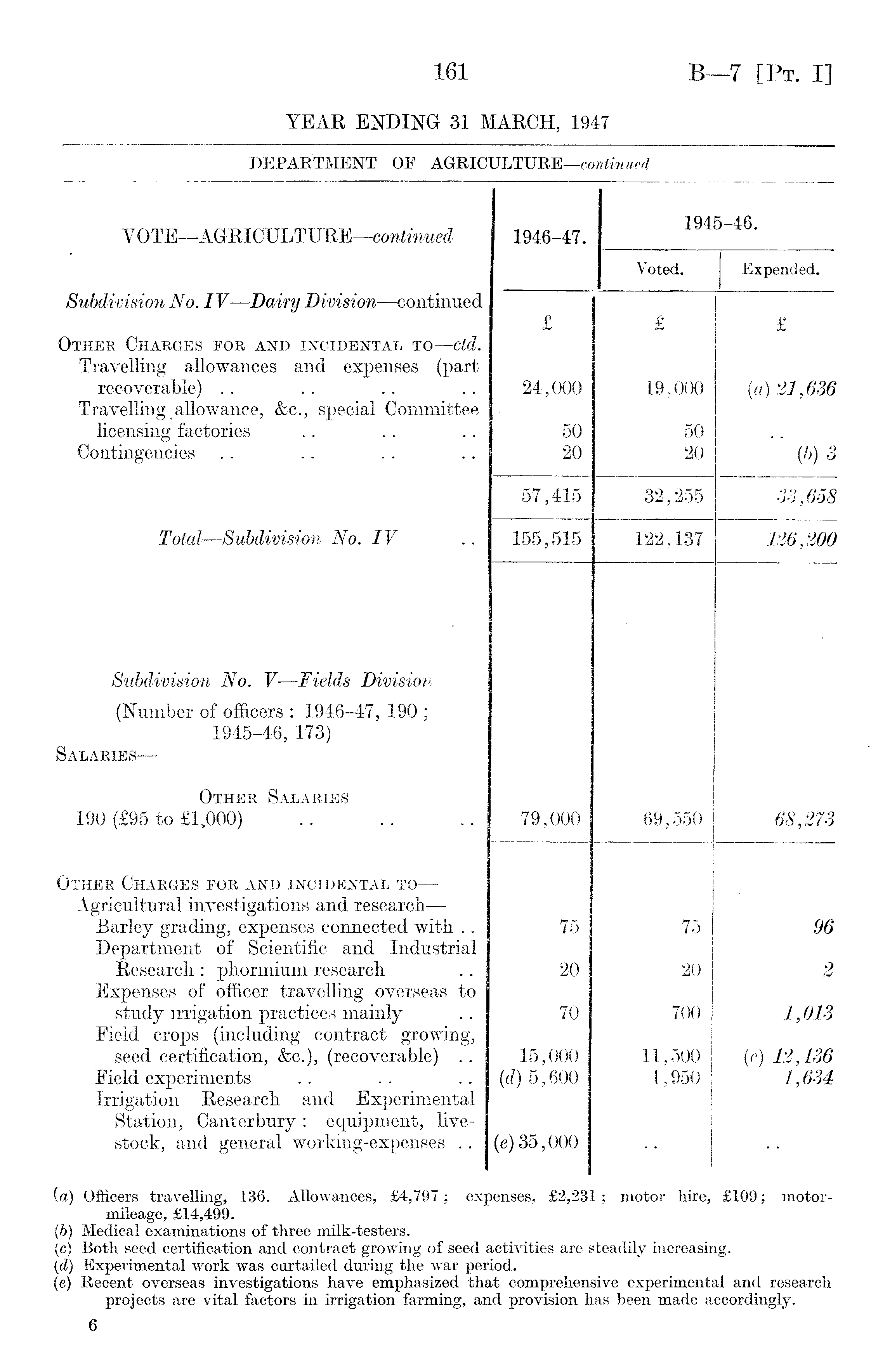 (a) Officers travelling, 136. Allowances, £4,797; expenses, £2,231 ; motor hire, £109; motormileage, £14,499. (b) Medical examinations of three milk-testers. (c) Both seed certification and contract growing of seed activities are steadily increasing. (d) Experimental work was curtailed during the war period. (e) Recent overseas investigations have emphasized that comprehensive experimental and research projects are vital factors in irrigation farming, and provision has been made accordingly. 6