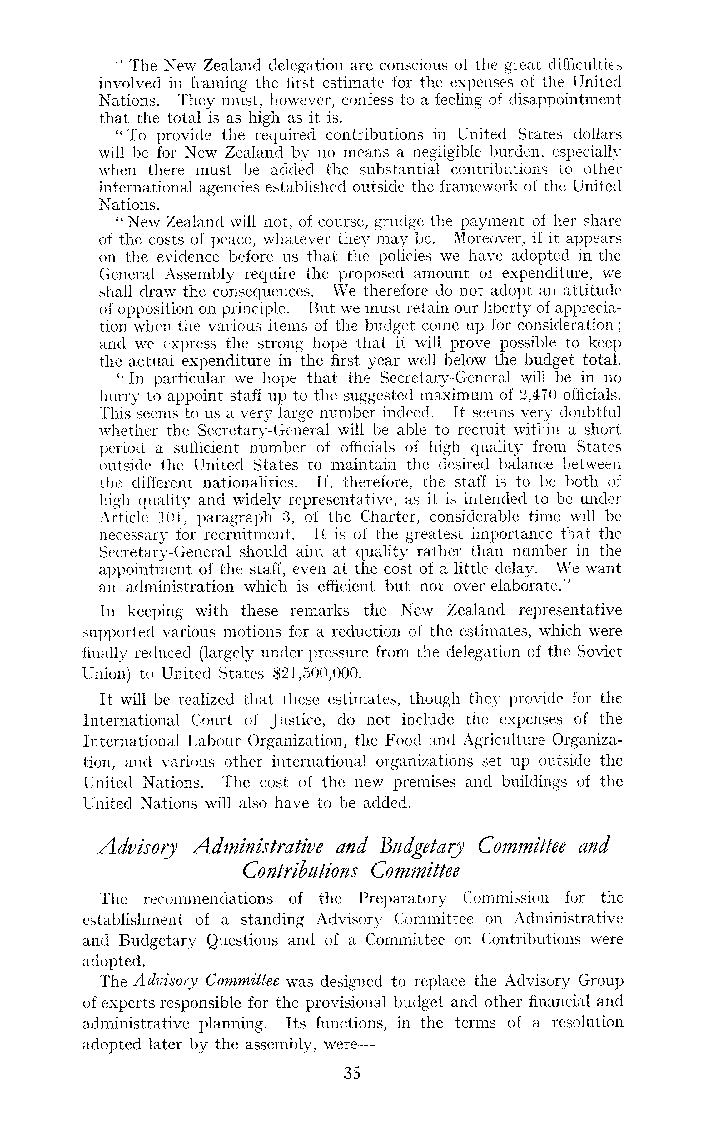 " The New Zealand delegation are conscious of the great difficulties involved in framing the first estimate for the expenses of the United Nations. They must, however, confess to a feeling of disappointment that the total is as high as it is. "To provide the required contributions in United States dollars will be for New Zealand by no means a negligible burden, especially when there must be added the substantial contributions to other international agencies established outside the framework of the United Nations. "New Zealand will not, of course, grudge the payment of her share of the costs of peace, whatever they may be. Moreover, if it appears on the evidence before us that the policies we have adopted in the General Assembly require the proposed amount of expenditure, we shall draw the consequences. We therefore do not adopt an attitude of opposition on principle. But we must retain our liberty of appreciation when the various items of the budget come up for consideration; and we express the strong hope that it will prove possible to keep the actual expenditure in the first year well below the budget total. " In particular we hope that the Secretary-General will be in no hurry to appoint staff up to the suggested maximum of 2,470 officials. This seems to us a very large number indeed. It seems very doubtful whether the Secretary-General will be able to recruit within a short period a sufficient number of officials of high quality from States outside the United States to maintain the desired balance between the different nationalities. If, therefore, the staff is to be both of high quality and widely representative, as it is intended to be under Article 101, paragraph 3, of the Charter, considerable time will be necessary for recruitment. It is of the greatest importance that the Secretary-General should aim at quality rather than number in the appointment of the staff, even at the cost of a little delay. We want an administration which is efficient but not over-elaborate." In keeping with these remarks the New Zealand representative supported various motions for a reduction of the estimates, which were finally reduced (largely under pressure from the delegation of the Soviet Union) to United States $21,500,000. It will be realized that these estimates, though they provide for the International Court of Justice, do not include the expenses of the International Labour Organization, the Food and Agriculture Organization, and various other international organizations set up outside the United Nations. The cost of the new premises and buildings of the United Nations will also have to be added. Advisory Administrative and budgetary Committee and Contributions Committee The recommendations of the Preparatory Commission for the establishment of a standing Advisory Committee on Administrative and Budgetary Questions and of a Committee on Contributions were adopted. The Advisory Committee was designed to replace the Advisory Group of experts responsible for the provisional budget and other financial and administrative planning. Its functions, in the terms of a resolution adopted later by the assembly, were —