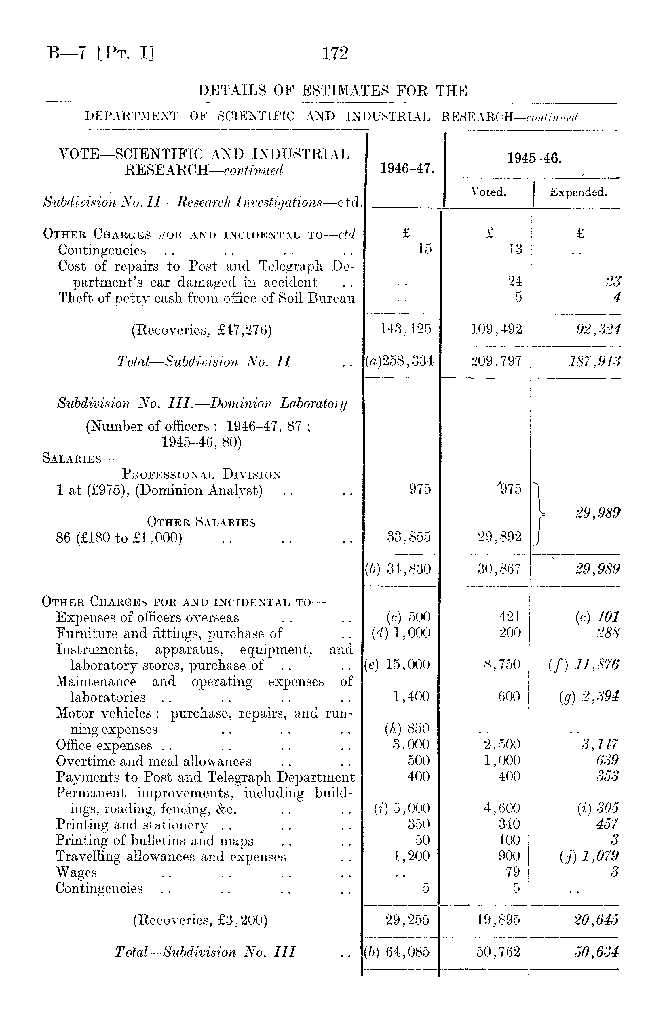 VOTE—SCIENTIFIC AND INDUSTRIAL RESEARCH —continued 1946-47. 1945-46. Subdivision No. II —Research Investigations—ctd. Voted. Expended. Other Charges for and incidental to —ctd Contingencies Cost of repairs to Post and Telegraph. Department's car damaged in accident Theft of petty cash from office of Soil Bureau £ 15 £ 13 24 5 £ 23 4 (Recoveries, £47,276) 143,125 109,492 92,324 Total —Subdivision No. II (a)258,334 209,797 187,913 Subdivision No. Ill:—Dominion Laboratory (Number of officers : 1946-47, 87 ; 1945-46, 80) Salaries — Professional Division 1 at (£975), (Dominion Analyst) 975 '975 1 L / Other Salaries 86 (£180 to £1,000) 33,855 29,892 29,989 (6) 34,830 30,867 29,989 Other Charges for and incidental to — Expenses of officers overseas Furniture and fittings, purchase of Instruments, apparatus, equipment, and laboratory stores, purchase of .. Maintenance and operating expenses of laboratories Motor vehicles : purchase, repairs, and running expenses Office expenses Overtime and meal allowances Payments to Post and Telegraph Department Permanent improvements, including buildings, roading, fencing, &c. Printing and stationery Printing of bulletins and maps Travelling allowances and expenses Wages Contingencies (c) 500 (d) 1,000 (e) 15,000 1,400 (ft) 850 3,000 500 400 (i) 5,000 350 50 1,200 5 421 200 8,750 600 2,500 1,000 400 4,600 340 100 900 79 5 (c) 101 288 (/) U,876 (9)2,394 3,147 639 353 (i) 305 457 3 (j) 1,079 3 (Recoveries, £3,200) 29,255 19,895 20,645 Total—Subdivision No. Ill (6) 64,085 50,762 50,634