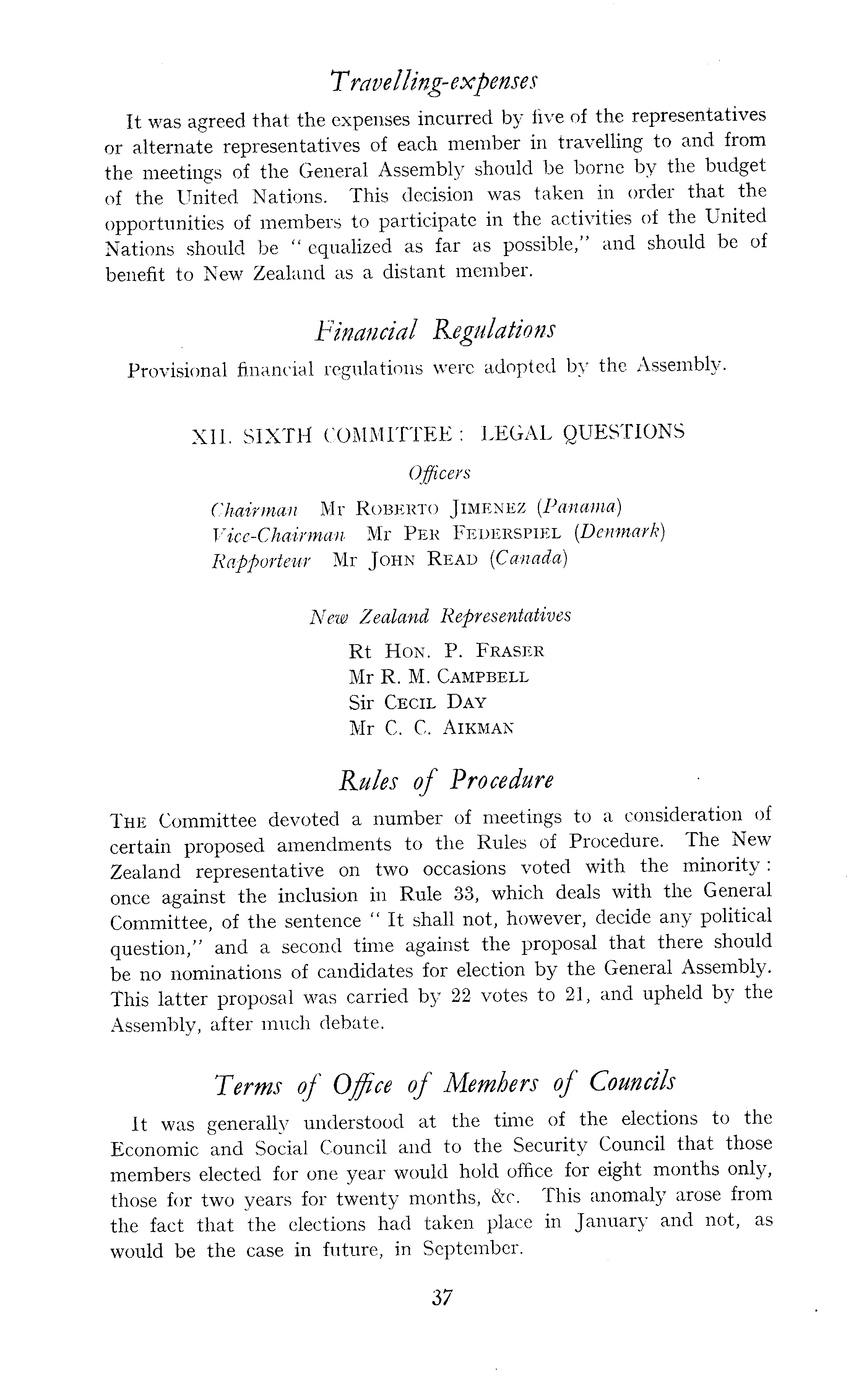 Travelling-expenses It was agreed that the expenses incurred by five of the representatives or alternate representatives of each member in travelling to and from the meetings of the General Assembly should be borne by the budget of the United Nations. This decision was taken in order that the opportunities of members to participate in the activities of the United Nations should be " equalized as far as possible," and should be of benefit to New Zealand as a distant member. Financial Regulations Provisional financial regulations were adopted by the Assembly. XII. SIXTH COMMITTEE : LEGAL QUESTIONS Officers Chairman Mr Roberto Jimenez (Panama) Vice-Chairman Mr Per Federspiel (Denmark) Rapporteur Mr John Read (Canada) New Zealand Representatives Rt Hon. P. Fraser Mr R. M. Campbell Sir Cecil Day Mr C. C. Aikman Rules of Procedure The Committee devoted a number of meetings to a consideration of certain proposed amendments to the Rules of Procedure. The New Zealand representative on two occasions voted with the minority : once against the inclusion in Rule 33, which deals with the General Committee, of the sentence " It shall not, however, decide any political question," and a second time against the proposal that there should be no nominations of candidates for election by the General Assembly. This latter proposal was carried by 22 votes to 21, and upheld by the Assembly, after much debate. Terms of Office of Members of Councils It was generally understood at the time of the elections to the Economic and Social Council and to the Security Council that those members elected for one year would hold office for eight months only, those for two years for twenty months, &c. This anomaly arose from the fact that the elections had taken place in January and not, as would be the case in future, in September.