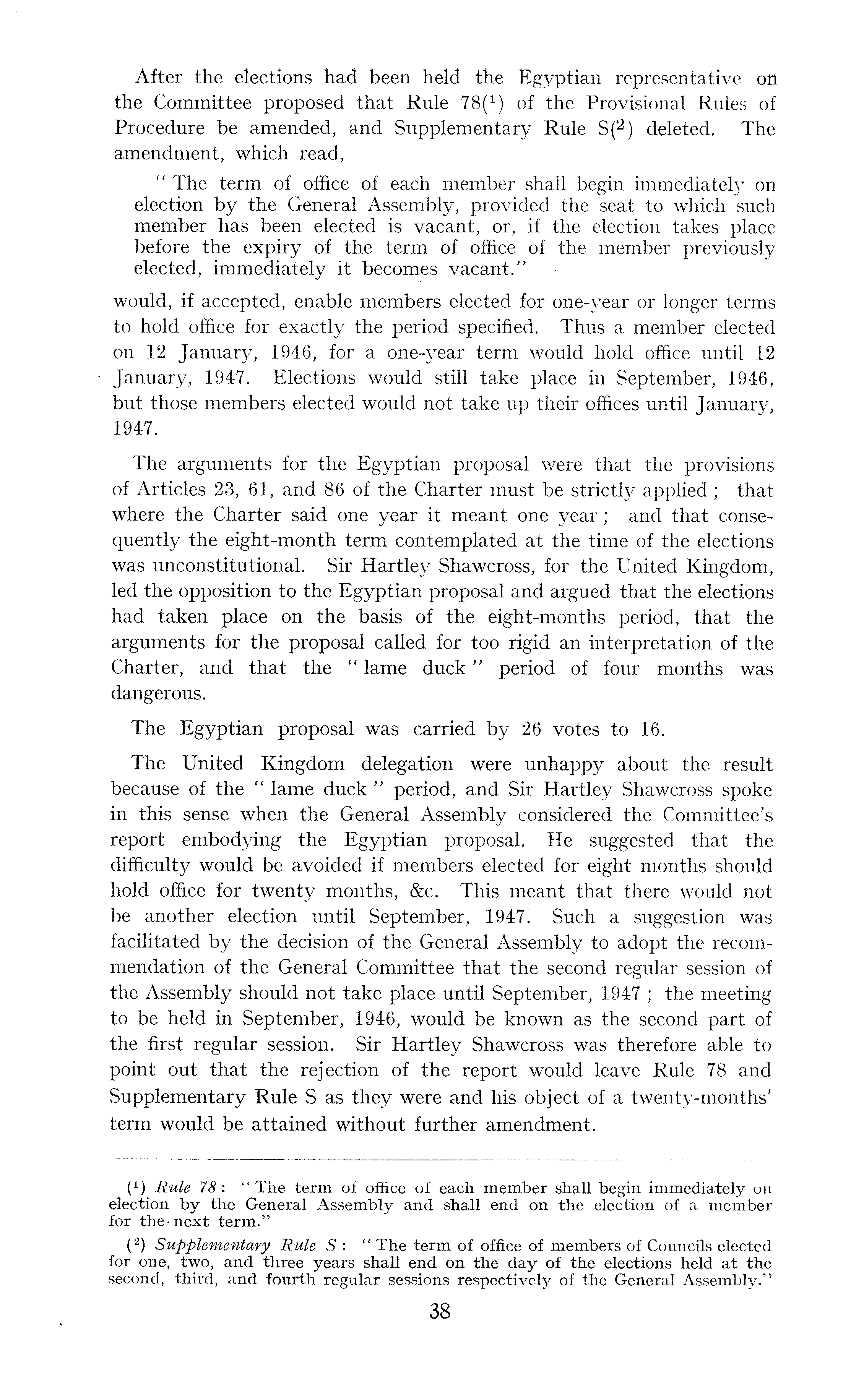 After the elections had been held the Egyptian representative on the Committee proposed that Rule 78( 1 ) of the Provisional Rules of Procedure be amended, and Supplementary Rule S( 2 ) deleted, The amendment, which read, " The term of office of each member shall begin immediately on election by the General Assembly, provided the seat to which such member has been elected is vacant, or, if the election takes place before the expiry of the term of office of the member previously elected, immediately it becomes vacant." would, if accepted, enable members elected for one-year or longer terms to hold office for exactly the period specified. Thus a member elected on 12 January, 1946, for a one-year term would hold office until 12 January, 1947. Elections would still take place in September, 1946, but those members elected would not take up their offices until January, 1947. The arguments for the Egyptian proposal were that the provisions of Articles 23, 61, and 86 of the Charter must be strictly applied; that where the Charter said one year it meant one year; and that consequently the eight-month term contemplated at the time of the elections was unconstitutional. Sir Hartley Shawcross, for the United Kingdom, led the opposition to the Egyptian proposal and argued that the elections had taken place on the basis of the eight-months period, that the arguments for the proposal called for too rigid an interpretation of the Charter, and that the " lame duck" period of four months was dangerous. The Egyptian proposal was carried by 26 votes to 16. The United Kingdom delegation were unhappy about the result because of the " lame duck " period, and Sir Hartley Shawcross spoke in this sense when the General Assembly considered the Committee's report embodying the Egyptian proposal. He suggested that the difficulty would be avoided if members elected for eight months should hold office for twenty months, &c. This meant that there would not be another election until September, 1947! Such a suggestion was facilitated by the decision of the General Assembly to adopt the recommendation of the General Committee that the second regular session of the Assembly should not take place until September, 1947 ; the meeting to be held in September, 1946, would be known as the second part of the first regular session. Sir Hartley Shawcross was therefore able to point out that the rejection of the report would leave Rule 78 and Supplementary Rule S as they were and his object of a twenty-months' term would be attained without further amendment.