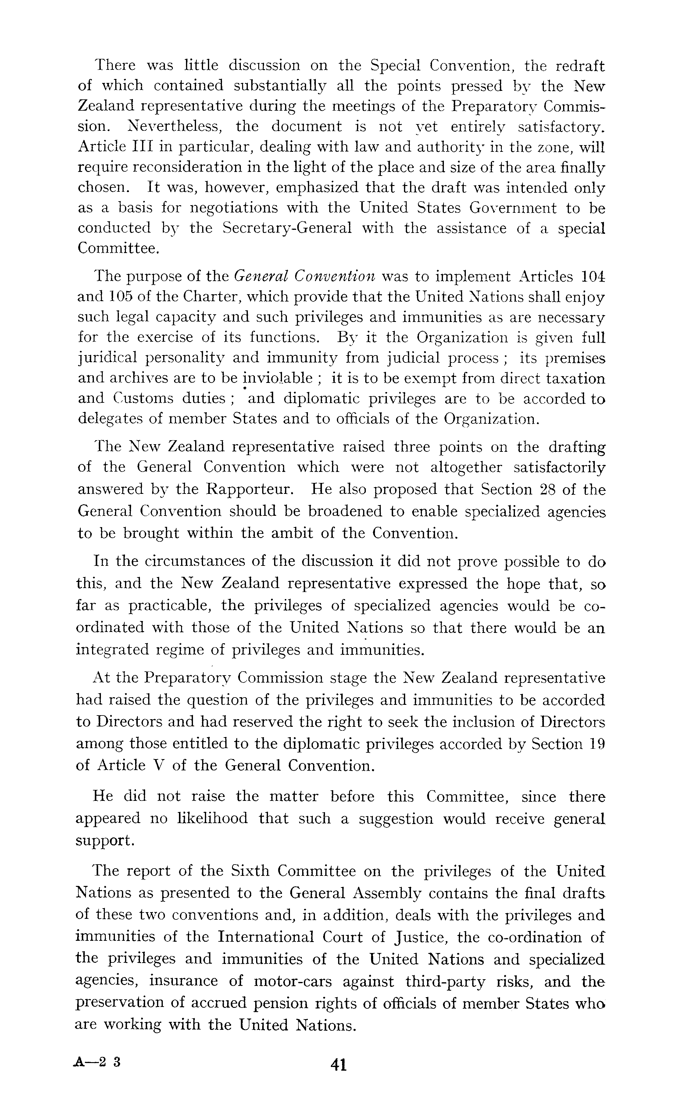 There was little discussion on the Special Convention, the redraft of which contained substantially all the points pressed by the New Zealand representative during the meetings of the Preparatory Commission. Nevertheless, the document is not yet entirely satisfactory. Article 111 in particular, dealing with law and authority in the zone, will require reconsideration in the light of the place and size of the area finally chosen. It was, however, emphasized that the draft was intended only as a basis for negotiations with the United States Government to be conducted by the Secretary-General with the assistance of a special Committee. The purpose of the General Convention was to implement Articles 104 and 105 of the Charter, which provide that the United Nations shall enjoy such legal capacity and such privileges and immunities as are necessary for the exercise of its functions. By it the Organization is given full juridical personality and immunity from judicial process ; its premises and archives are to be inviolable ; it is to be exempt from direct taxation and Customs duties ; and diplomatic privileges are to be accorded to delegates of member States and to officials of the Organization. The New Zealand representative raised three points on the drafting of the General Convention which were not altogether satisfactorily answered by the Rapporteur. He also proposed that Section 28 of the General Convention should be broadened to enable specialized agencies to be brought within the ambit of the Convention. In the circumstances of the discussion it did not prove possible to do this, and the New Zealand representative expressed the hope that, so far as practicable, the privileges of specialized agencies would be coordinated with those of the United Nations so that there would be an integrated regime of privileges and immunities. At the Preparatory Commission stage the New Zealand representative had raised the question of the privileges and immunities to be accorded to Directors and had reserved the right to seek the inclusion of Directors among those entitled to the diplomatic privileges accorded by Section 19 of Article V of the General Convention. He did not raise the matter before this Committee, since there appeared no likelihood that such a suggestion would receive general support. The report of the Sixth Committee on the privileges of the United Nations as presented to the General Assembly contains the final drafts of these two conventions and, in addition, deals with the privileges and immunities of the International Court of Justice, the co-ordination of the privileges and immunities of the United Nations and specialized agencies, insurance of motor-cars against third-party risks, and the preservation of accrued pension rights of officials of member States who are working with the United Nations.