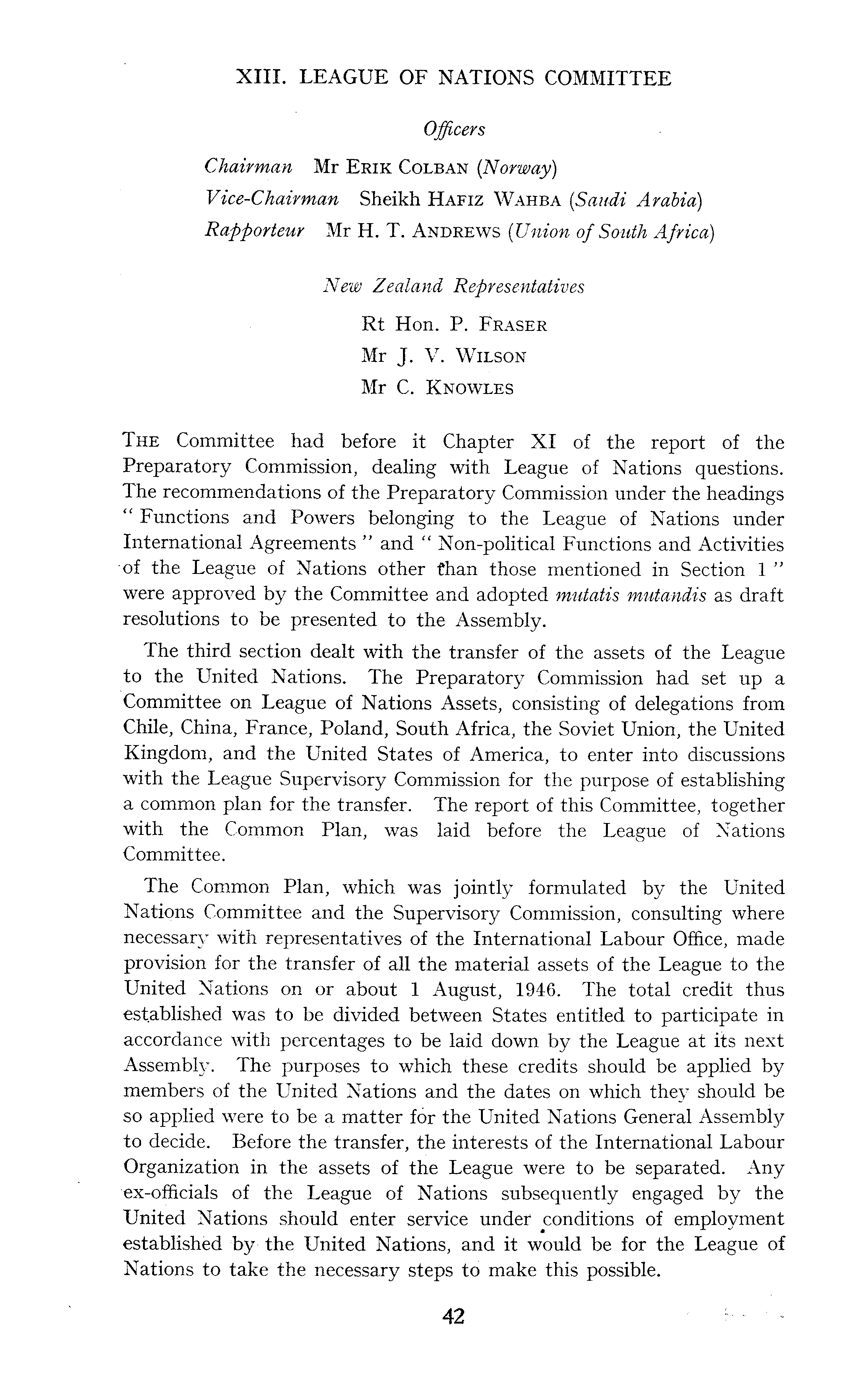 XIII. LEAGUE OF NATIONS COMMITTEE Officers Chairman Mr Erik Colban (Norway) Vice-Chairman Sheikh Hafiz Wahba (Saudi Arabia) Rapporteur Mr H. T. Andrews (Union of South Africa) New Zealand Representatives Rt Hon. P. Fraser Mr J. V. Wilson Mr C. Knowles The Committee had before it Chapter XI of the report of the Preparatory Commission, dealing with League of Nations questions. The recommendations of the Preparatory Commission under the headings " Functions and Powers belonging to the League of Nations under International Agreements " and " Non-political Functions and Activities of the League of Nations other than those mentioned in Section 1 " were approved by the Committee and adopted mutatis mutandis as draft resolutions to be presented to the Assembly. The third section dealt with the transfer of the assets of the League to the United Nations. The Preparatory Commission had set up a Committee on League of Nations Assets, consisting of delegations from Chile, China, France, Poland, South Africa, the Soviet Union, the United Kingdom, and the United States of America, to enter into discussions with the League Supervisory Commission for the purpose of establishing a common plan for the transfer. The report of this Committee, together with the Common Plan, was laid before the League of Nations Committee. The Common Plan, which was jointly formulated by the United Nations Committee and the Supervisory Commission, consulting where necessary with representatives of the International Labour Office, made provision for the transfer of all the material assets of the League to the United Nations on or about 1 August, 1946. The total credit thus established was to be divided between States entitled to participate in accordance with percentages to be laid down by the League at its next Assembly. The purposes to which these credits should be applied by members of the United Nations and the dates on which they should be so applied were to be a matter for the United Nations General Assembly to decide. Before the transfer, the interests of the International Labour Organization in the assets of the League were to be separated. Any ex-officials of the League of Nations subsequently engaged by the United Nations should enter service under conditions of employment established : by the United Nations, and it would be for the League of Nations to take the necessary steps to make this possible.
