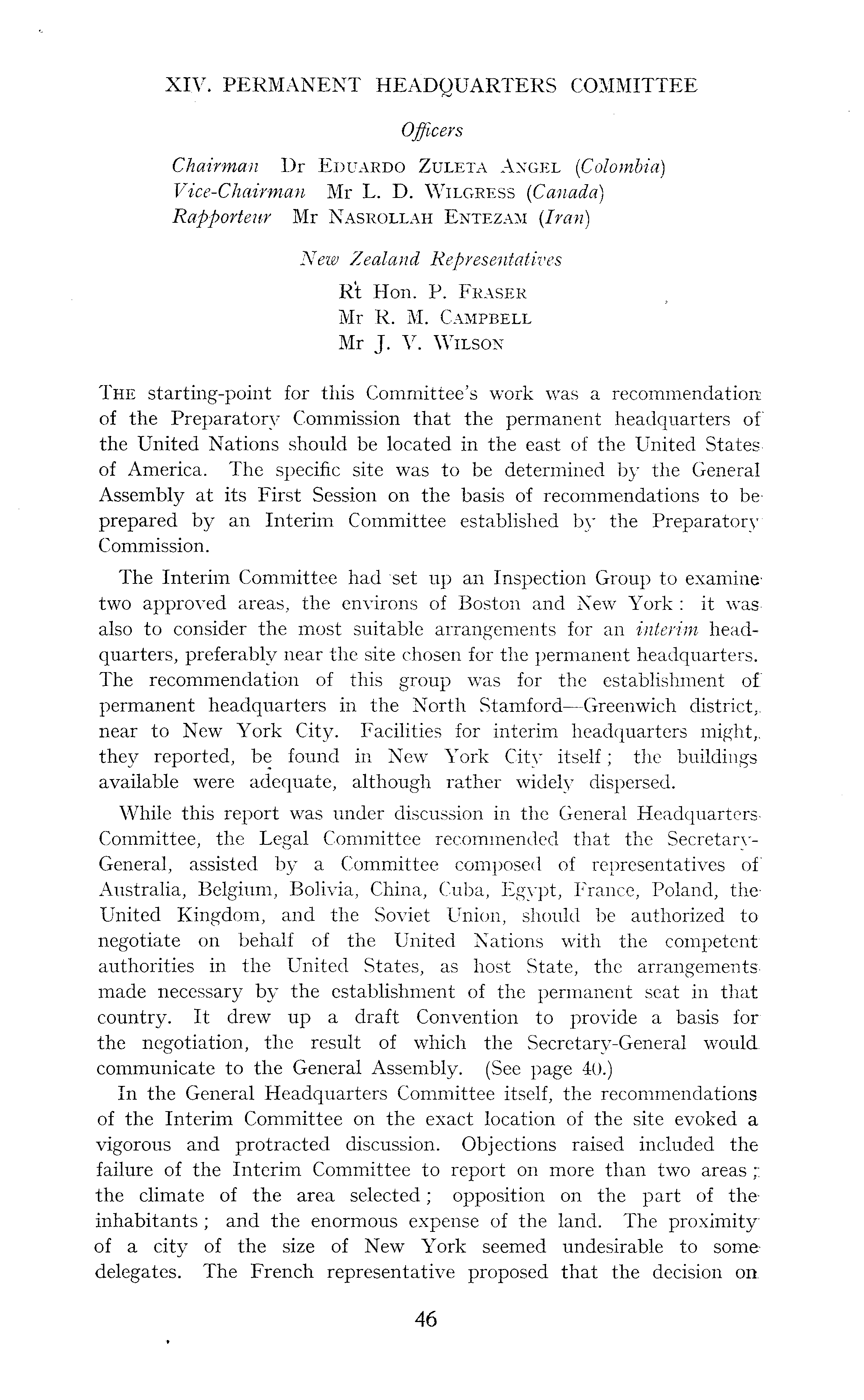 XIV. PERMANENT HEADQUARTERS COMMITTEE Officers Chairman Dr Eduardo Zuleta Angel (Colombia) Vice-Chairman Mr L. D. Wilgress (Canada) Rapporteur Mr Nasrollah Entezam (Iran) New Zealand Representatives Rt Hon. P. Fraser Mr R. M. Campbell Mr J. V. Wilson The starting-point for this Committee's work was a recommendation of the Preparatory Commission that the permanent headquarters of the United Nations should be located in the east of the United States of America. The specific site was to be determined by the General Assembly at its First Session on the basis of recommendations to be prepared by an Interim Committee established by the PreparatoryCommission. The Interim Committee had set up an Inspection Group to examinetwo approved areas, the environs of Boston and New York: it wasN also to consider the most suitable arrangements for an interim headquarters, preferably near the site chosen for the permanent headquarters. The recommendation of this group was for the establishment of permanent headquarters in the North Stamford —Greenwich district,, near to New York City. Facilities for interim headquarters might,, they reported, be found in New York City itself; the buildings, available were adequate, although rather widely dispersed. While this report was under discussion in the General HeadquartersCommittee, the Legal Committee recommended that the SecretaryGeneral, assisted by a Committee composed of representatives of Australia, Belgium, Bolivia, China, Cuba, Egypt, France, Poland, the United Kingdom, and the Soviet Union, should be authorized tonegotiate on behalf of the United Nations with the competent authorities in the United States, as host State, the arrangementsmade necessary by the establishment of the permanent seat in that country. It drew up a draft Convention to provide a basis for the negotiation, the result of which the Secretary-General would communicate to the General Assembly. (See page 40.) In the General Headquarters Committee itself, the recommendations of the Interim Committee on the exact location of the site evoked a vigorous and protracted discussion. Objections raised included the failure of the Interim Committee to report on more than two areas ; the climate of the area selected; opposition on the part of the inhabitants; and the enormous expense of the land. The proximity of a city of the size of New York seemed undesirable to some delegates. The French representative proposed that the decision on
